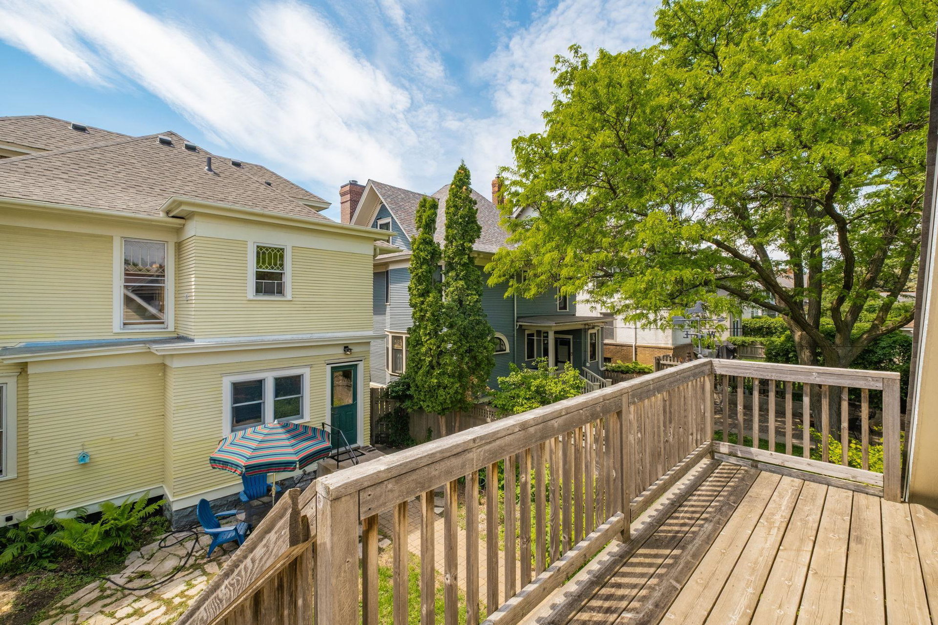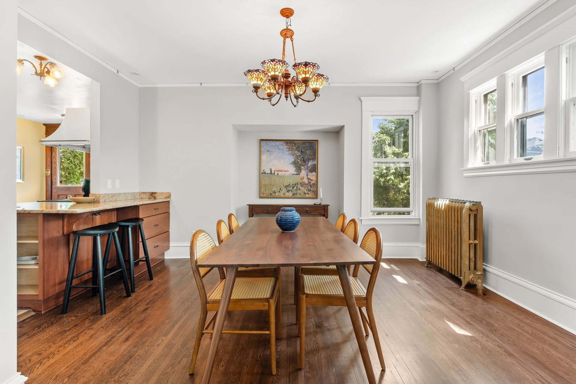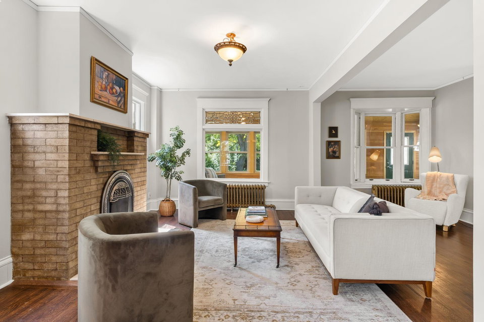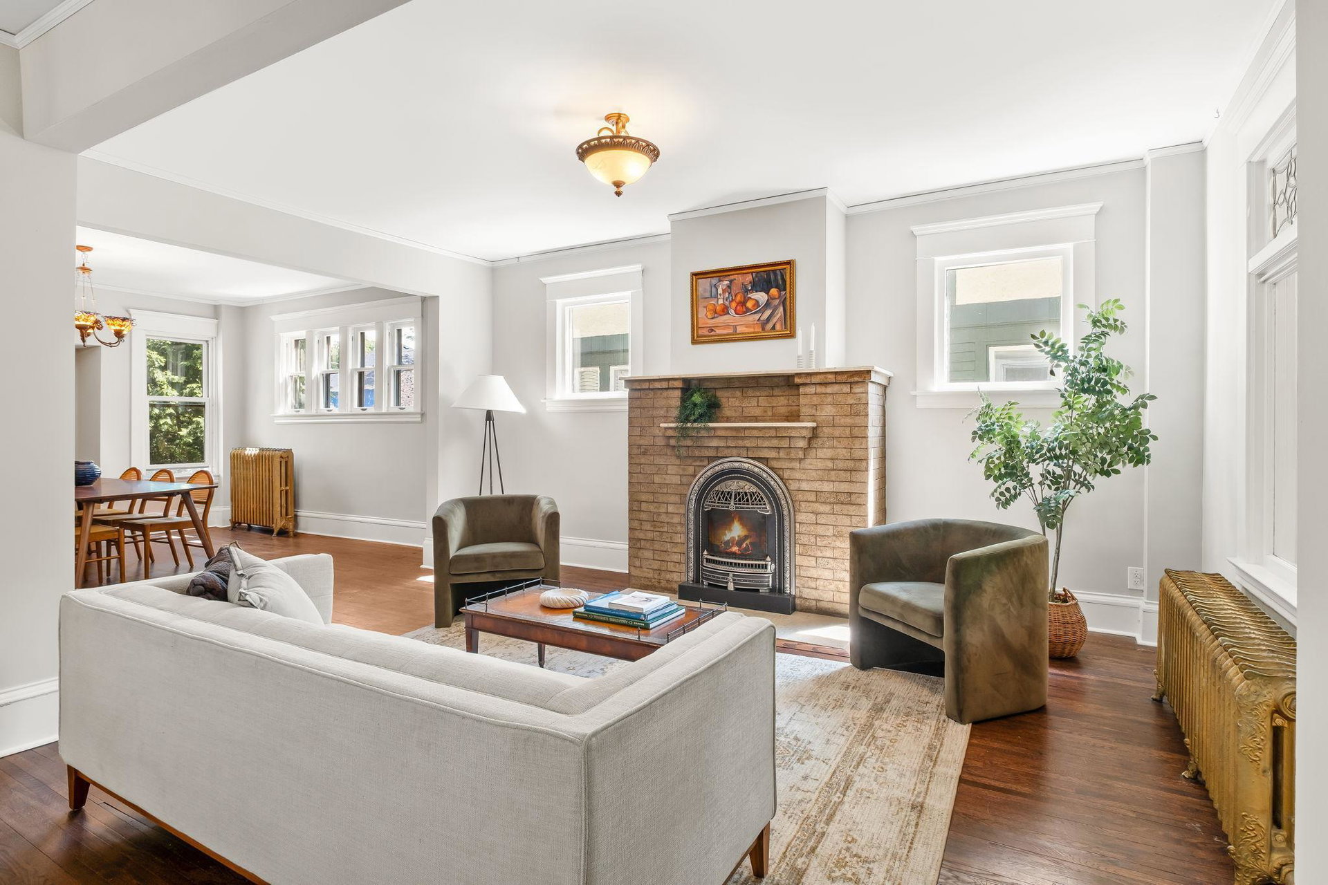 As you approach the property, you’ll be greeted by an inviting front porch, perfect for relaxing and enjoying the neighborhood. Stepping inside, an entryway leads you into the living room. This generous size room is anchored by a handsome fireplace. From the living room, you’ll find the dining room filled with natural light, ideal for both everyday meals and entertaining. Situated at the rear of the home, the thoughtfully remodeled kitchen boasts a layout that can handle multiple cooks in the kitchen. The home’s four bedrooms are all conveniently situated on the upper level. The third floor is unfinished and awaits your vision. The home also offers the convenience of three bathrooms. For parking and additional storage, there is a two-stall detached garage with extra space located above it.