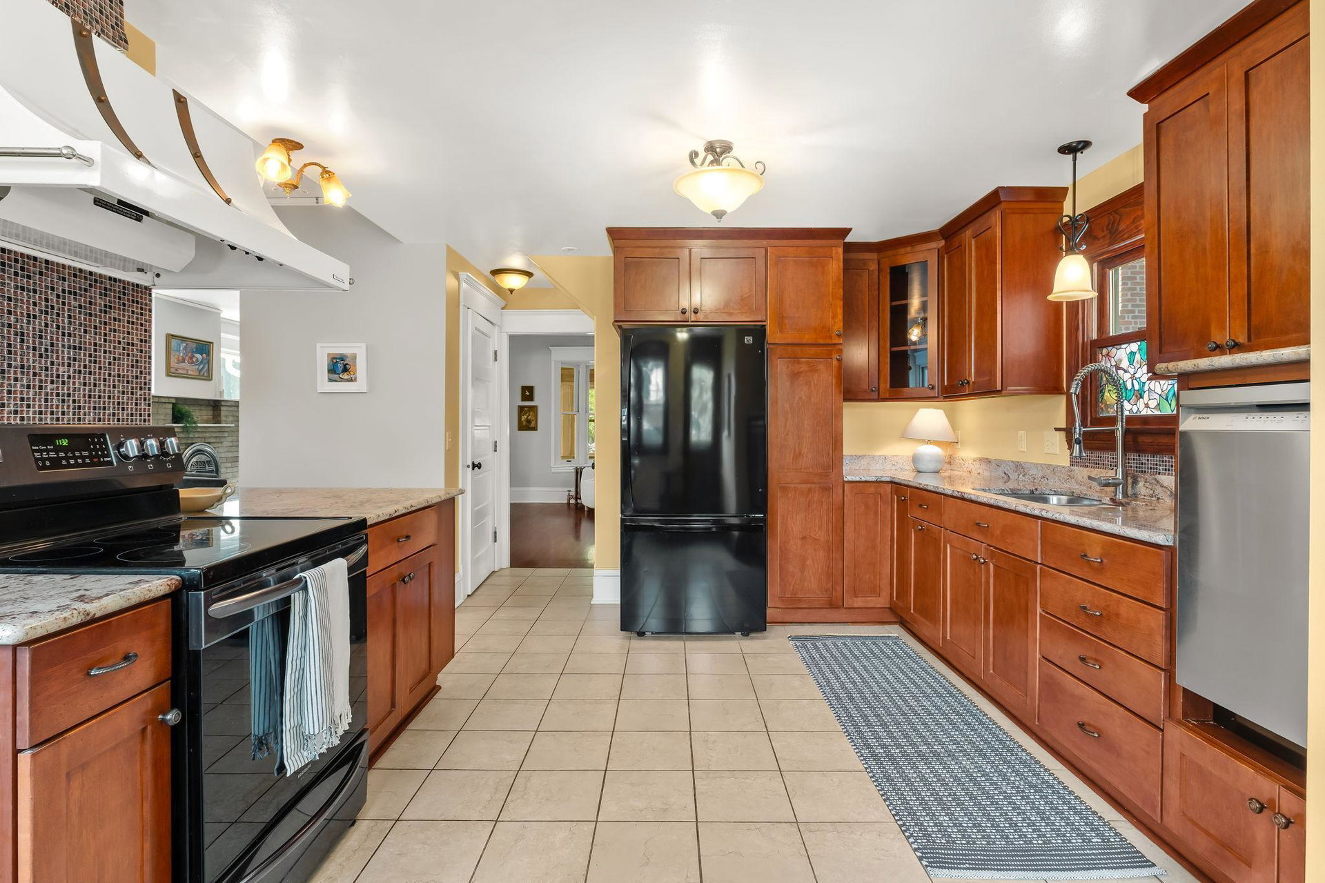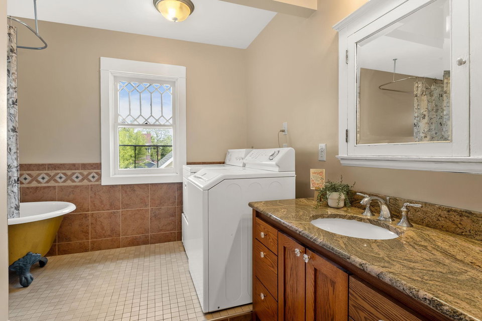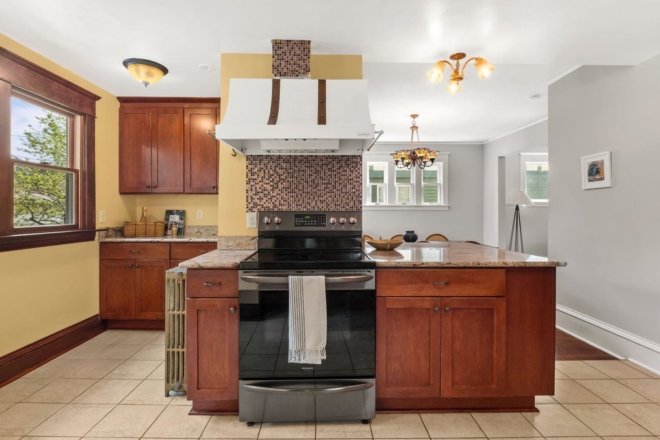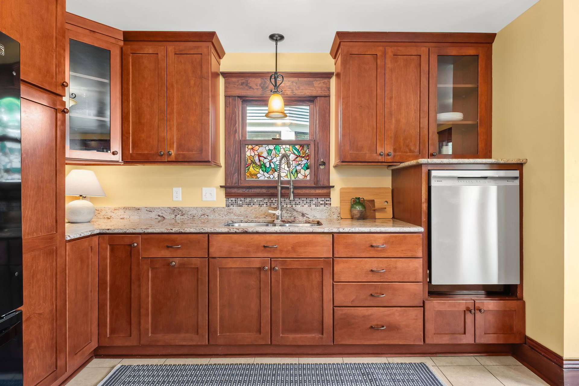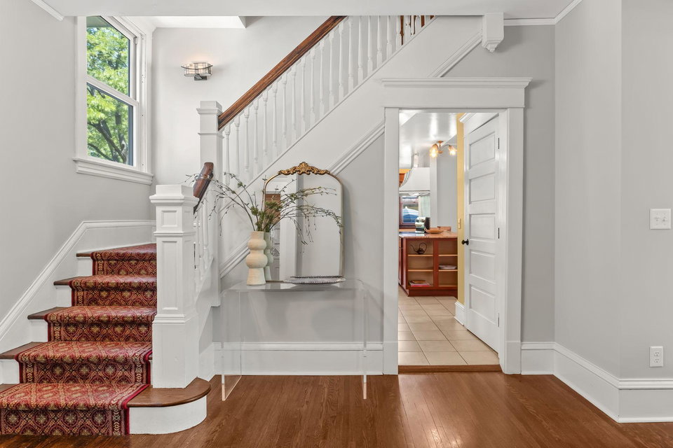 As you approach the property, you’ll be greeted by an inviting front porch, perfect for relaxing and enjoying the neighborhood. Stepping inside, an entryway leads you into the living room. This generous size room is anchored by a handsome fireplace. From the living room, you’ll find the dining room filled with natural light, ideal for both everyday meals and entertaining. Situated at the rear of the home, the thoughtfully remodeled kitchen boasts a layout that can handle multiple cooks in the kitchen. The home’s four bedrooms are all conveniently situated on the upper level. The third floor is unfinished and awaits your vision. The home also offers the convenience of three bathrooms. For parking and additional storage, there is a two-stall detached garage with extra space located above it.