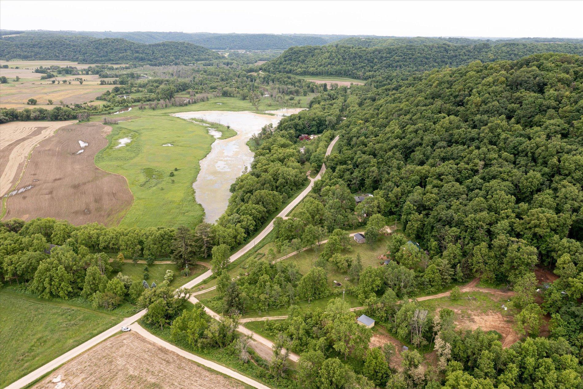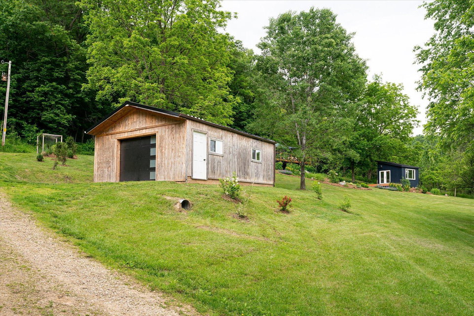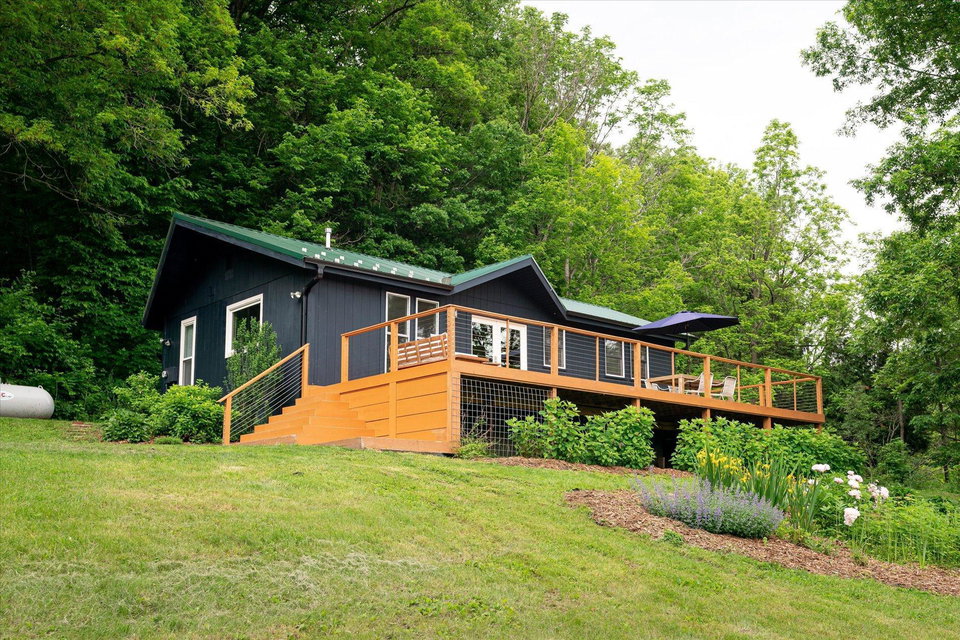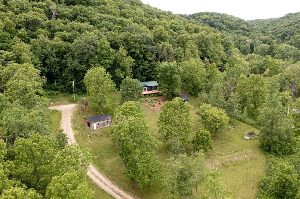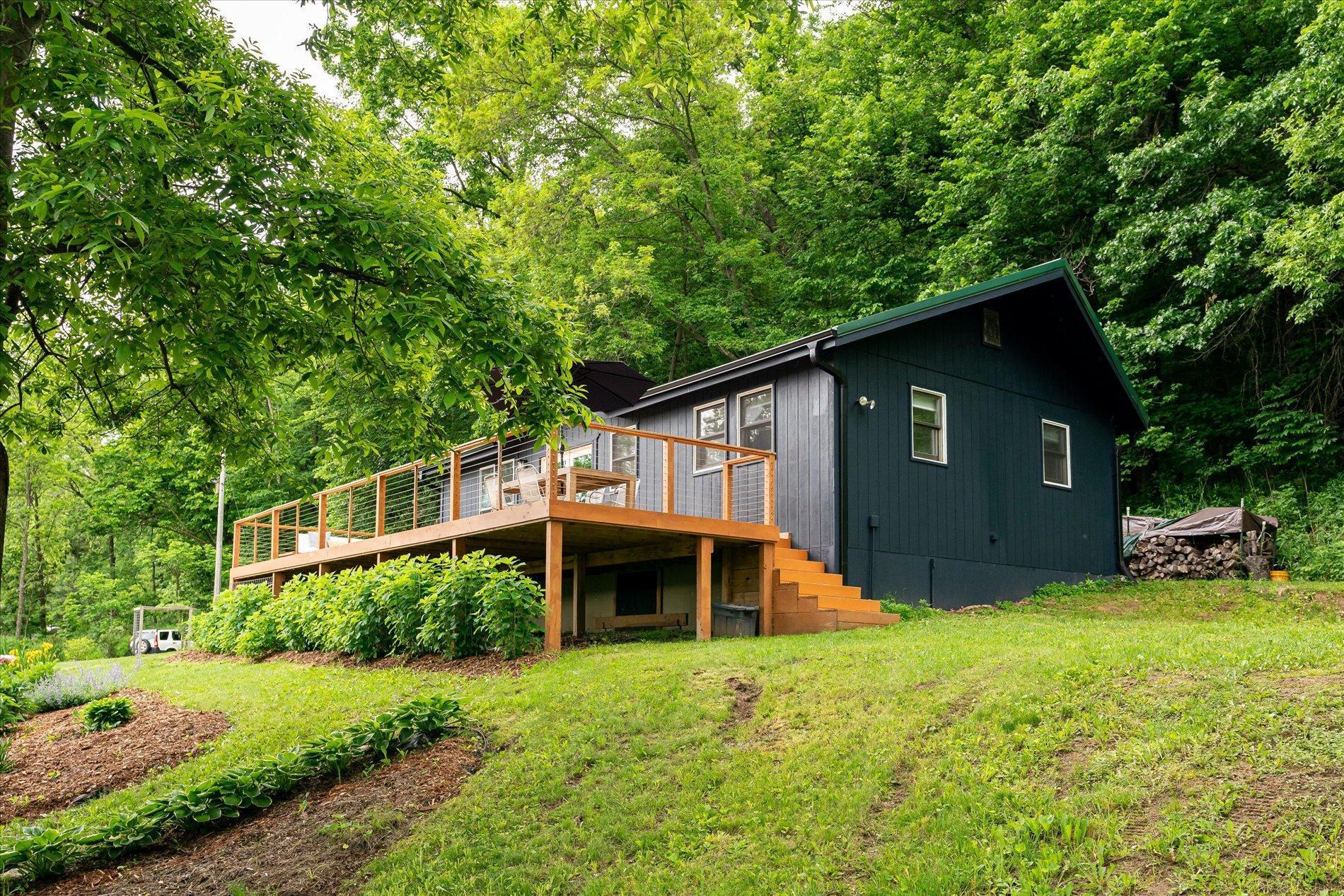 The curious and stunning driftless region will capture you in awe, taking your breath away with its vivid yet calming landscapes. Around the bend on River Rd, overlooking the Kickapoo River, you will find this dreamy escape of 7 acres. With a panoramic view off the deck – the main home includes two bedrooms, full bathroom, gas fireplace, eat-in kitchen, and a washer/dryer. The tiny home is your bonus bedroom space with a loft and room for another bed and/or pull out sofa – perhaps your writers retreat or musicians oasis! One car garage door opens into spacious garage with plenty of storage for all of your year round toys (480 square feet). Access to 20 miles of recreational trails (groomed in the winter for cross country skiing). A land covenant protects shared access to an additional ~4 acres of Kickapoo riverfront. 20 min from Viroqua, 1 hr from LaCrosse, under 4 hrs from Minneapolis. Cast a line, this is YOUR spot! OPEN HOUSES June 17 4-6PM and June 18th 10-12PM