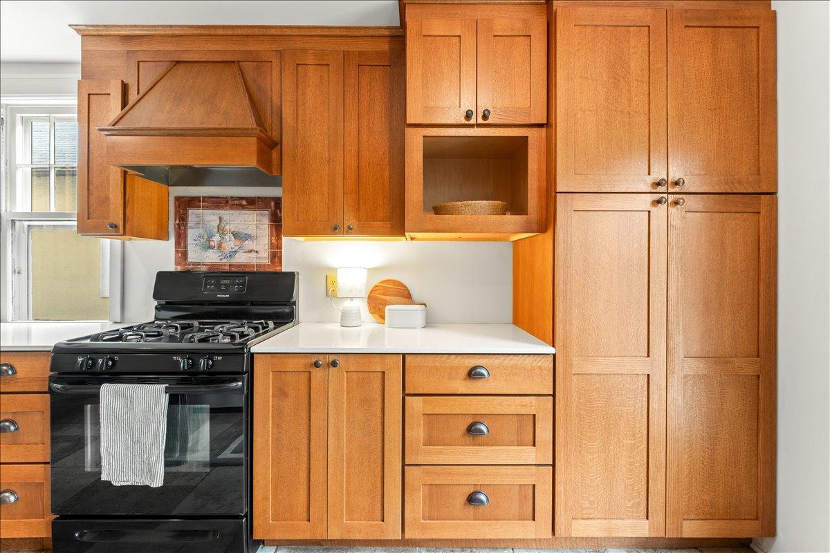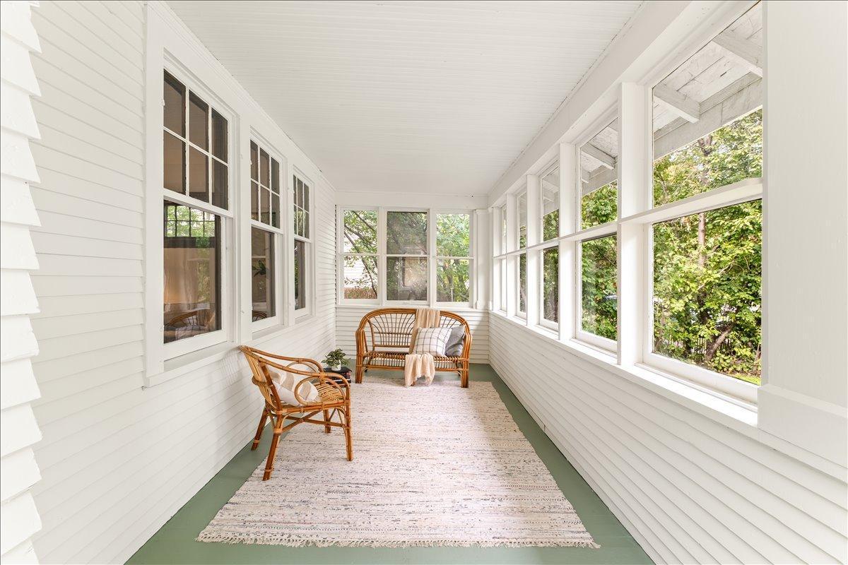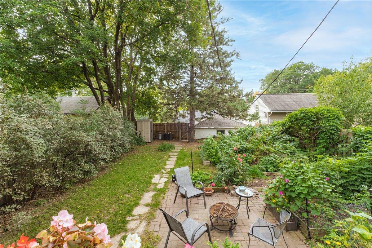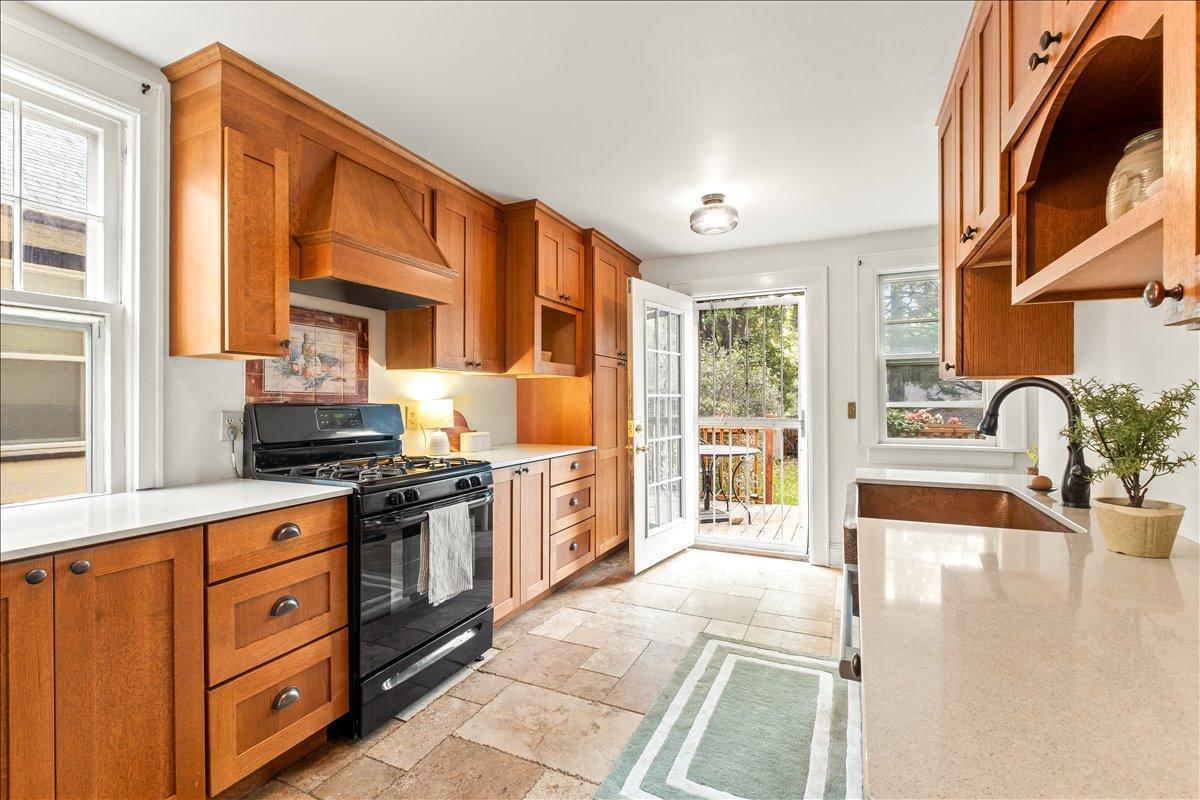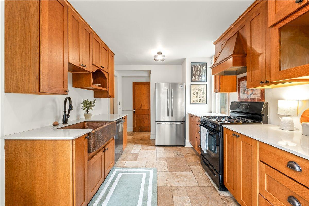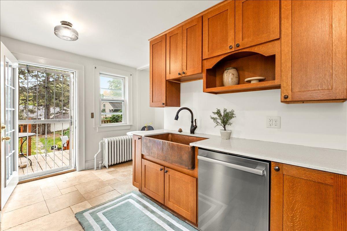 The spacious dining room, complete with a built-in buffet, is perfect for entertaining. The updated kitchen showcases quarter-sawn oak cabinetry, a copper sink, Medallion cabinets, and real travertine marble flooring. Enjoy your morning coffee in the cozy breakfast nook or relax on the charming back porch overlooking a meticulously maintained garden with raspberries, strawberries, zucchini, beans, cucumbers, kale, fennel, roses, and morning glories. All of these items have been organically grown for the last 38 years.