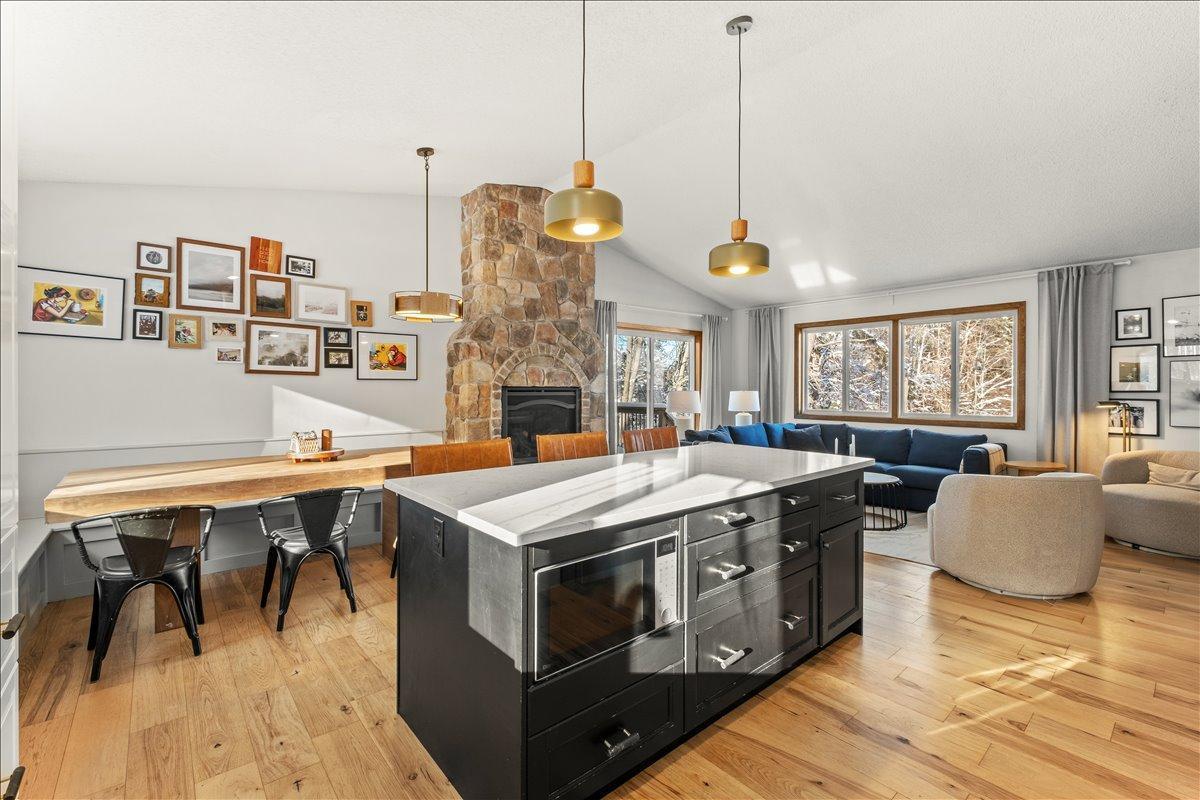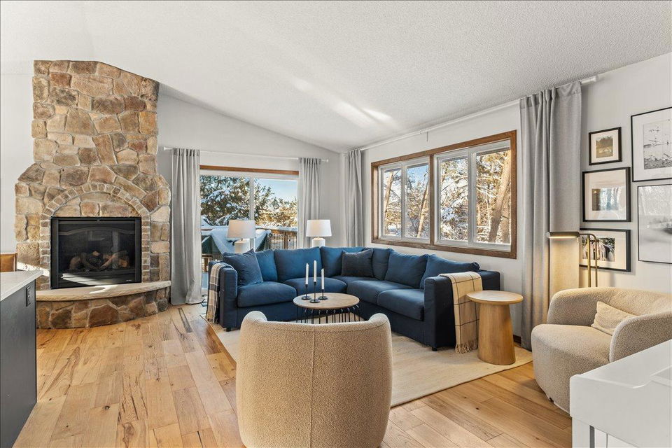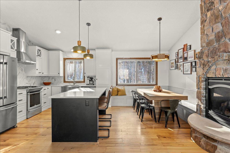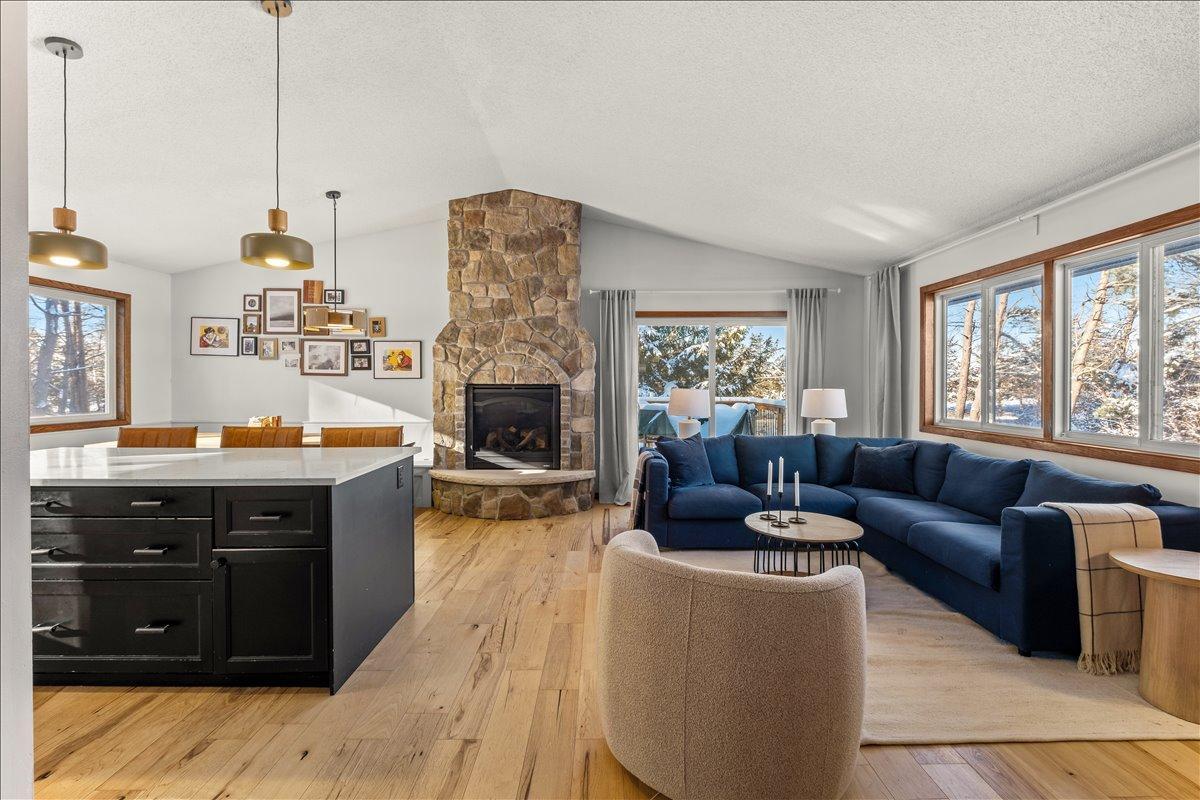 Inside, the remodeled open kitchen anchors the main level with a large center island ideal for entertaining and effortless flow into the dining and living areas. Vaulted ceilings, wide-plank rustic flooring, and a striking fieldstone fireplace create a warm yet modern great room with abundant natural light. A huge, sunny deck extends the living space outdoors, perfect for relaxing or hosting gatherings.