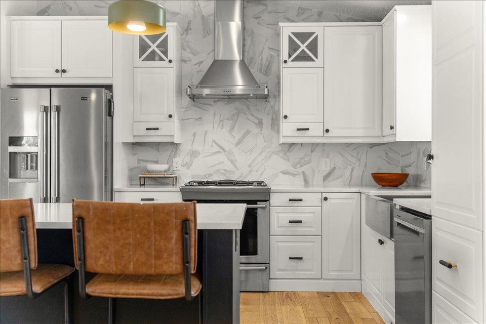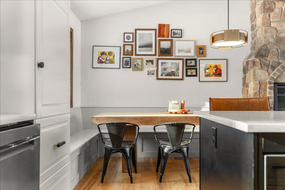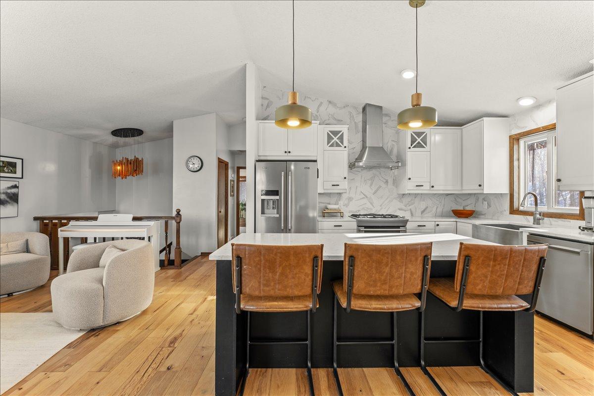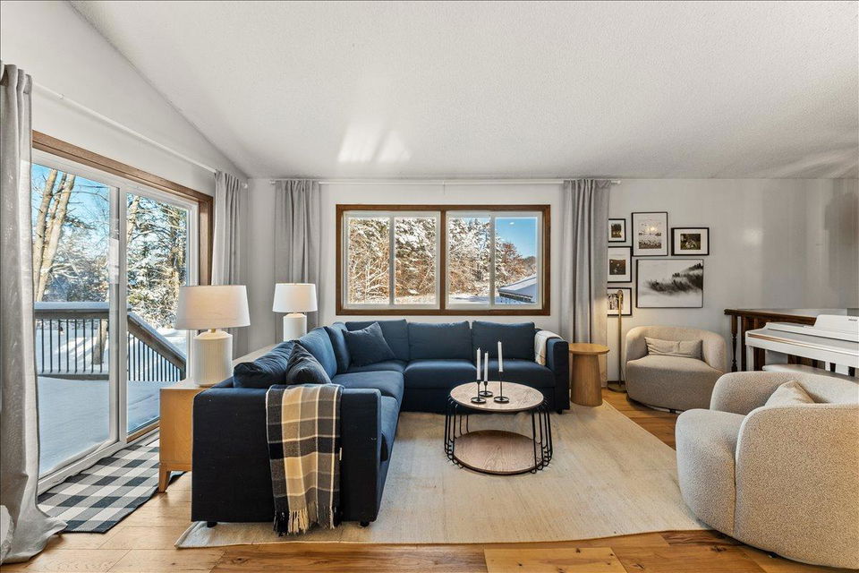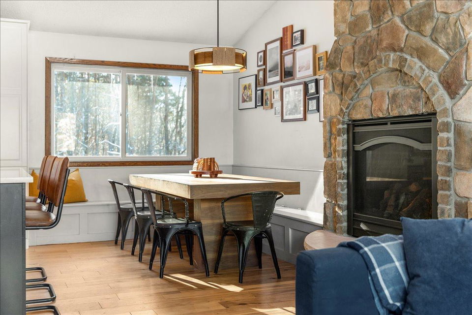 Inside, the remodeled open kitchen anchors the main level with a large center island ideal for entertaining and effortless flow into the dining and living areas. Vaulted ceilings, wide-plank rustic flooring, and a striking fieldstone fireplace create a warm yet modern great room with abundant natural light. A huge, sunny deck extends the living space outdoors, perfect for relaxing or hosting gatherings.