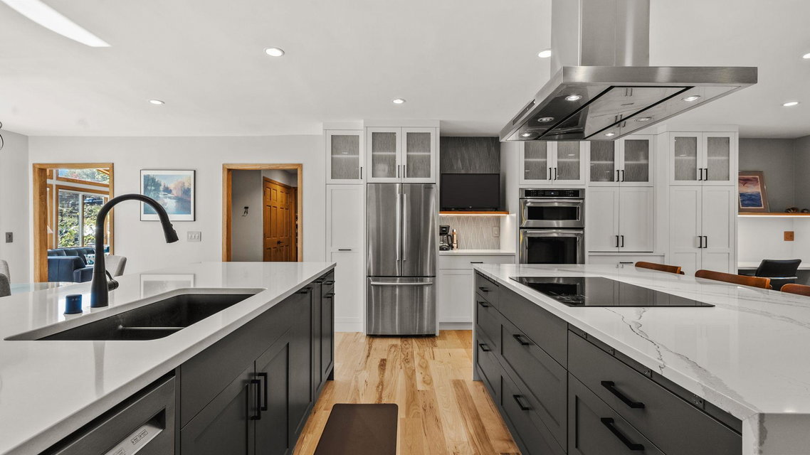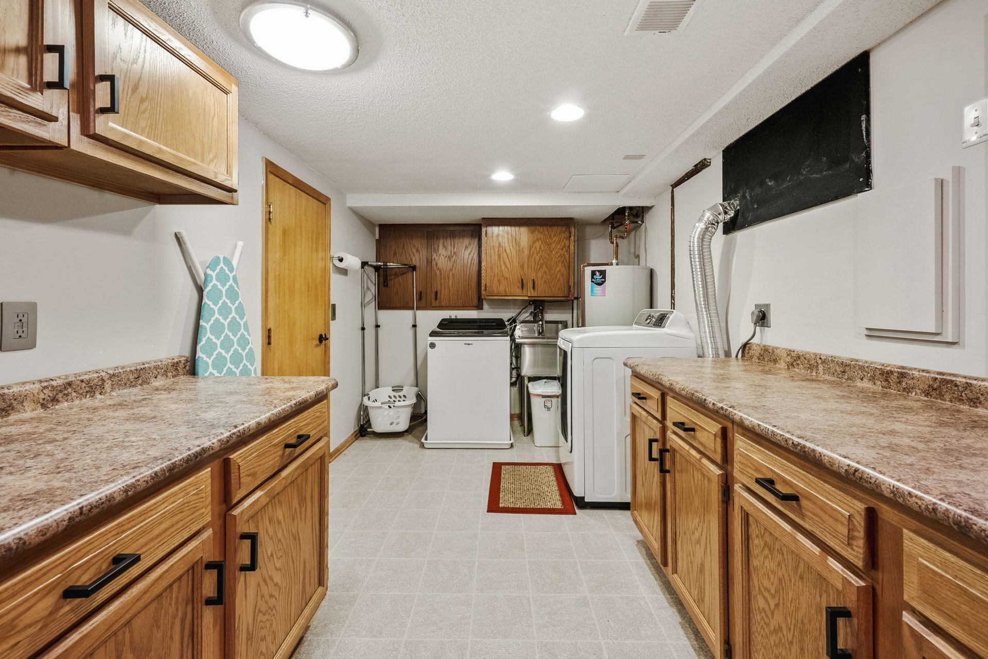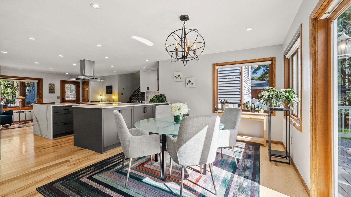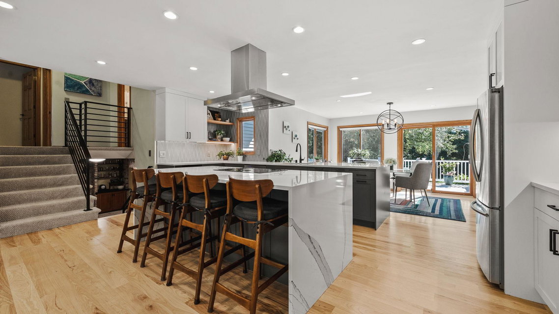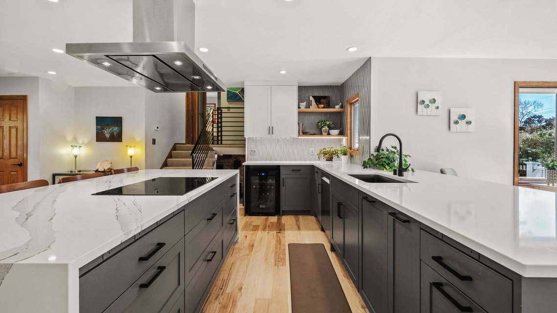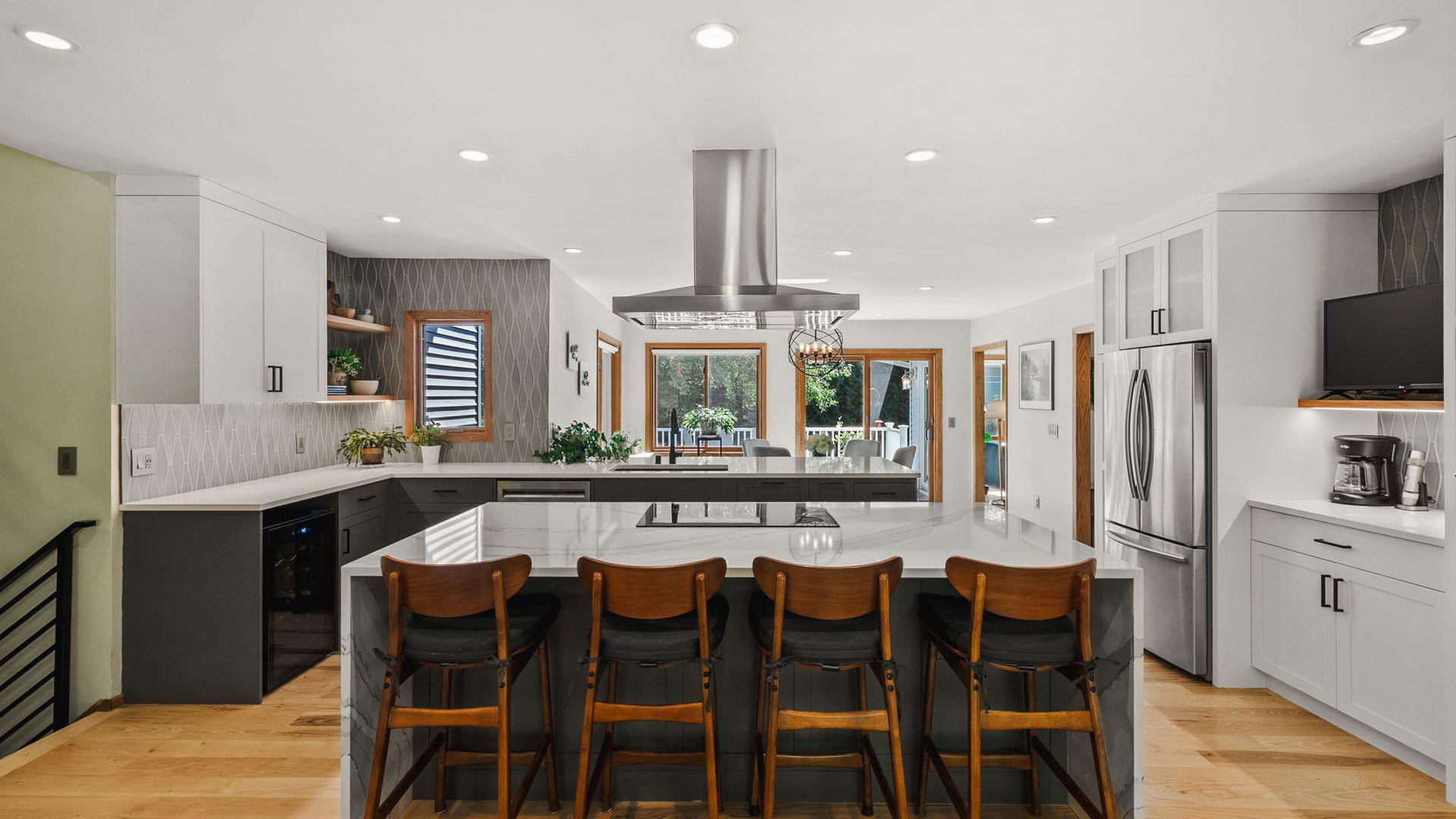 This beautifully reimagined four-level split home, transformed by renowned Shelter Architecture in 2019, blends thoughtful design with modern function in the heart of New Brighton. Offering 3 bedrooms, 3 bathrooms, and two distinct living rooms, this home hosts both function and style in a coveted neighborhood with deeded access to Long Lake and placement in the Mounds View School District. At the heart of the home is a large, open-concept kitchen, a showcase of the Shelter renovation. With rich hickory floors, sleek quartz countertops, and a generous center island, the kitchen creates a visual and functional anchor with sightlines extending throughout the main levels. The kitchen includes stainless steel appliances, wine fridge, and large custom cabinetry built in for a pantry, office, and coffee/appliance area. A bright dining room at the back of the home overlooks the backyard and deck. The main floor family room addition is filled with southern light and features a cozy gas fireplace. On the upper level are all three bedrooms, including a full bath and a private primary suite with its own updated ¾ bathroom. The garden-level family room provides a second gathering space with tall ceilings, a second gas fireplace, and walkout access to the lush backyard. The lowest level includes a finished laundry area, a flexible space for a workout room, and more storage. Enter through the attached two-car garage into a thoughtfully designed transition space, featuring a mudroom, a large closet, and a walk-in pantry, adding everyday convenience and ample storage right where you need it most. Step outside to your private backyard oasis, surrounded by tall arborvitae trees for privacy. Enjoy the shade of a joyful crabapple tree and the vibrant colors of sunflowers and zinnias among established perennials. Spend evenings on your deck or head across the street to Long Lake to take advantage of the shared dock, beach, and recreational waters. Meticulously maintained by the sellers since 1984. This is an opportunity to live with architectural intention and natural connection!