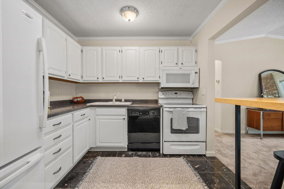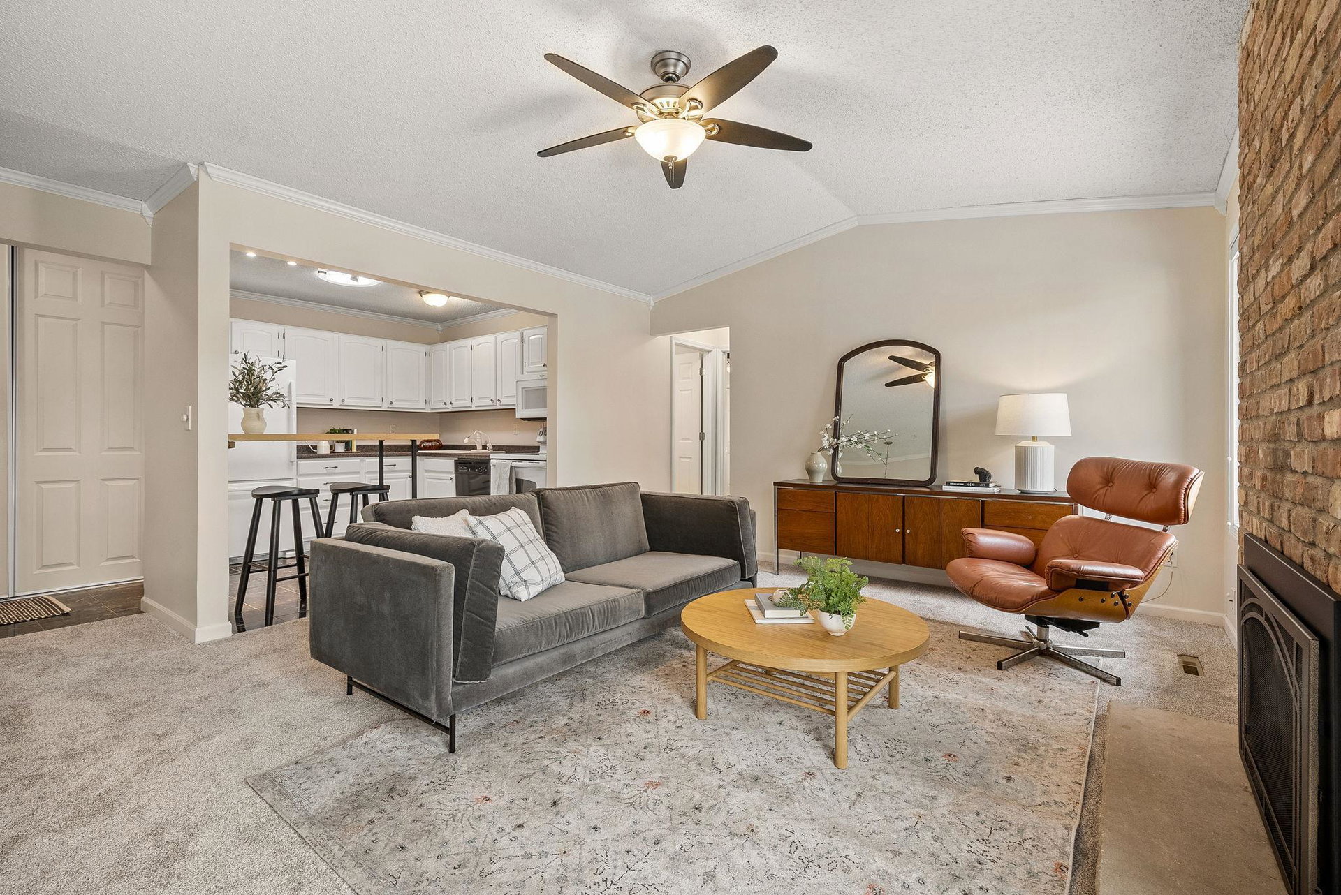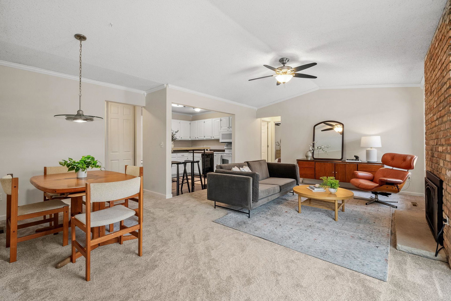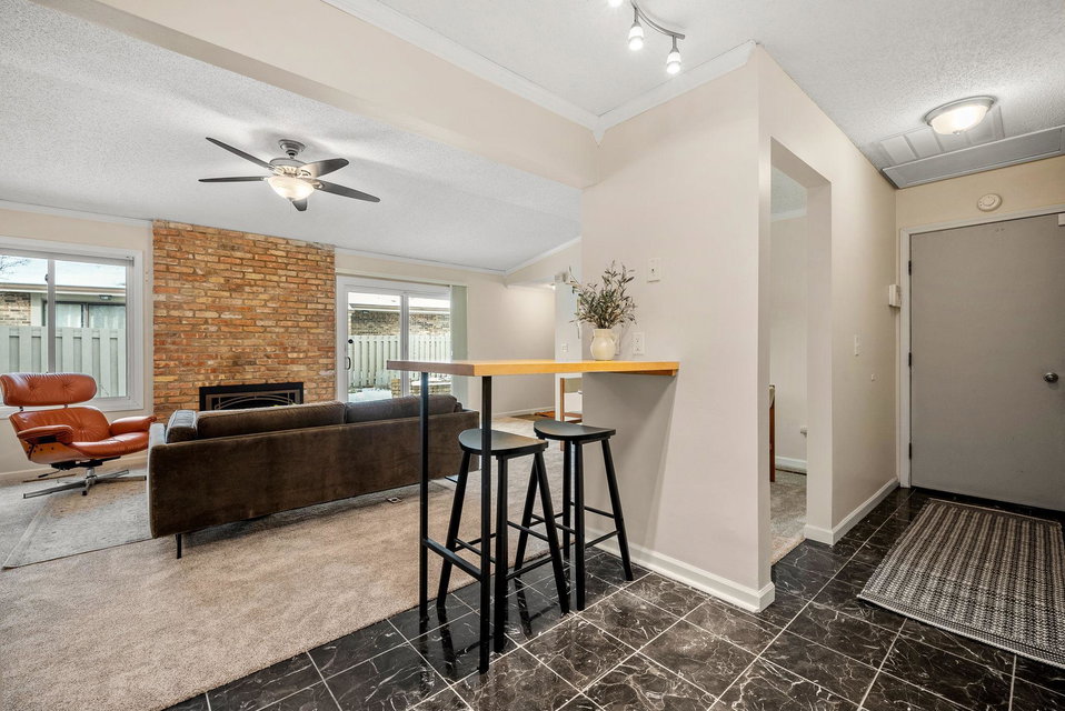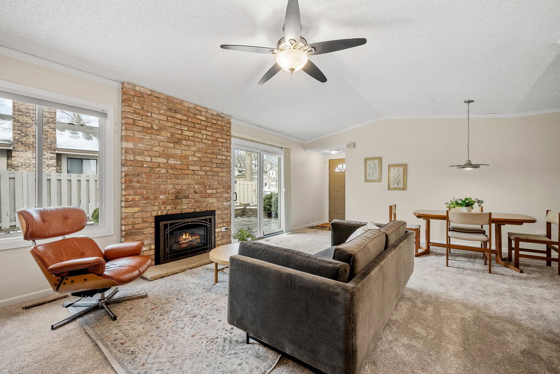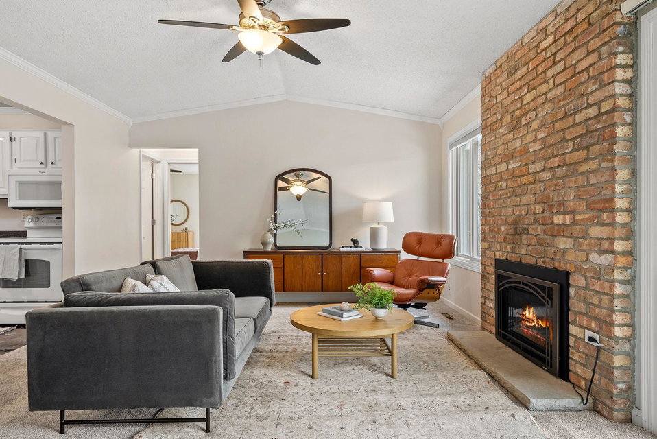 This charming townhome offers a relaxed, open-concept layout with vaulted ceilings, creating a spacious and airy feel throughout. The inviting living room is centered around a cozy gas fireplace with a handsome brick hearth, providing the perfect spot to unwind. The bright, eat-in kitchen is well-appointed with plenty of cabinet and countertop space, and there’s a dedicated area for formal dining. For added convenience, the laundry is tucked away just off the main living area.