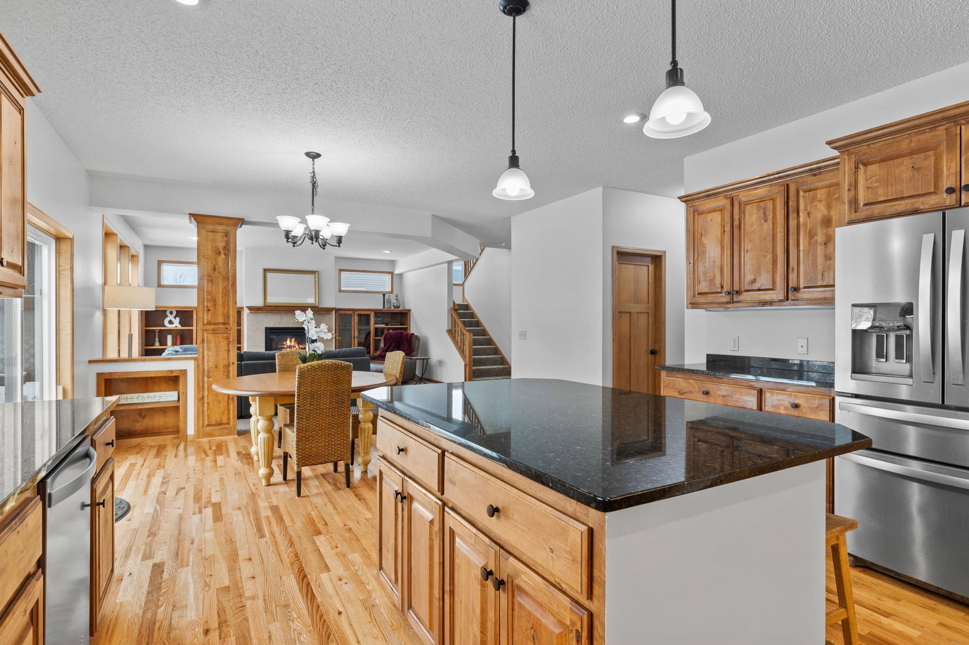 Step inside to find newly refinished hardwood floors in the kitchen and dining areas, creating a warm, inviting space. The kitchen is a chef’s dream with a large island, fresh granite countertops, and a brand new range. The living room features large windows, fireplace, and built-in shelves. The open layout allows for seamless entertaining and family gatherings.