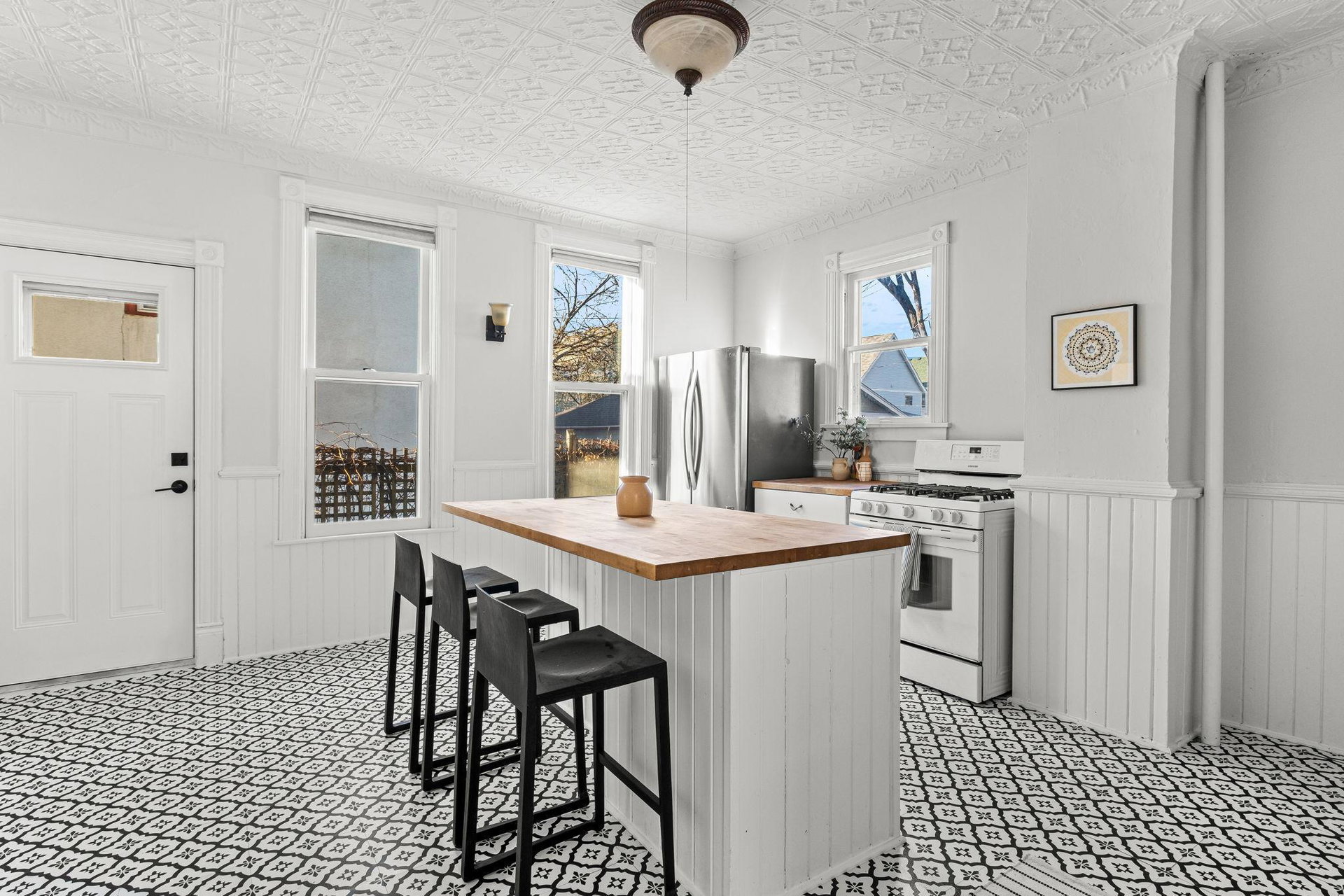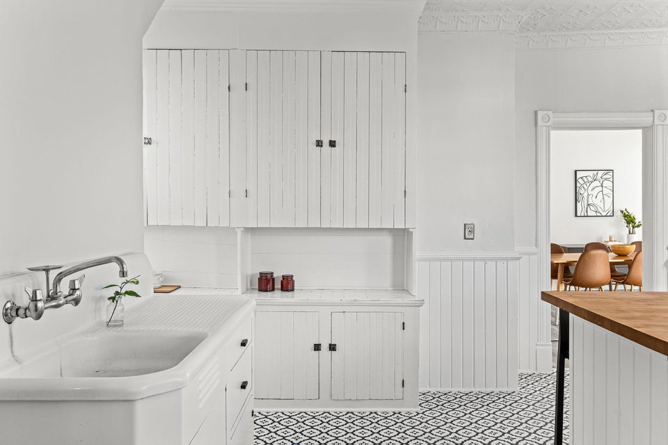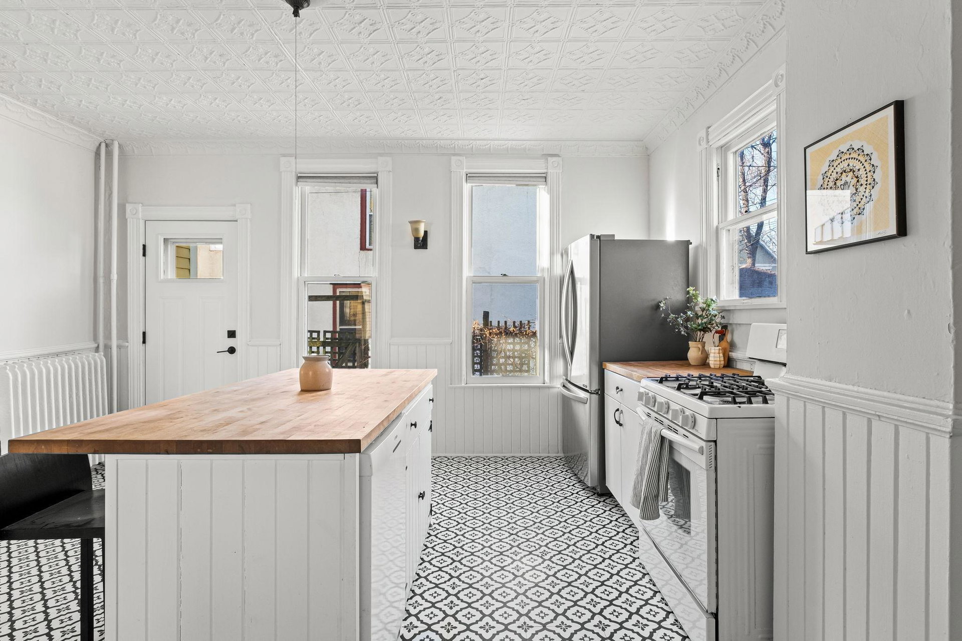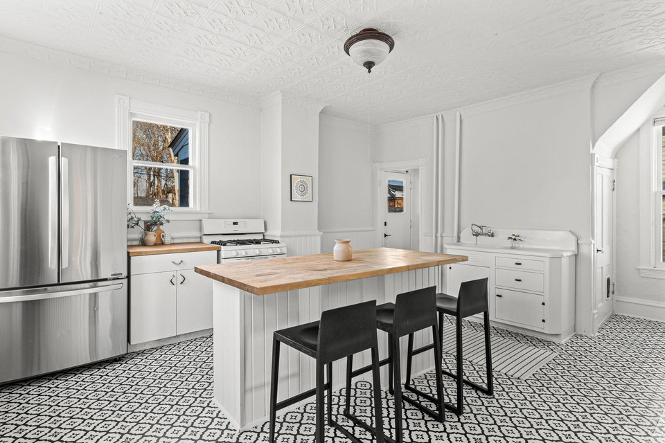 The exquisite tin ceilings and vintage details create a unique atmosphere that enhances the home’s welcoming, airy layout. The large country kitchen is a true highlight, featuring brand new flooring, high-end appliances, and a butcher block island—perfect for preparing meals or hosting family and friends.