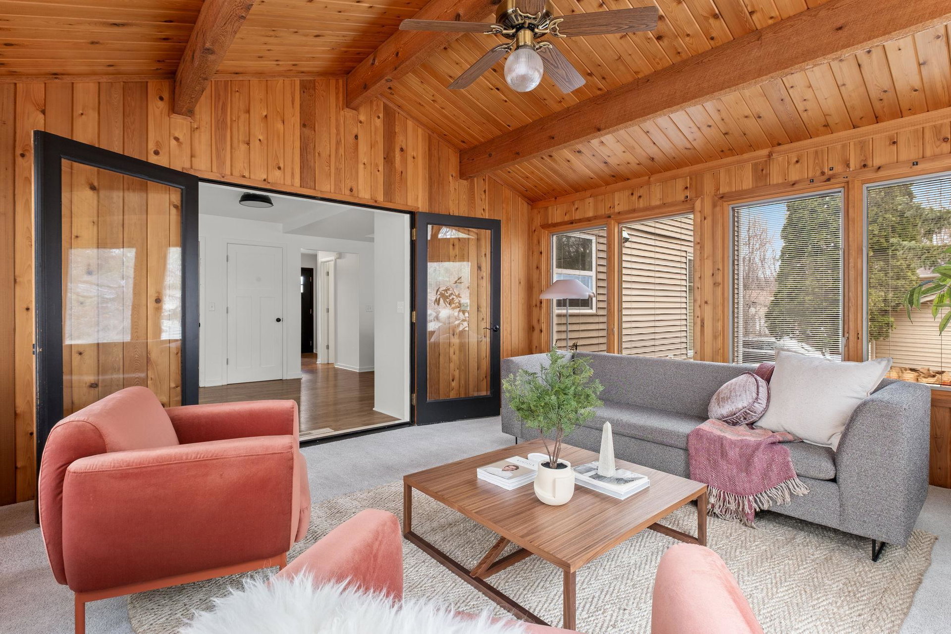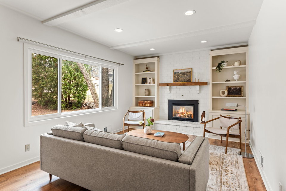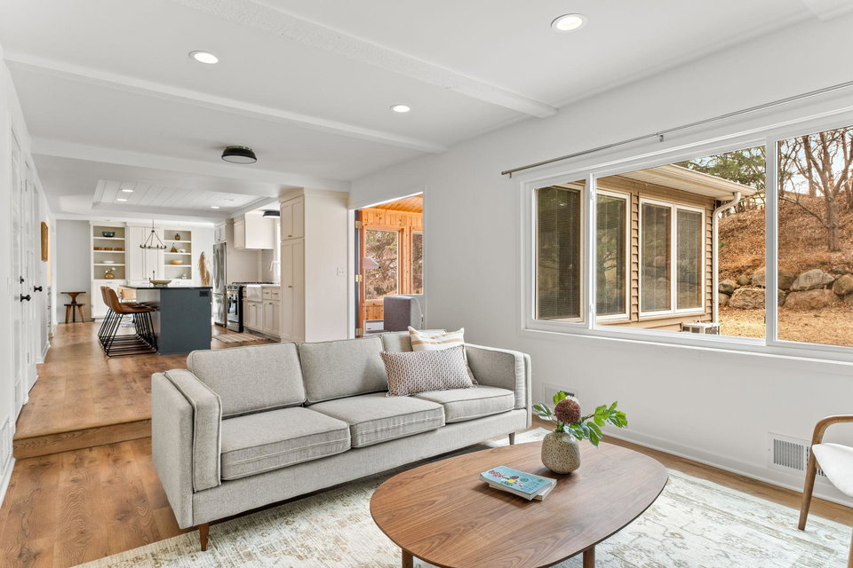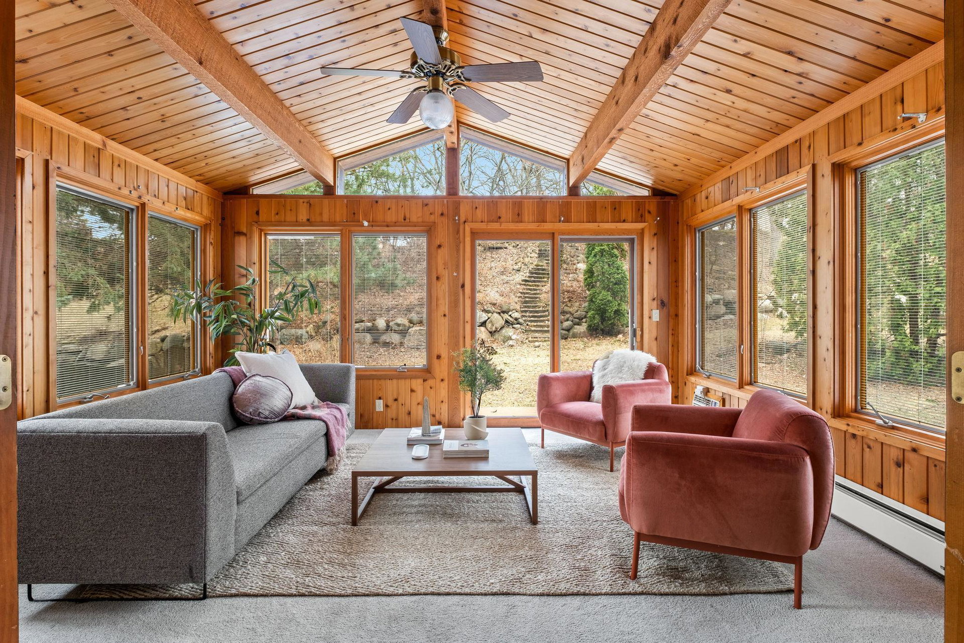 The main level offers a flexible open floor plan with exceptional sightlines while preserving the definition and purpose of each space. The family room features a lowered conversation spot, perfect for cozy chats around the fireplace, while the four-season porch, fully clad in knotty pine, adds a sense of warmth and natural elegance—ideal for year-round relaxation.