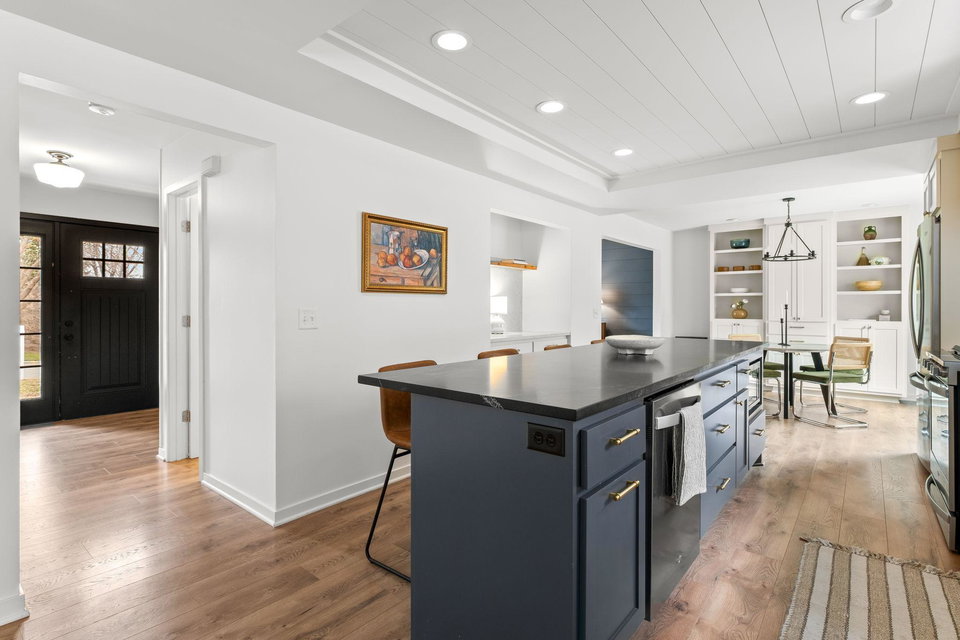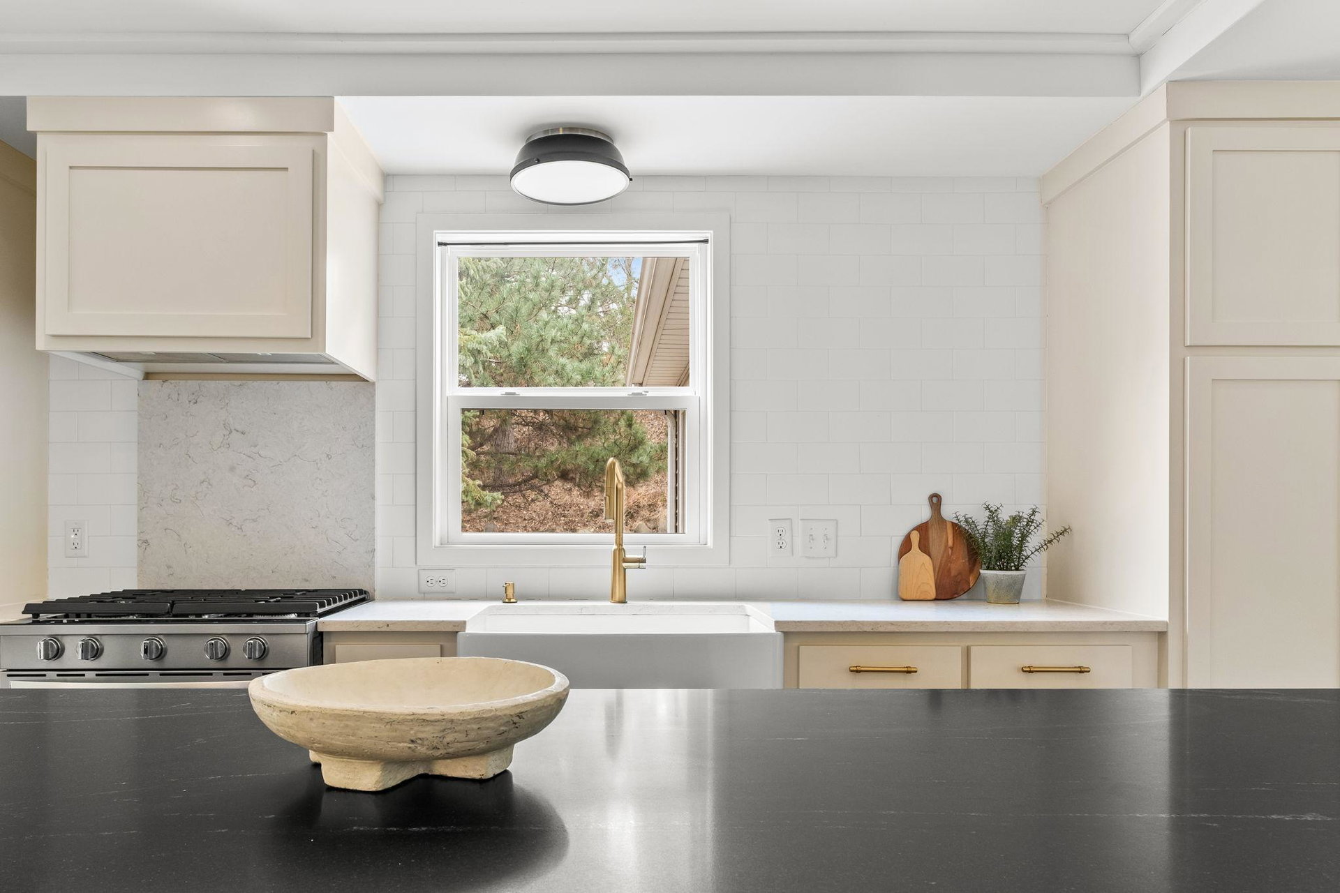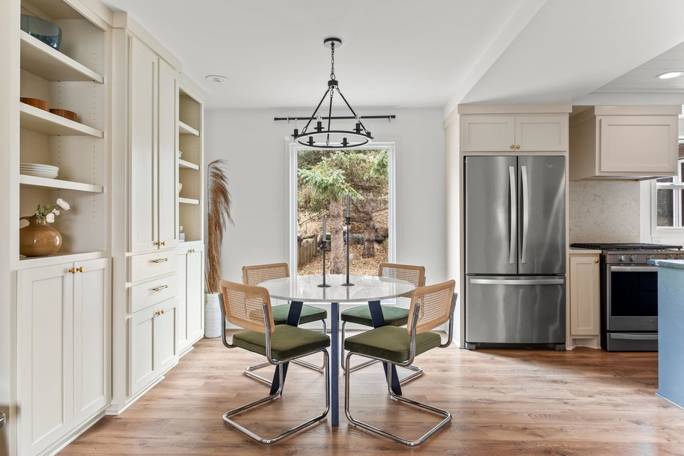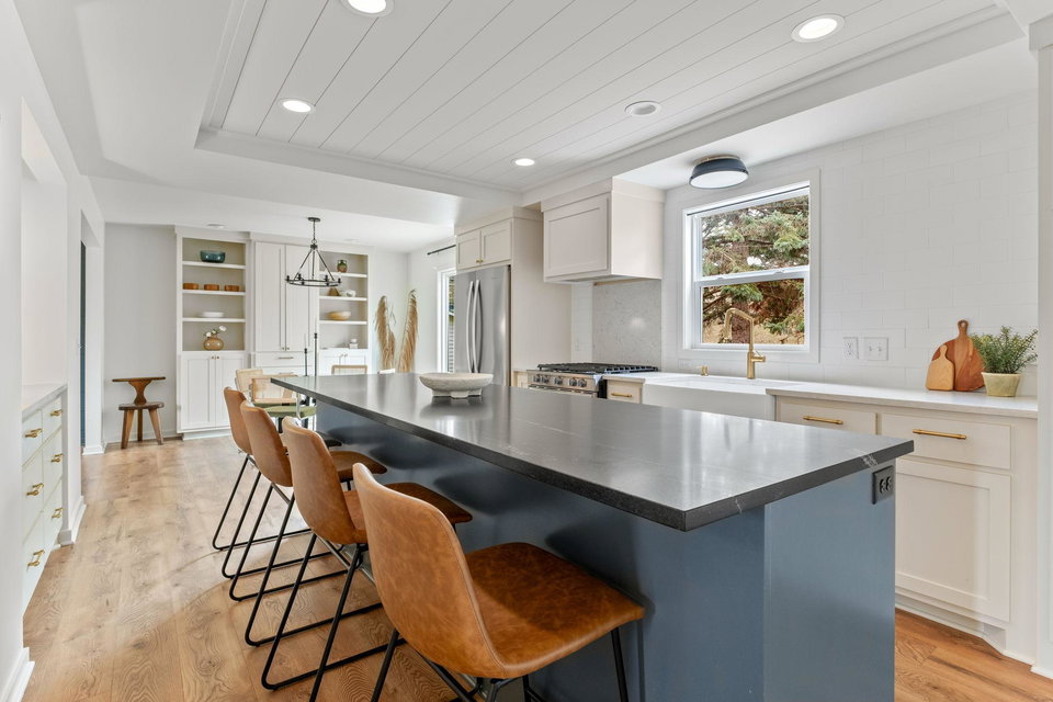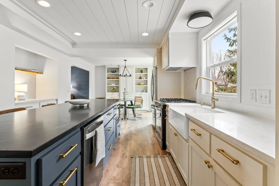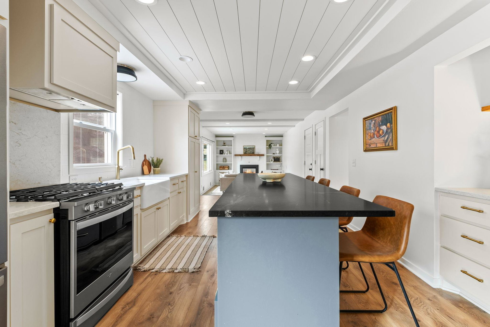 At the heart of the home, the expansive eat-in kitchen makes a stunning statement. Anchored by a bold black stone island with counter seating, it features sleek custom cabinetry, a full tiled backsplash wall, a large farmhouse sink, curated built-ins, and brass accents throughout. The intentional design balances style and function—ideal for both everyday living and effortless entertaining. Just off the kitchen, the dining area boasts chic built-ins that add both storage and style, creating the perfect space for gathering.