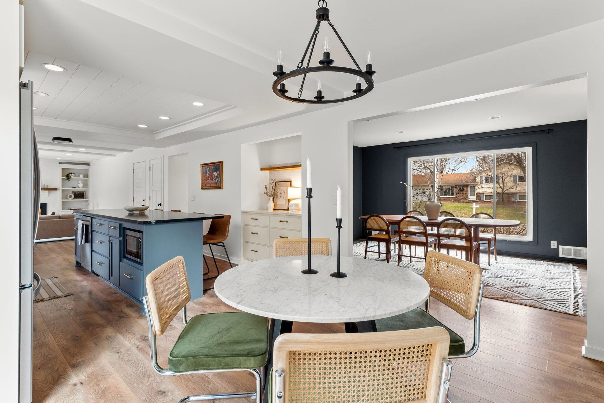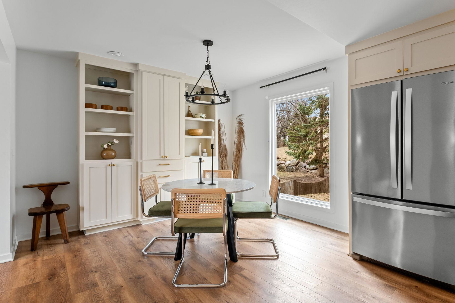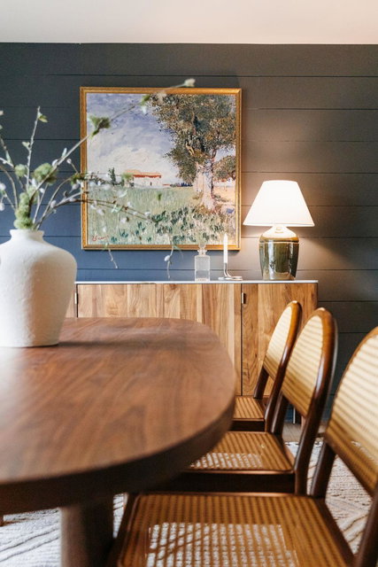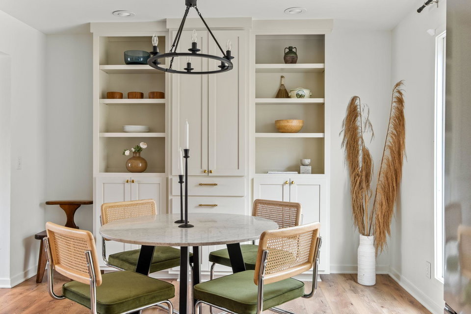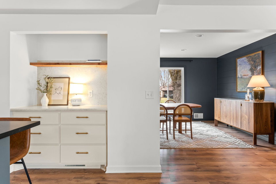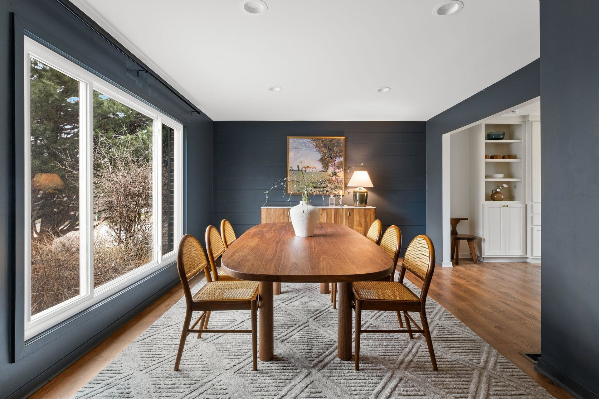 At the heart of the home, the expansive eat-in kitchen makes a stunning statement. Anchored by a bold black stone island with counter seating, it features sleek custom cabinetry, a full tiled backsplash wall, a large farmhouse sink, curated built-ins, and brass accents throughout. The intentional design balances style and function—ideal for both everyday living and effortless entertaining. Just off the kitchen, the dining area boasts chic built-ins that add both storage and style, creating the perfect space for gathering.