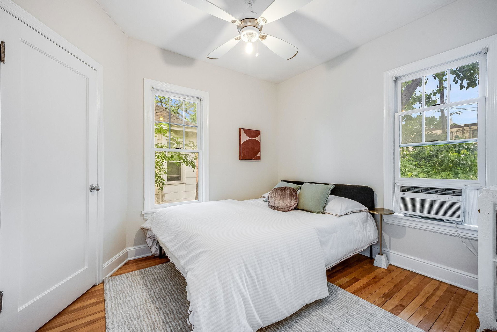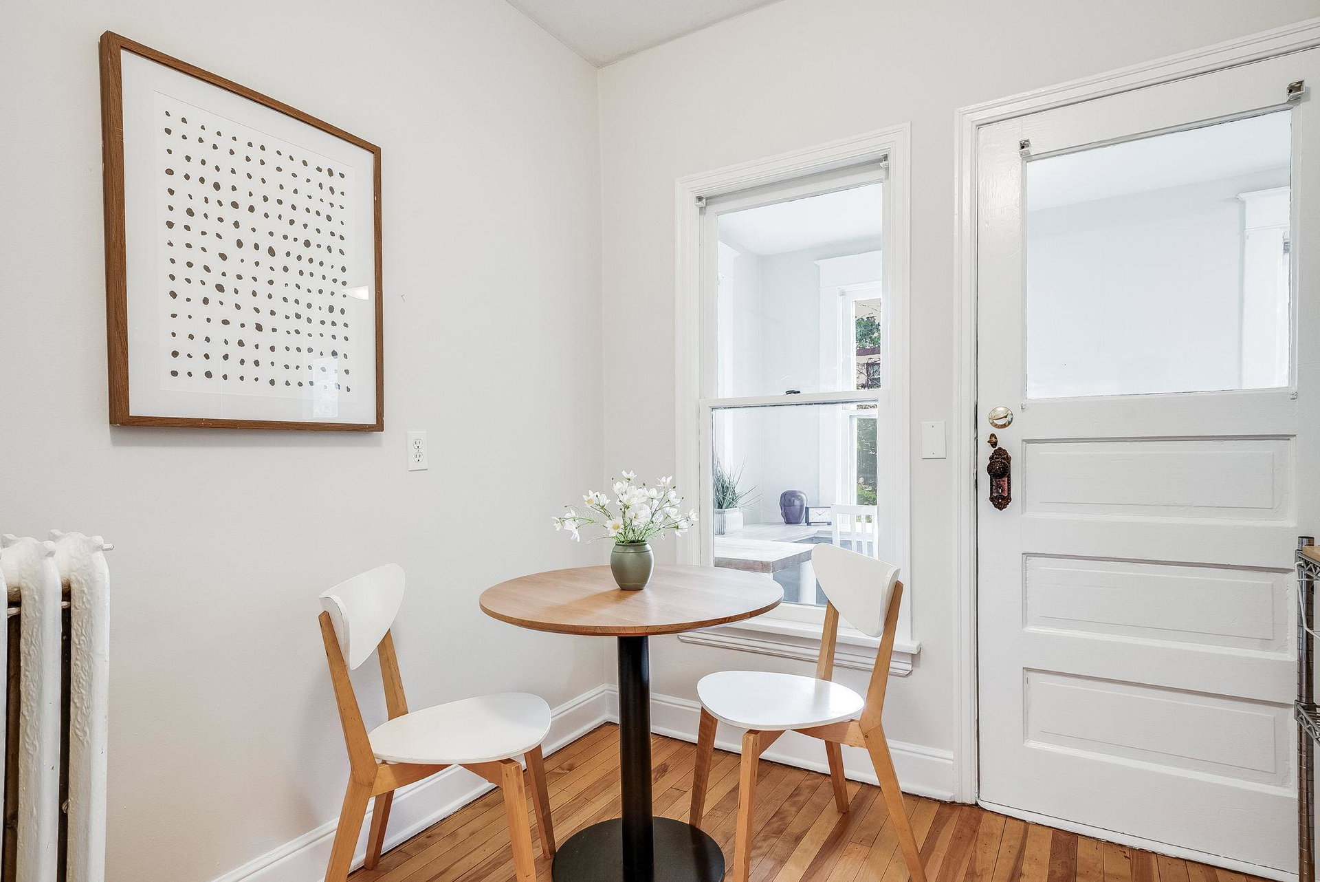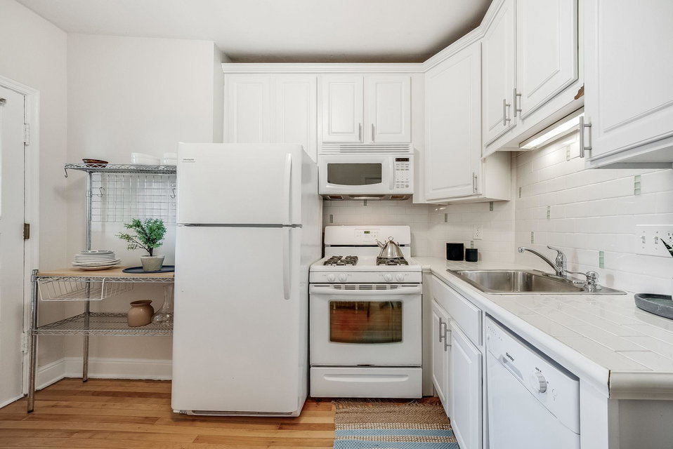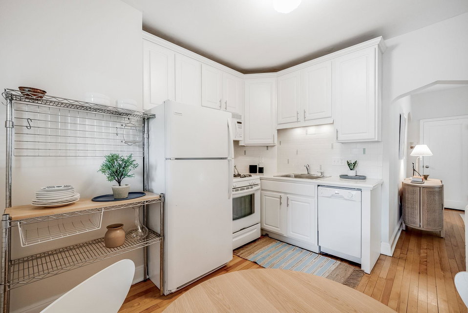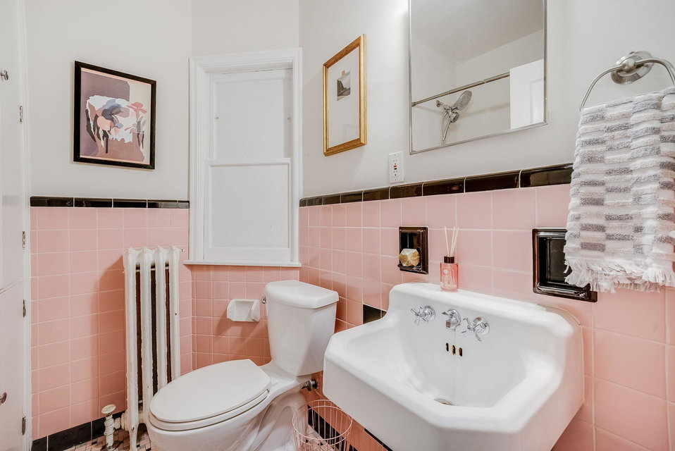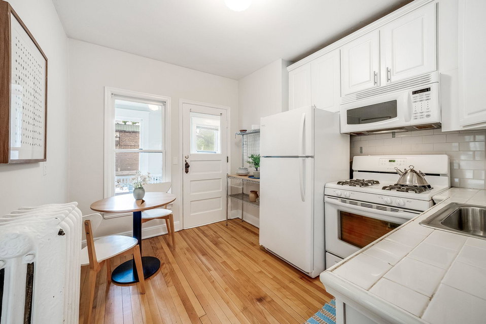 This classic North facing top floor unit is a must see! Great natural light and room flow with beautiful maple floors throughout! Lovely vintage pink tiled bathroom, efficient storage and use of space, updated and stylish eat-in kitchen. Laundry and a storage unit in the basement is included. Close to grocery, restaurants, entertainment, art and more. You will love living here!