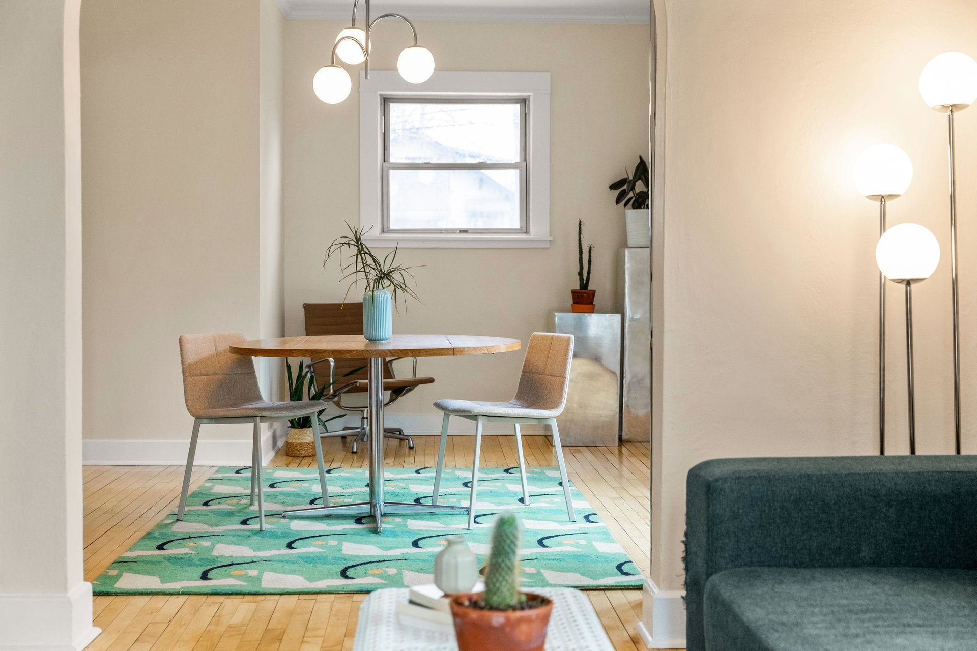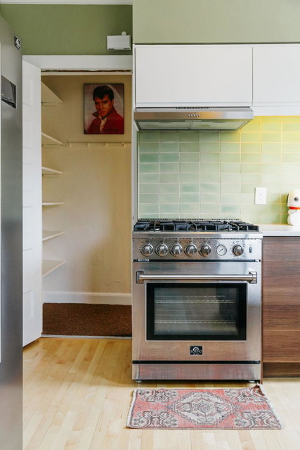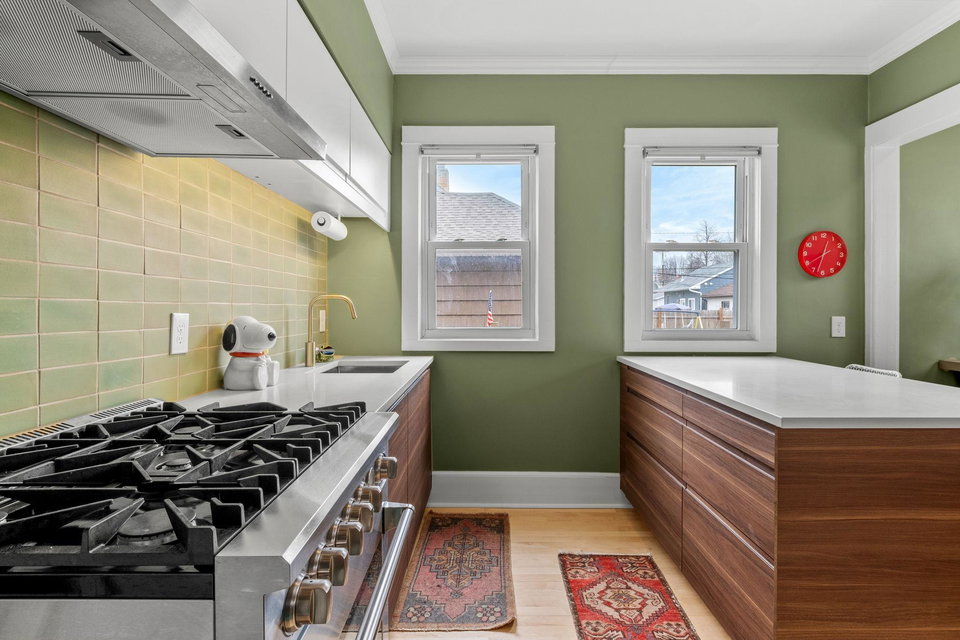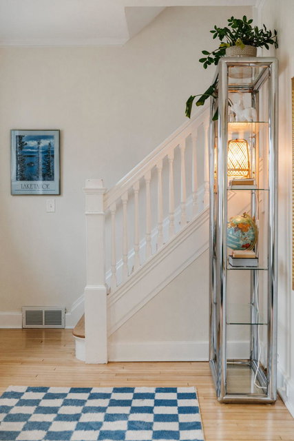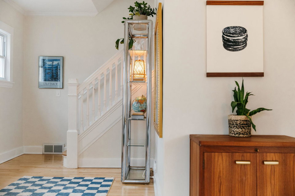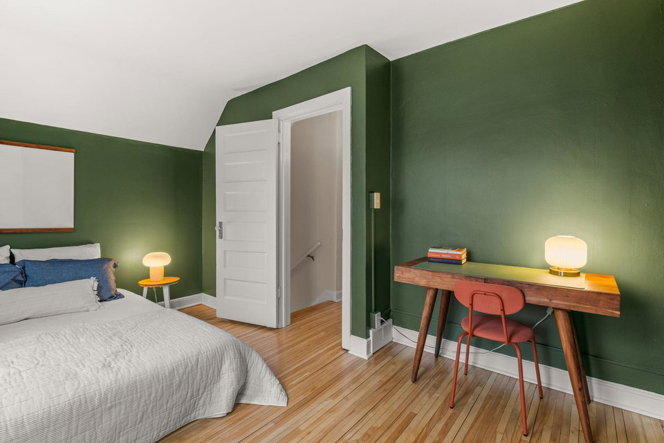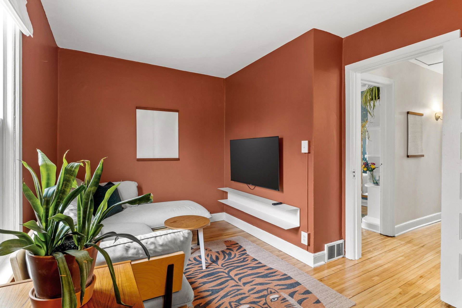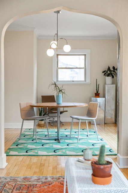Drenched in natural light, the home blends original charm with thoughtful modern updates. Beautifully preserved maple hardwood floors, tall ceilings, and graceful archways create a warm, inviting atmosphere. Fresh, vibrant paint and stylish contemporary fixtures add a pop of personality throughout.