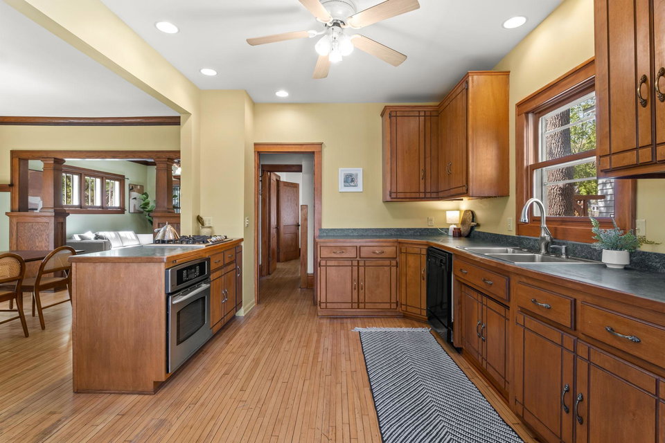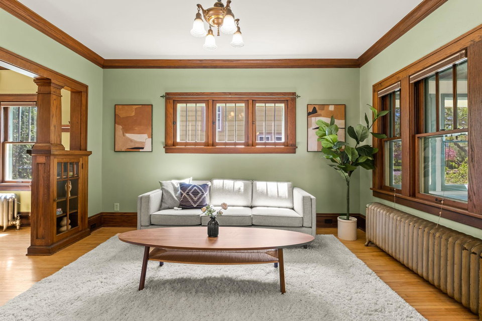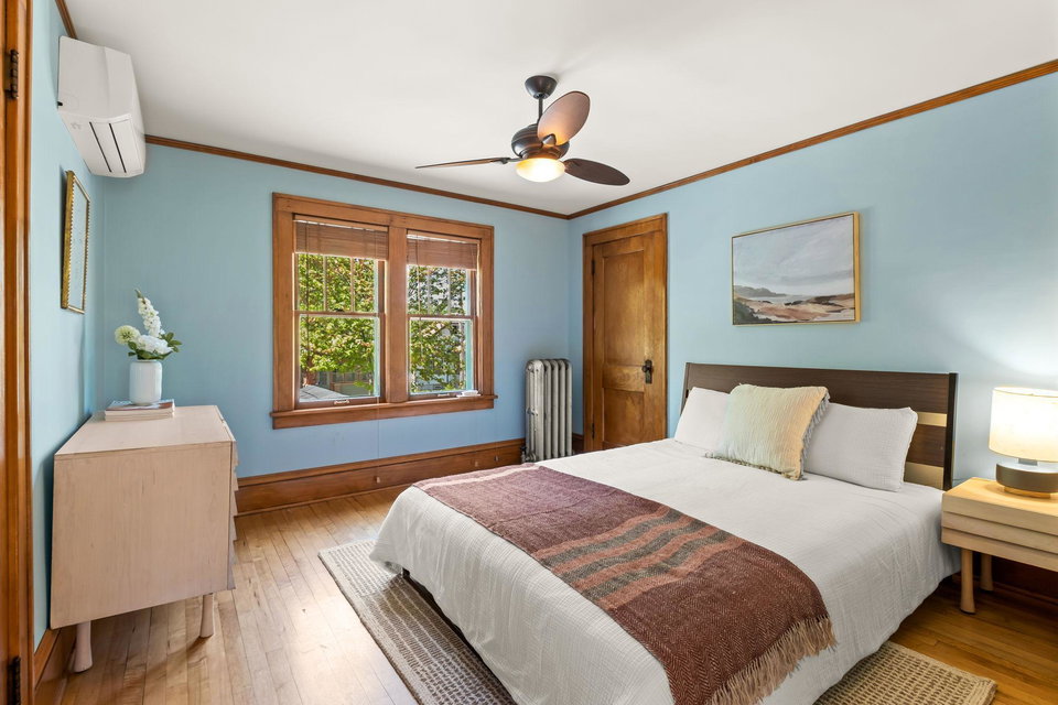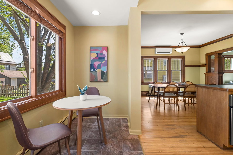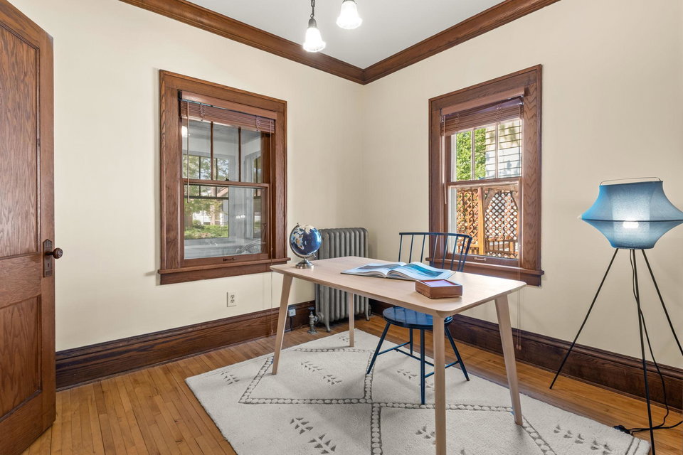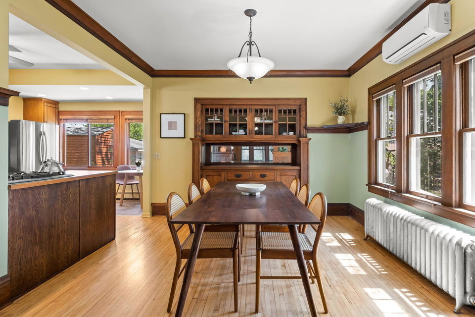 Multiple Offers Received – Offers due at 5pm 5/17. Come see this storybook Craftsman home, freshly painted in a charming lilac hue, nestled in the vibrant Longfellow neighborhood! The spacious front porch is your welcoming transition into this well maintained (and lives larger than it looks) 2 bedroom, 1 bathroom home. You’ll find beautiful natural woodwork, gleaming hardwood floors, stunning original wood built in, and large staircase with wood steps and banister – all showcasing the timeless craftsmanship that defines the home. The oversized eat-in kitchen offers ample space for cooking with connection to the formal dining room. A dedicated office and inviting living room provide all the right spaces for modern living on the main floor. Upstairs, both bedrooms (with great closet spaces!) sit adjacent to a full bathroom featuring a skylight that fills the space with natural light. The back bedroom has access to the upper level balcony. Outside, the large yard offers room to garden or play, beautiful perennials and maple tree, and the large picturesque carriage house garage that has one parking stall and the other half is a storage area, this is where the original owners lived as the house was being built! With radiant heat and ductless mini split cooling (that also has a heating function), you will be comfortable all year long. New roof last year! This is a true Longfellow treasure!