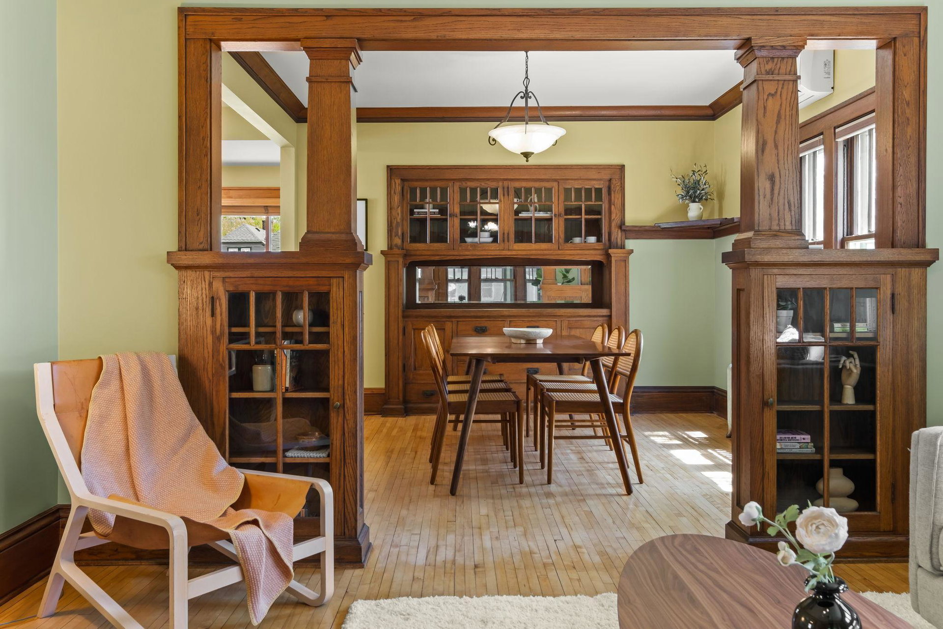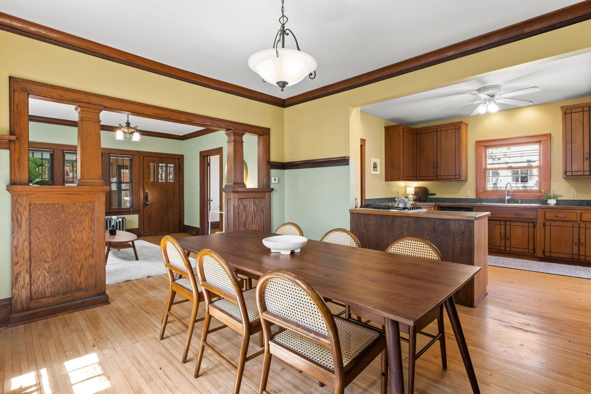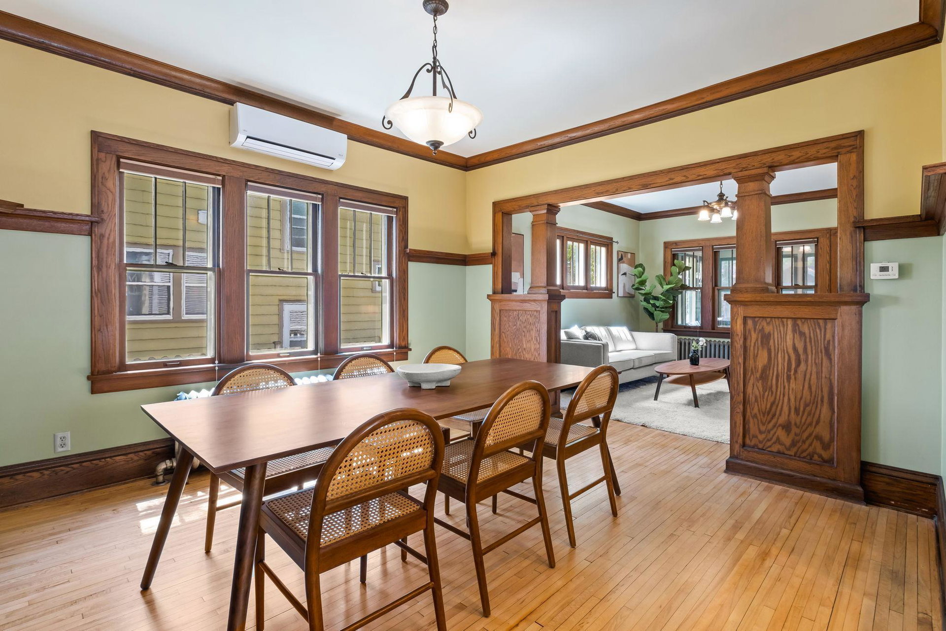 Multiple Offers Received – Offers due at 5pm 5/17. Come see this storybook Craftsman home, freshly painted in a charming lilac hue, nestled in the vibrant Longfellow neighborhood! The spacious front porch is your welcoming transition into this well maintained (and lives larger than it looks) 2 bedroom, 1 bathroom home. You’ll find beautiful natural woodwork, gleaming hardwood floors, stunning original wood built in, and large staircase with wood steps and banister – all showcasing the timeless craftsmanship that defines the home. The oversized eat-in kitchen offers ample space for cooking with connection to the formal dining room. A dedicated office and inviting living room provide all the right spaces for modern living on the main floor. Upstairs, both bedrooms (with great closet spaces!) sit adjacent to a full bathroom featuring a skylight that fills the space with natural light. The back bedroom has access to the upper level balcony. Outside, the large yard offers room to garden or play, beautiful perennials and maple tree, and the large picturesque carriage house garage that has one parking stall and the other half is a storage area, this is where the original owners lived as the house was being built! With radiant heat and ductless mini split cooling (that also has a heating function), you will be comfortable all year long. New roof last year! This is a true Longfellow treasure!