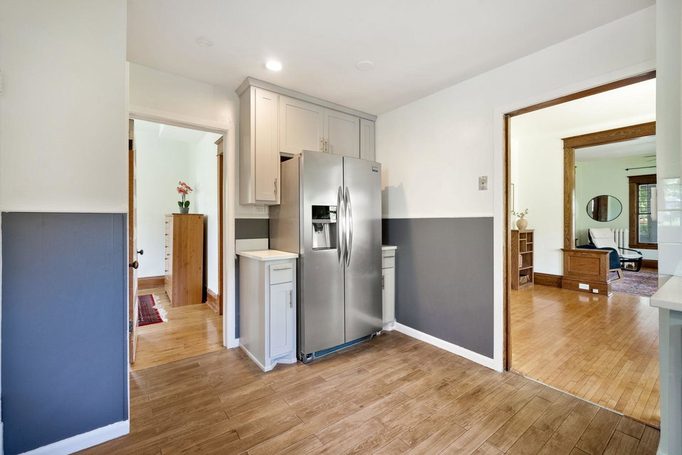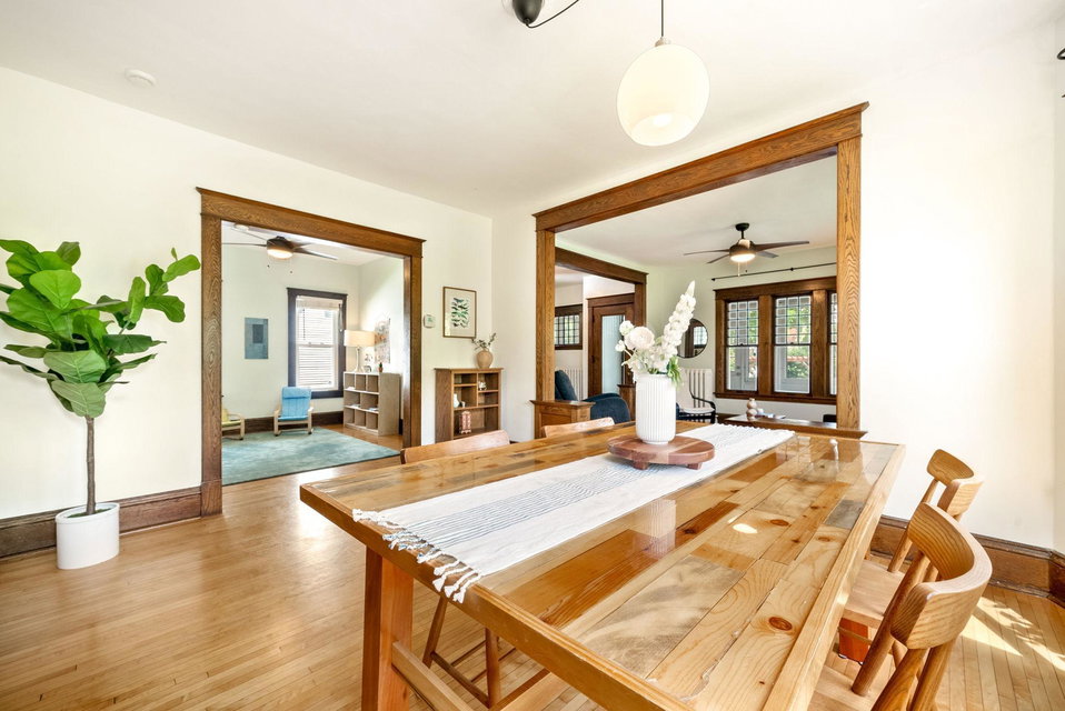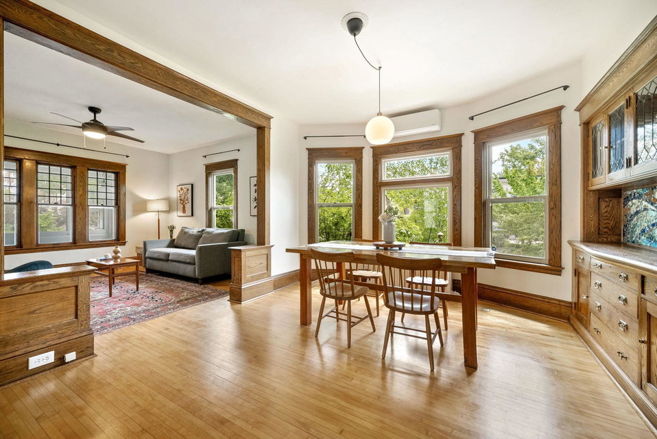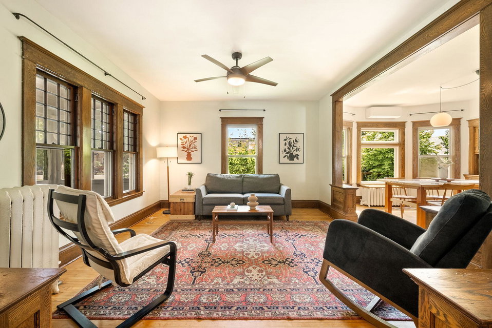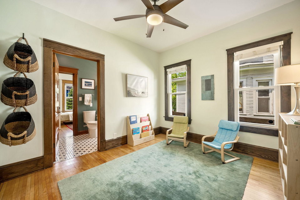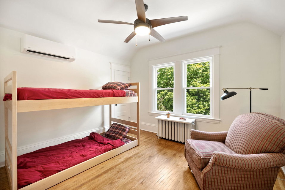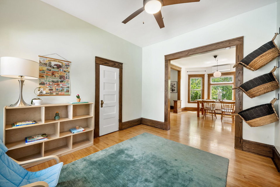 On a uniquely large + professionally landscaped lot sits this 1.5 story home standing tall + confident in updates + functionality while carrying its original glory gracefully. Find tall ceilings, original woodwork in trim + buffet, sprawling + well taken care of wood floors. A spacious entryway, last look mirror closet + living room greet you as you enter. The dining room window overlooks the yard w/perennials, trees, patio. Adjacent to the dining room is a bonus space for play/work/den. The main floor bedroom at the back of the home connects to a completely renovated full bath. The kitchen offers plentiful storage + a 2nd back entry to the deck, easy access from the garage all year long. Two bedrooms on the upper level with the back of the home hosting the LARGE primary suite. The primary includes a large walk in closet, connected second room for office/reading/TV and a 3/4 bathroom. Radiant heat + mini splits keep you comfortable all year. See the extensive list of updates!!!!