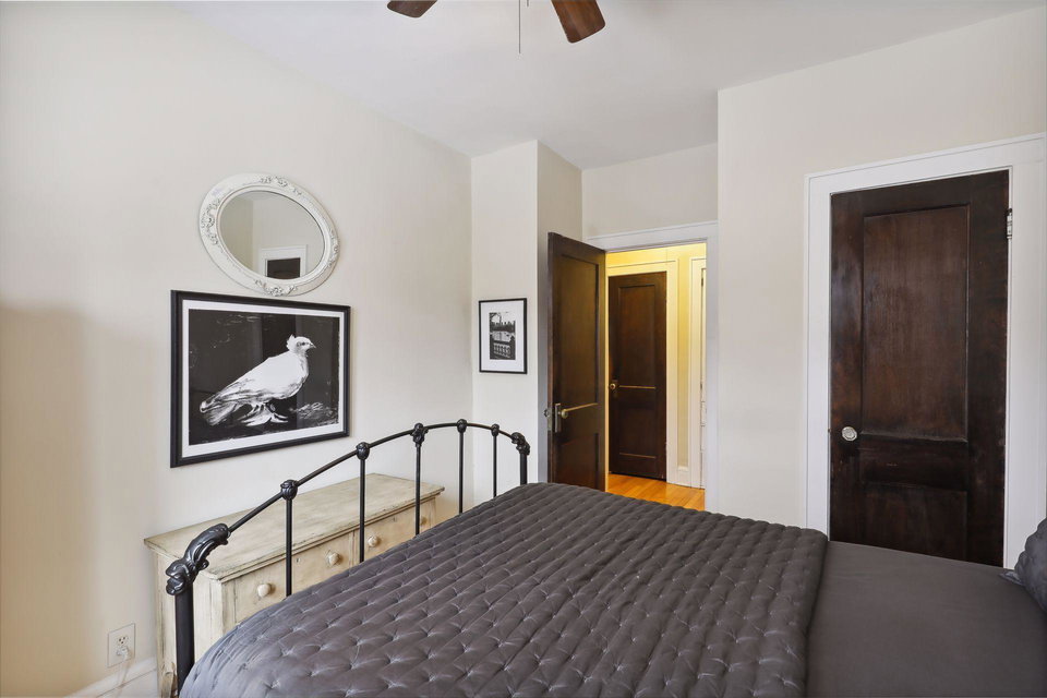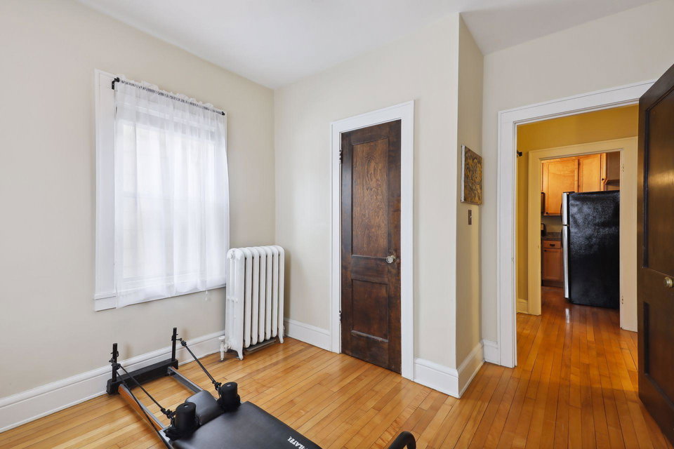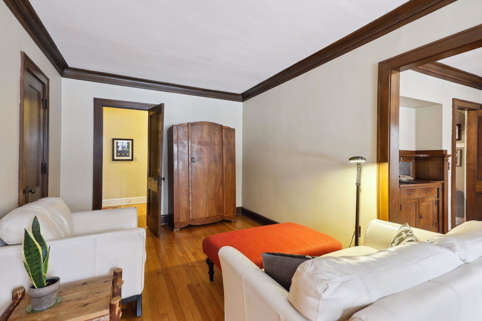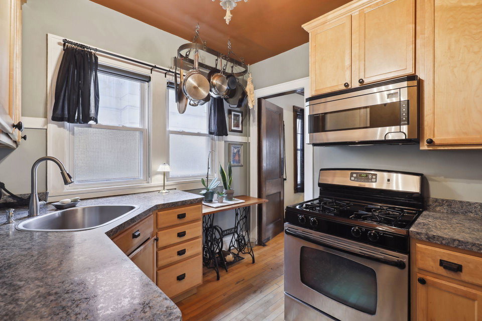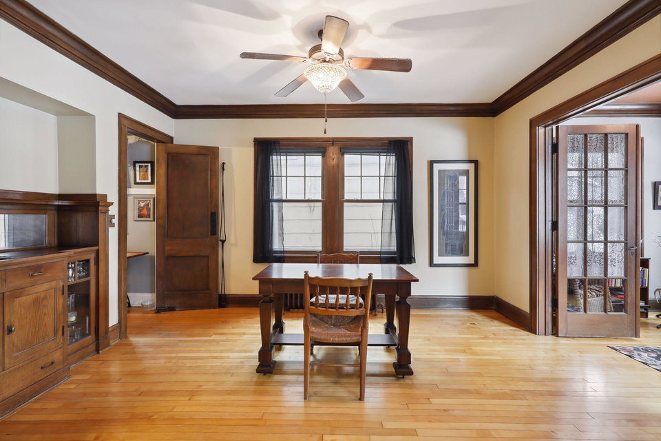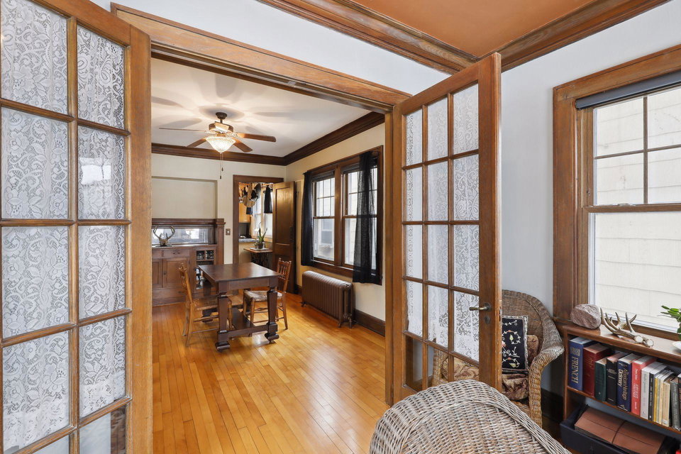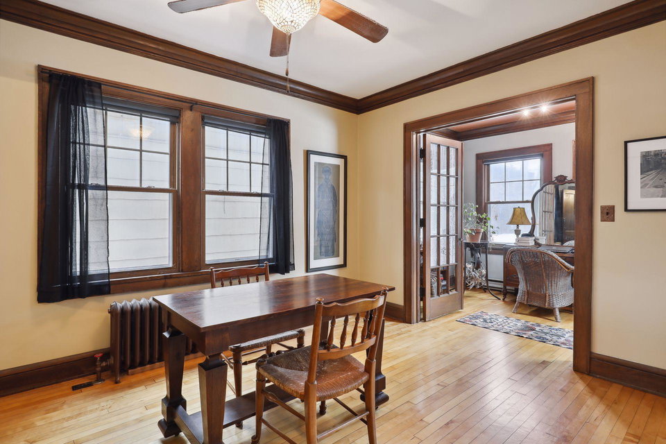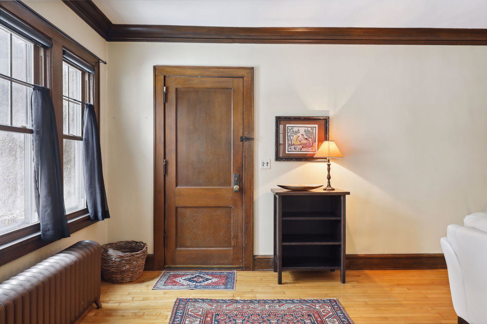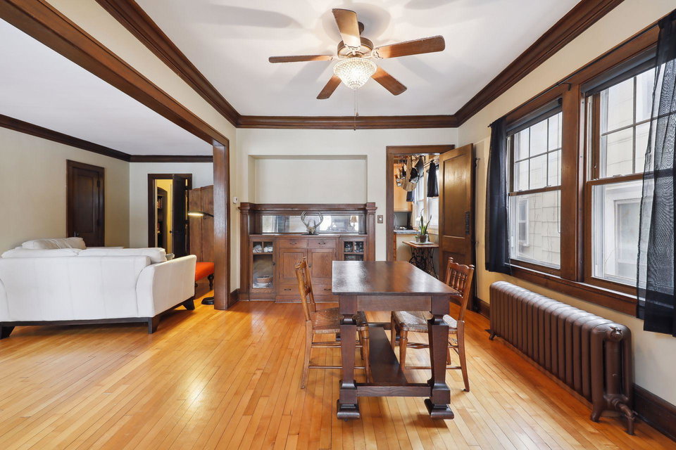 This spacious 2 bedroom condo offers a lovely West-facing sunroom, gleaming hardwood floors, original woodwork, built-in dining room buffet, updated kitchen and charming bathroom. The kitchen features wood cabinetry, stainless appliances, + ample storage & counter space. Great layout that makes this gem feel like a single family home. This classic building is well maintained and the HOA is self-managed. Shared laundry in the clean + dry basement, plus additional storage room. Walk through the common garden to your very own 1 car garage. This vibrant neighborhood offers so many conveniences and great access to nature. Welcome home!