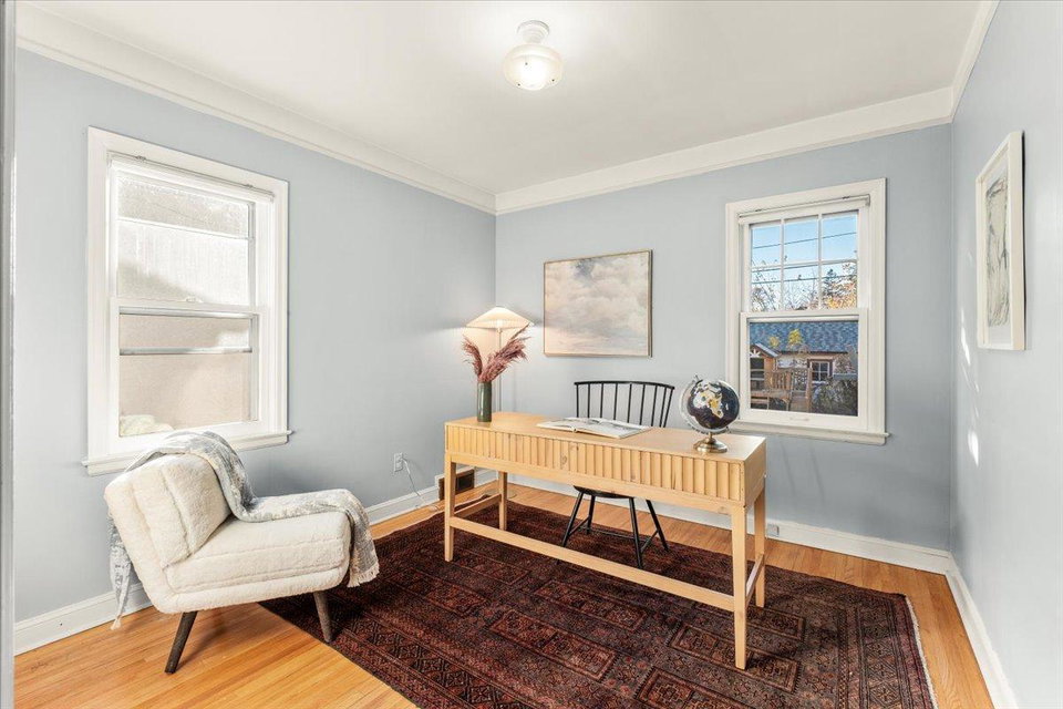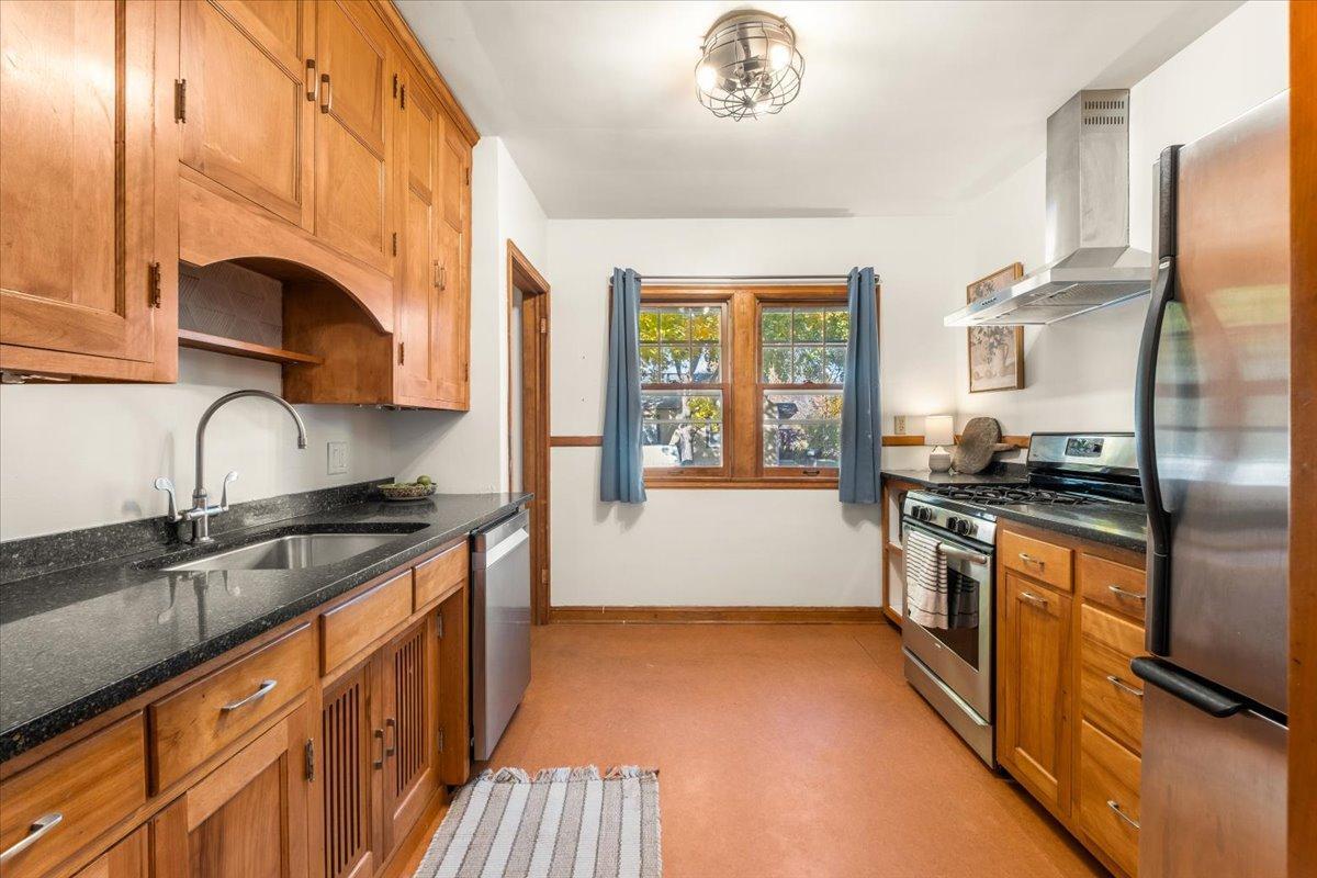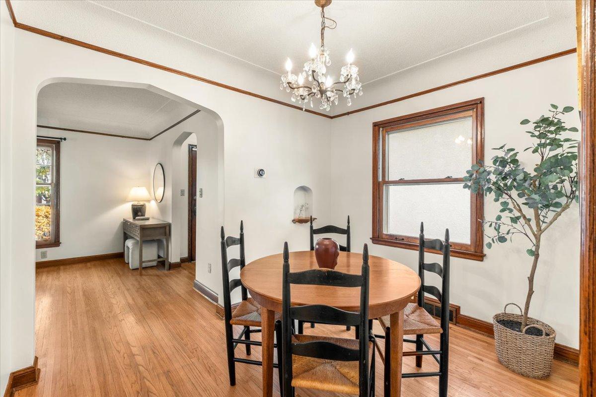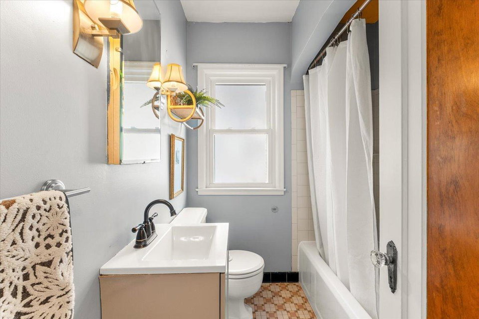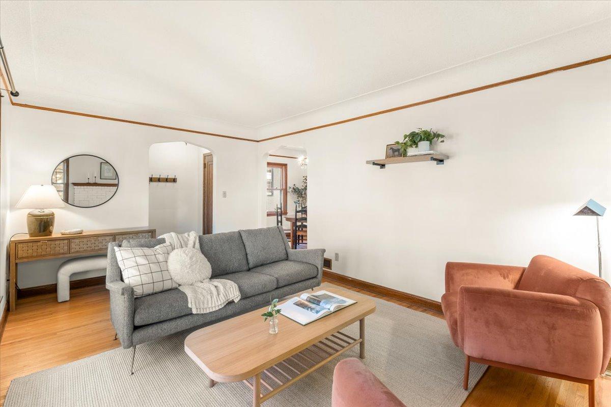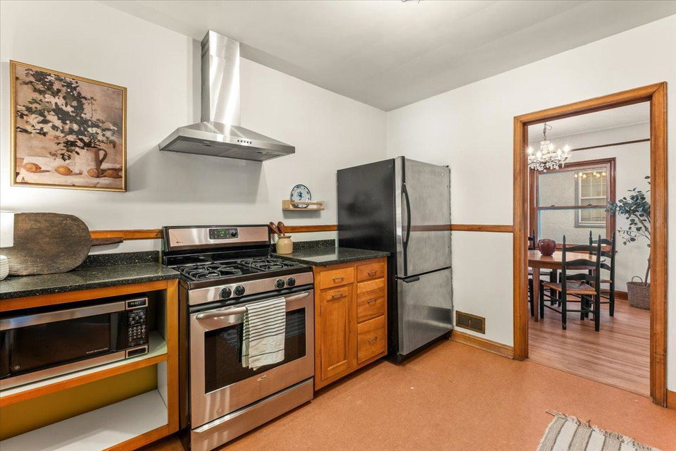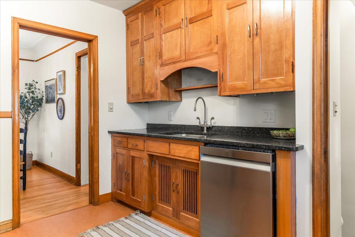 This lovely 4 bed, 1 bath home is bursting with historic character and charm. You’ll find stunning natural woodwork, coved ceilings, and oak hardwood floors preserved throughout. The inviting living room, with its decorative fireplace, flows into a sunny, south-facing dining room—complete with a charming arched wall niche. The modernized kitchen is a thoughtful blend of new and old, featuring quartz counters, stainless steel appliances, and beautiful red birch cabinets!