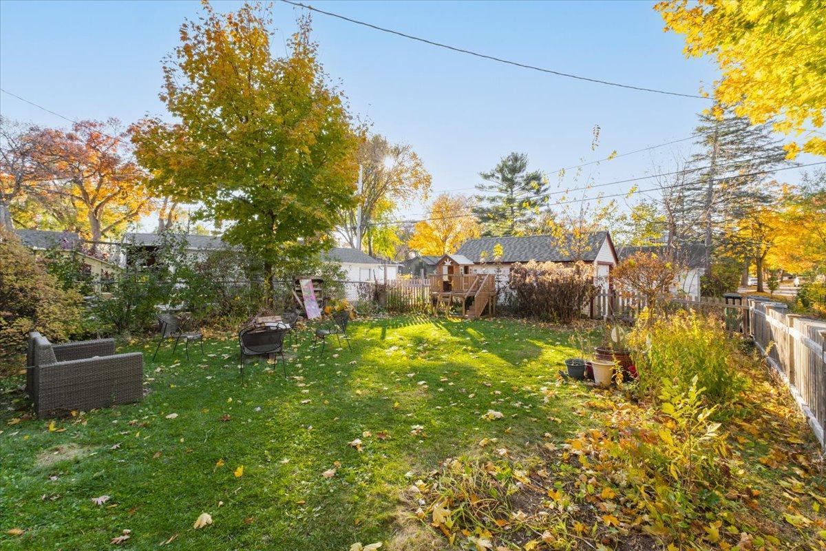 The fenced-in backyard is easy to maintain and offers plenty of space for gardening and hosting.