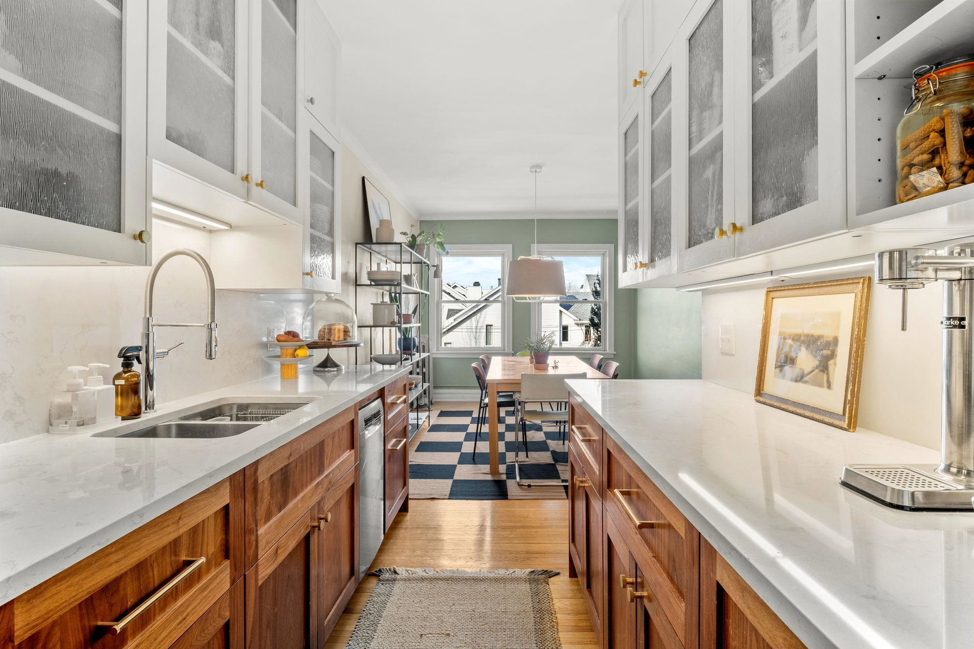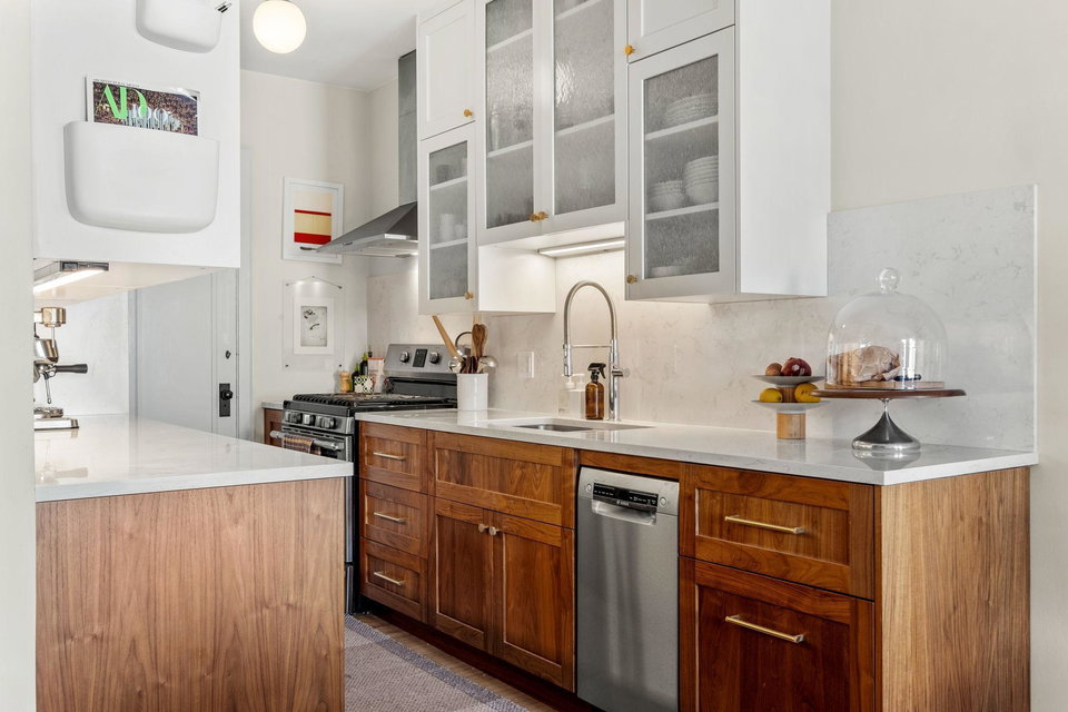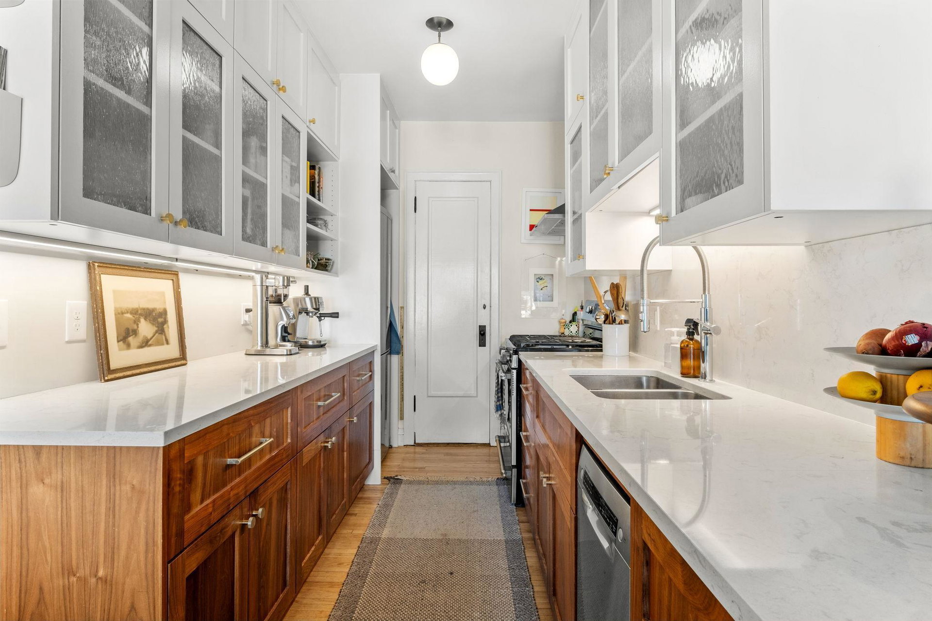 Boasting beautiful hardwood floors throughout, this condo is in pristine condition and features thoughtful updates. The tastefully appointed full bathroom adds a touch of luxury, while modern light fixtures enhance the home’s overall appeal. The renovated galley kitchen, complete with custom cherry cabinets and high-end finishes, provides a sleek, functional space perfect for cooking and entertaining.