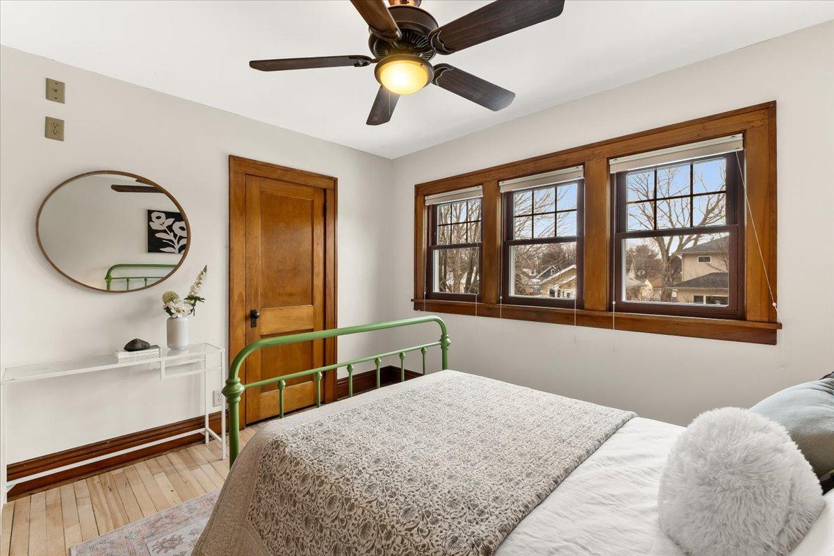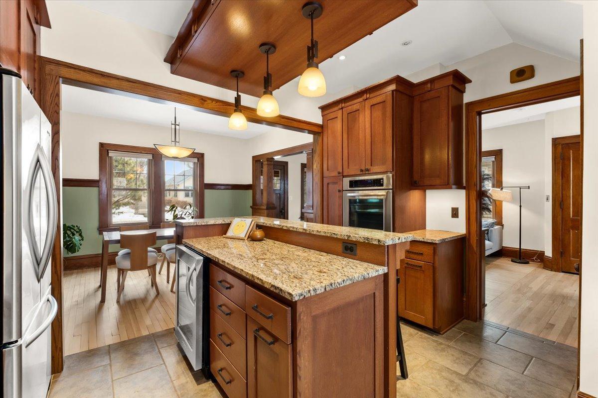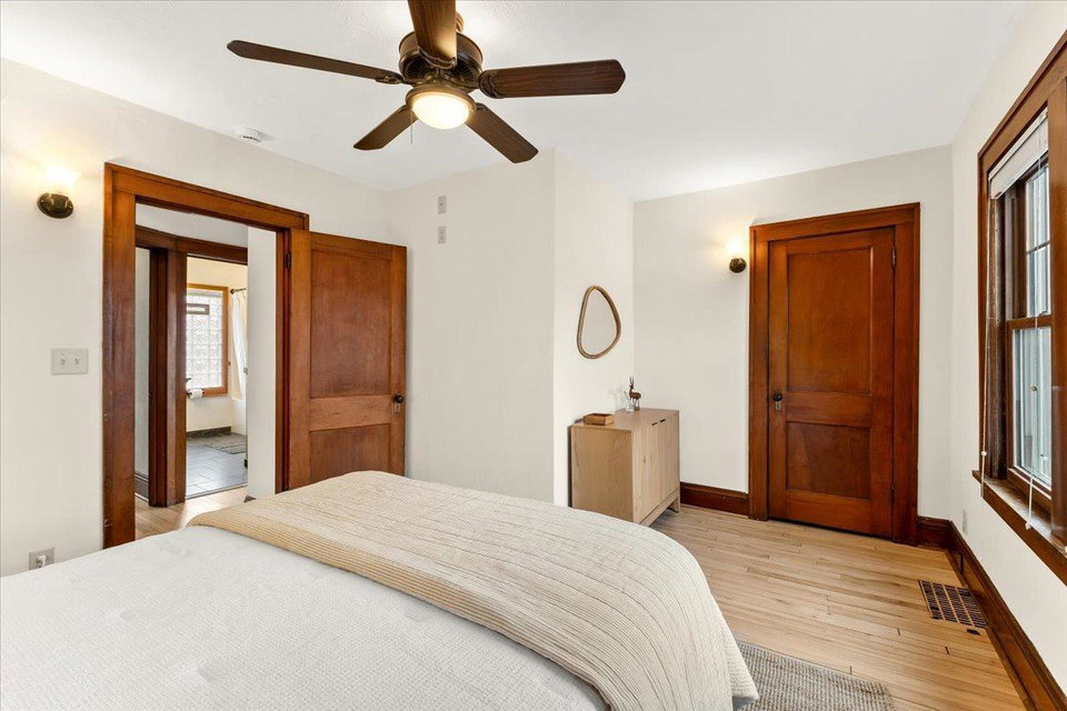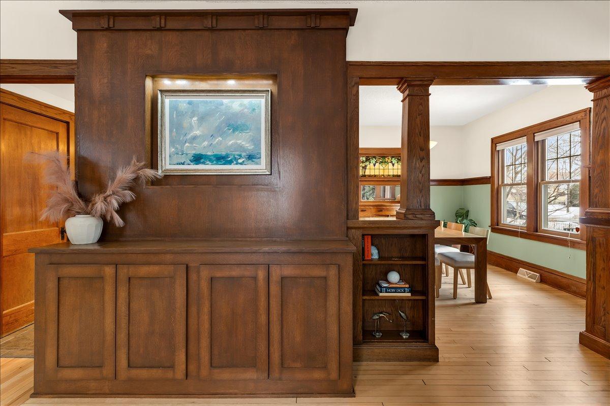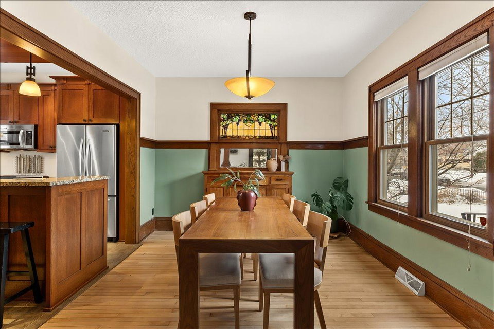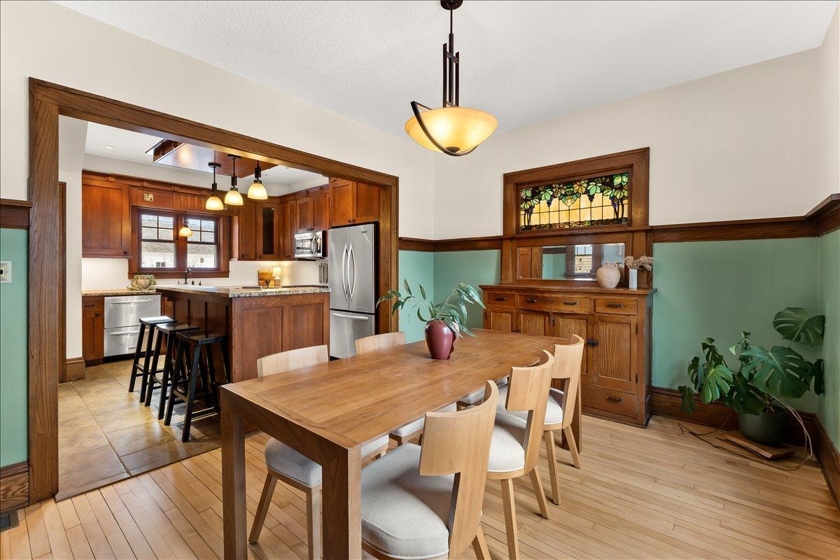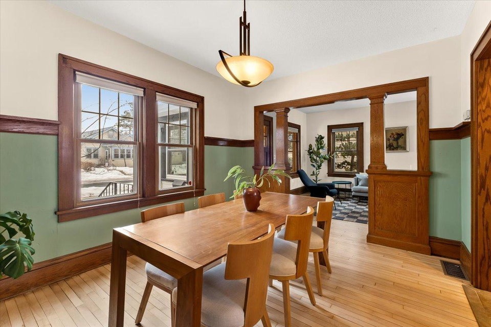 Step in and fall in love with this 1918 Howe Craftsman classic, ready for its next steward. You’ll love the oak millwork, maple hardwood floors, and a beautiful dining room buffet with stain glass window! The kitchen has been remodeled to match the original charm and character of the home while still providing all of the creature comforts you would expect from a modern kitchen. Don’t miss the televisions that rise from living room built-in and kitchen counter! Upstairs are 3 sunny bedrooms, a full bath, and a balcony overlooking the spacious backyard with its stylish, horizontal slat privacy fence. The basement was remodeled to add a family room, home office, and bathroom. New roof 2 years ago, solar panels, and large 2 car garage offer practical functionality to match the home’s charm. Incredibly walkable location steps from Riverview Theater, Lynette, and the Mississippi River.