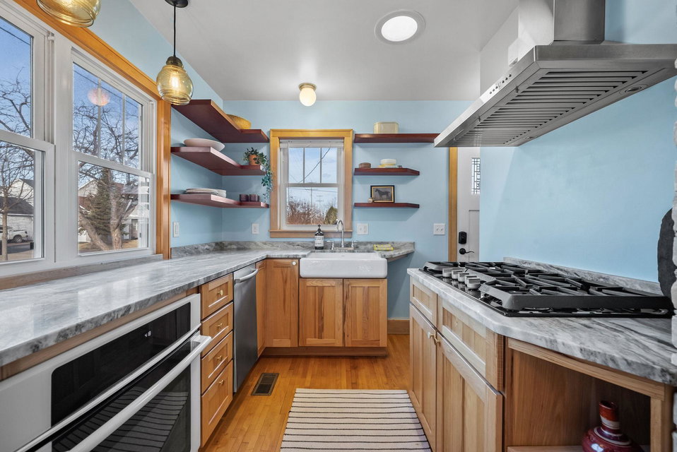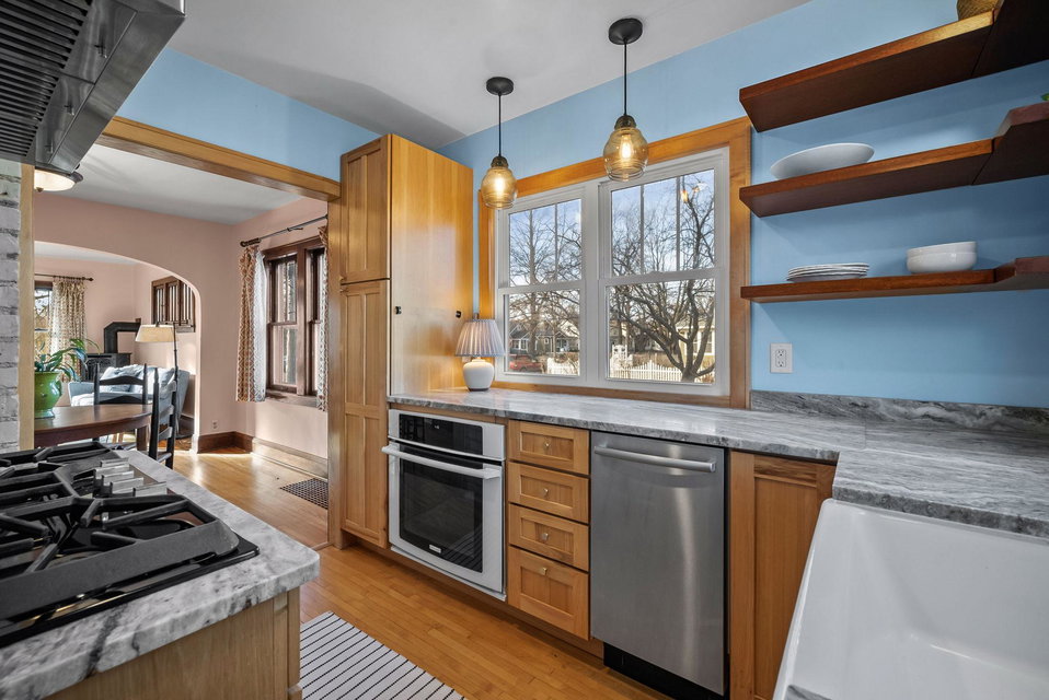 over 10 years, this adorable Craftsman Bungalow located in the Standish neighborhood in South Minneapolis is ready for new stewards. Step inside to a spacious entry leading to the cozy living room with a gas burning wood stove for cold winter evenings. The classic, open floor plan features hardwood floors and original woodwork throughout, with two bedrooms and one bath on the main level. The updated, cheery kitchen boasts custom hickory cabinets, granite countertops, mahogany open shelving, stainless steel appliances, and lots of natural light!