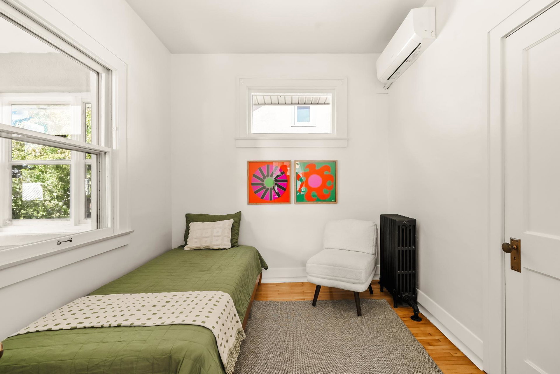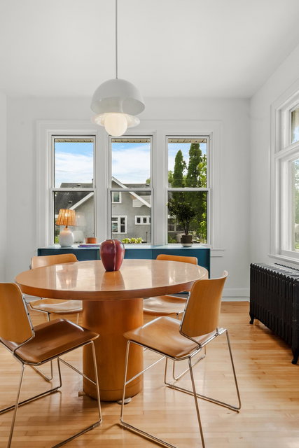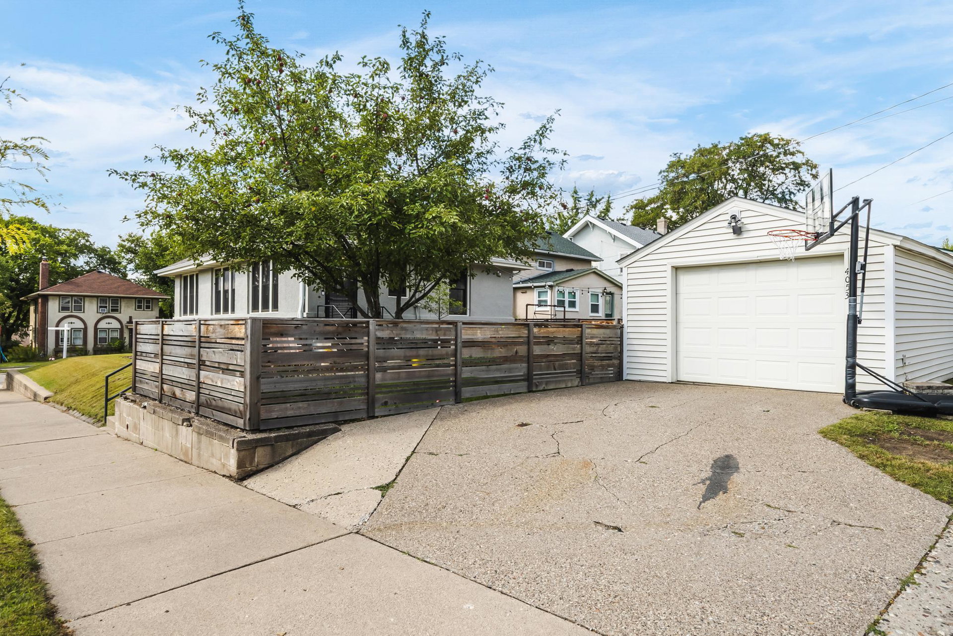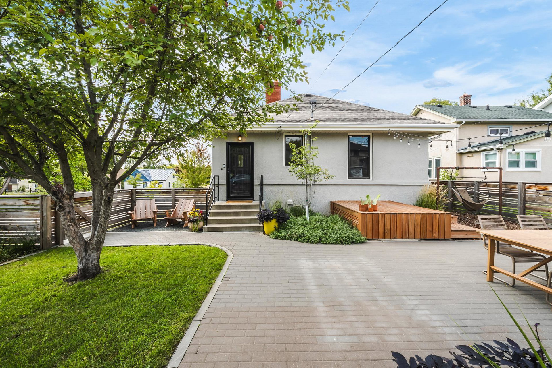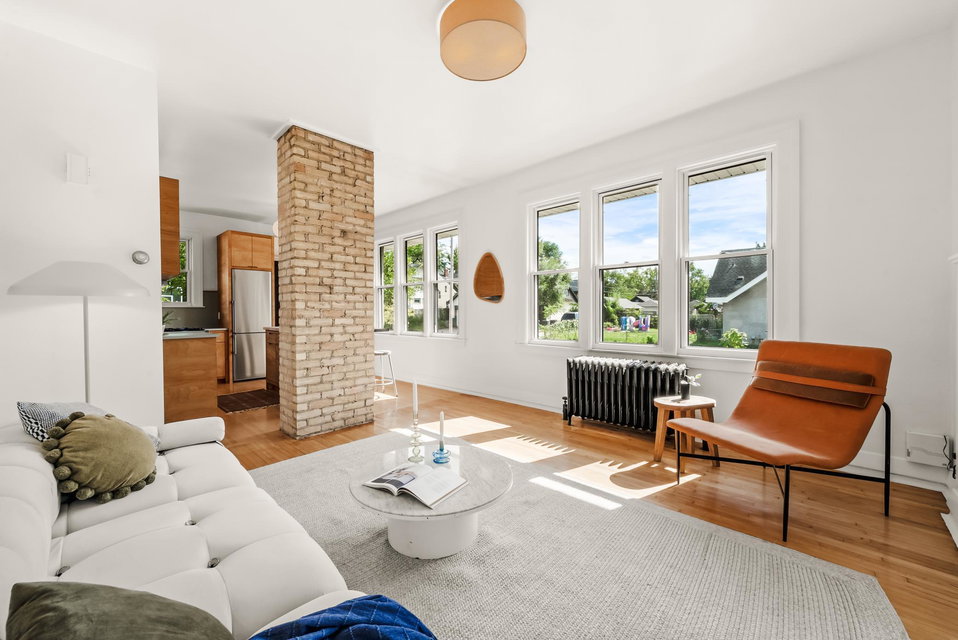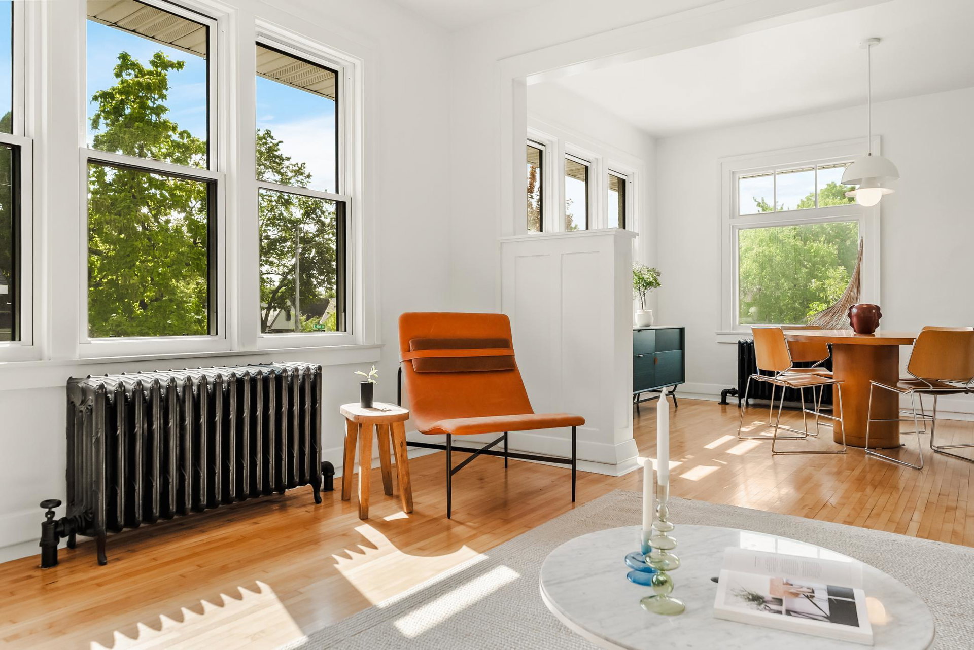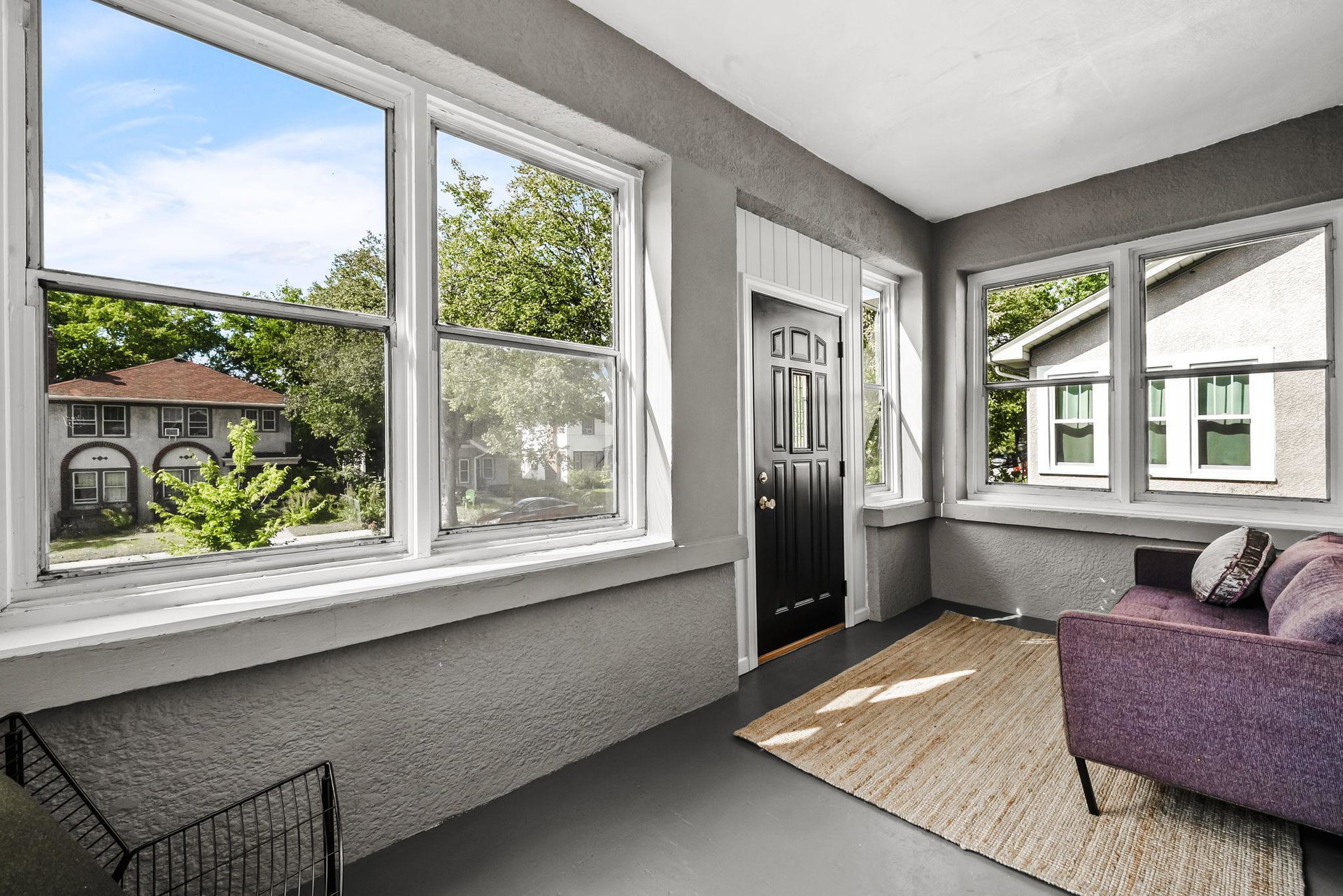 Perched proudly on a corner lot, this thoughtfully updated 3 bedroom one-story craftsman rambler is stylish and unique. The living room, dining room, and kitchen are an open and inspiring layout, bathed in natural light through large south-facing windows. You will find a beautiful balance of classic character and contemporary updates including exposed brick, sleek detailed radiators, gleaming wood floors, built-in bookcases, deco baseboards, simple but sculptural light fixtures, custom red oak cabinetry, blue-toned counters and backsplash, and a warm butcher block island anchoring the kitchen. All three bedrooms are situated along the north side of the home, offering cozy retreats. The two rear bedrooms are centered around a beautifully updated full bath with a deep clawfoot tub and porcelain sink, and wood paneled walls grounding the space. Step downstairs to a fun and unexpected surprise, a large finished family room with tall ceilings and a custom built, solid wood, queen-sized lofted bed that makes the space extra special and functional for guests, reading, or forts! There is plenty of space for kids to romp around or for all to lounge or work AND this space is also soaked in natural light all day long. With radiant heat and four mini split units, you will be comfortable all year long. Enjoy sunny or rainy nights on the cozy and private front porch or entertain in your backyard. The backyard may be modest in size, but it makes a big impression. Designed for maximum enjoyment and completely fenced in with a cedar fence, the space features a beautifully landscaped brick patio perfect for dining or lounging, a raised deck ideal for soaking up the sun, a vibrant collection of mature perennials that bring color and life throughout the seasons and a joyful fruit bearing apple tree offering some shade. Watch in awe, all spring and summer, the dinner plate hibiscus flowering in the south facing garden framed by more perennial grasses and flowers. Drive right in to your well appointed 1 car garage. This house and neighborhood have GREAT energy! Located one block from the bicycle boulevard, in the Barton/Justice Page/Washburn community schools zone. Come see this lovingly cared for and low maintenance delight in South Minneapolis!