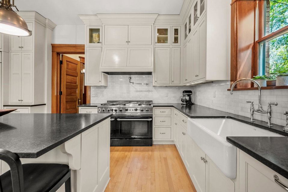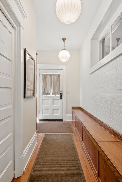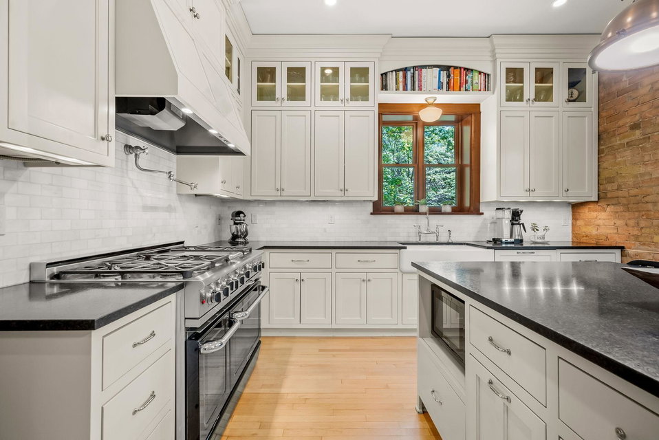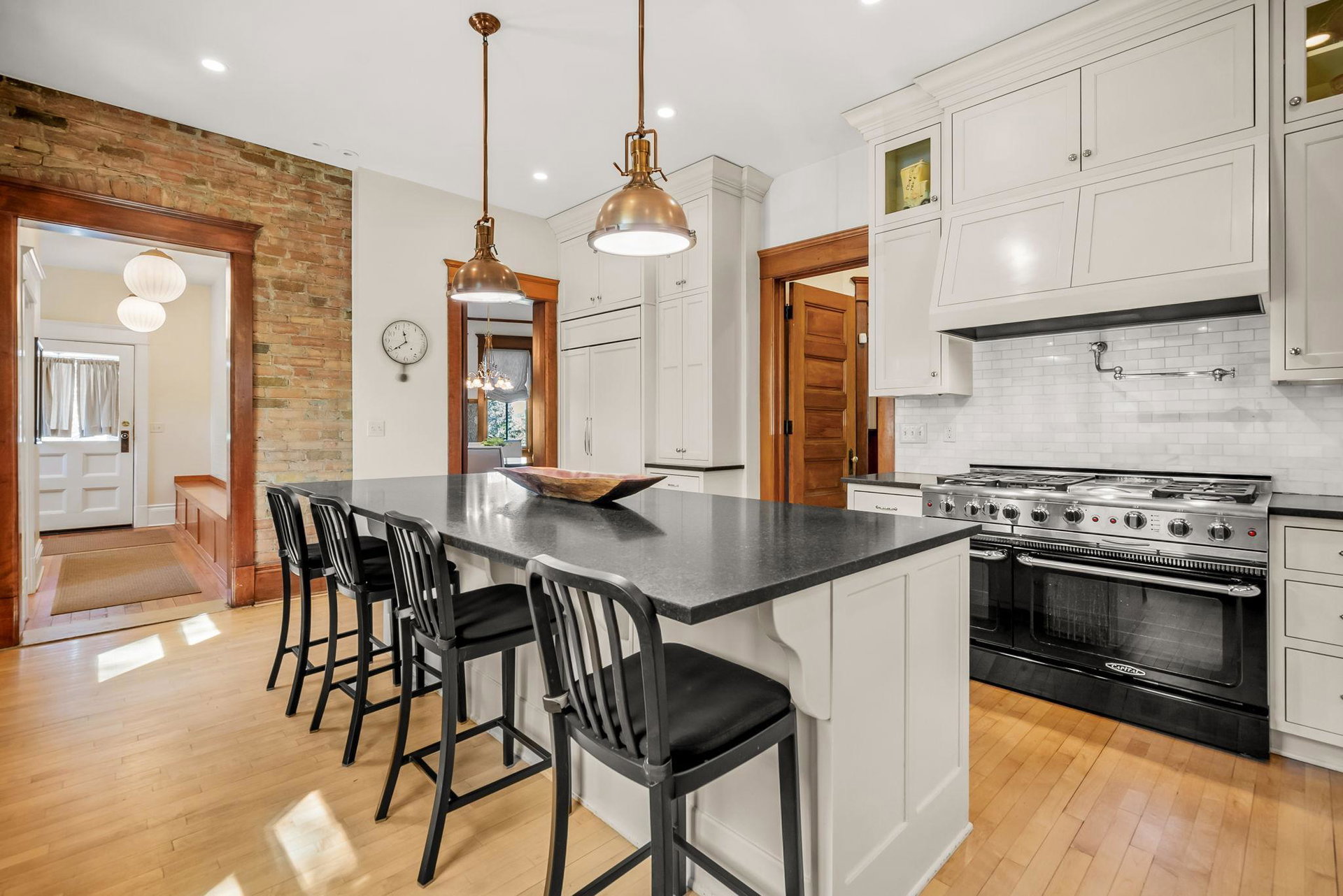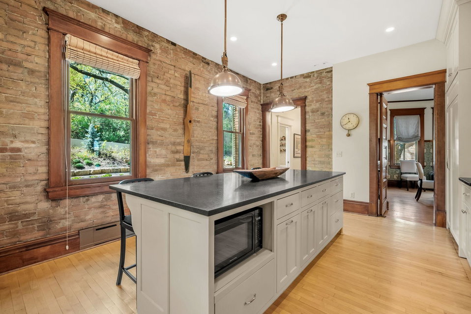 Designed with flexible spaces and great flow, it’s perfect for work-from-home setups, hosting gatherings, or everyday living. The custom kitchen highlights the home’s impressive full masonry construction, with exposed brick as a striking focal point, complemented by honed granite countertops, high-end appliances, and bespoke cabinetry.