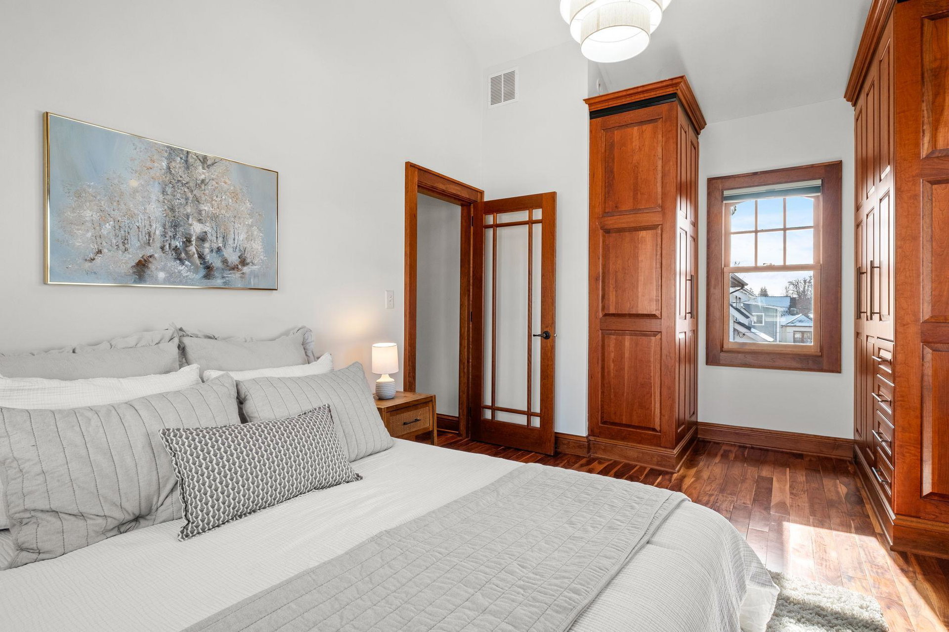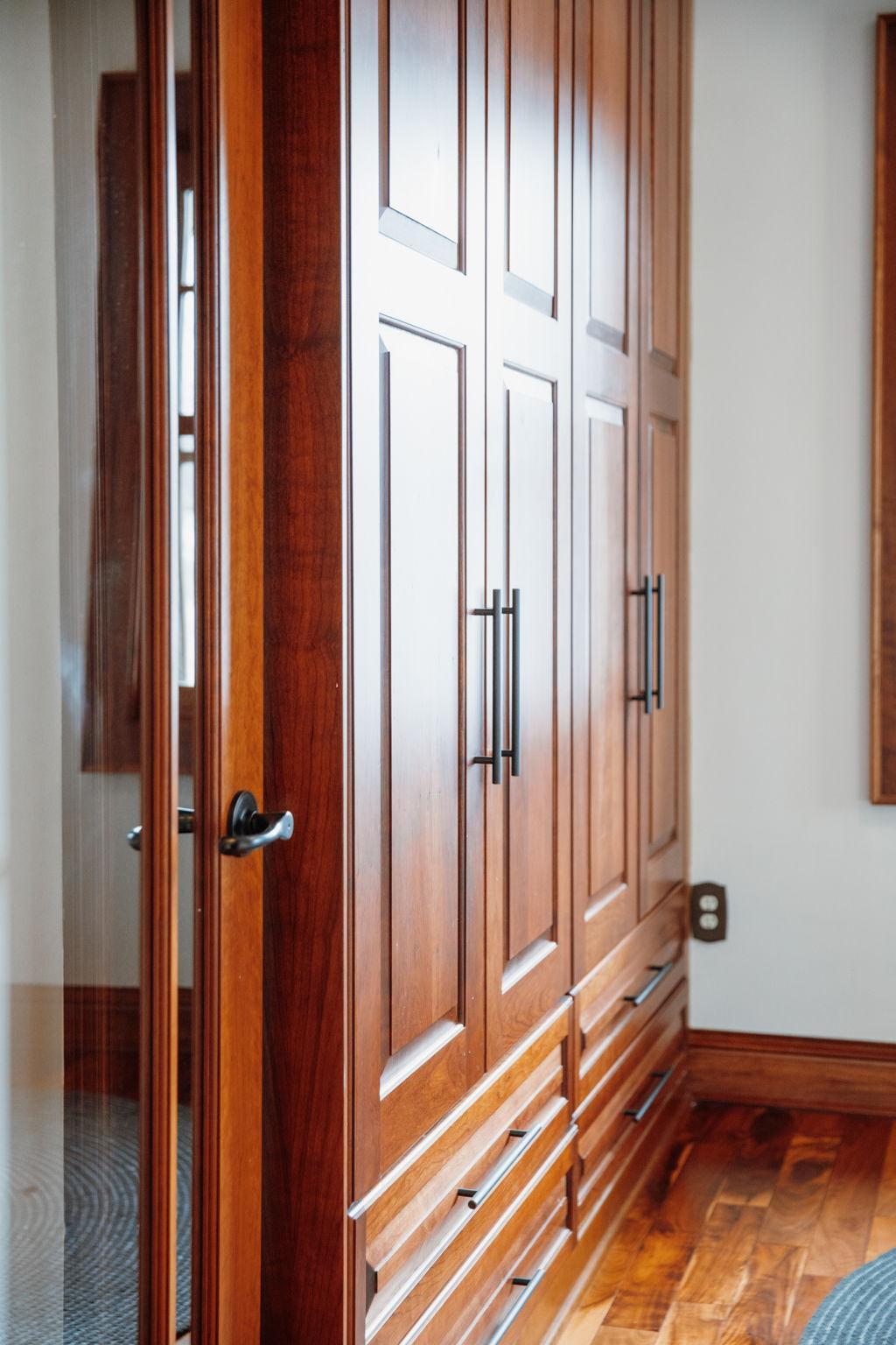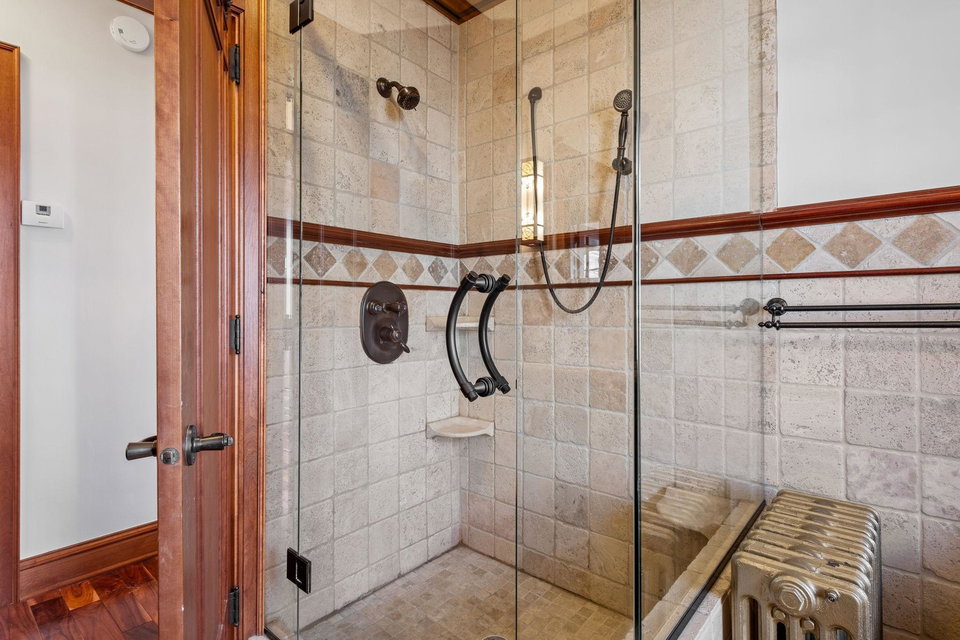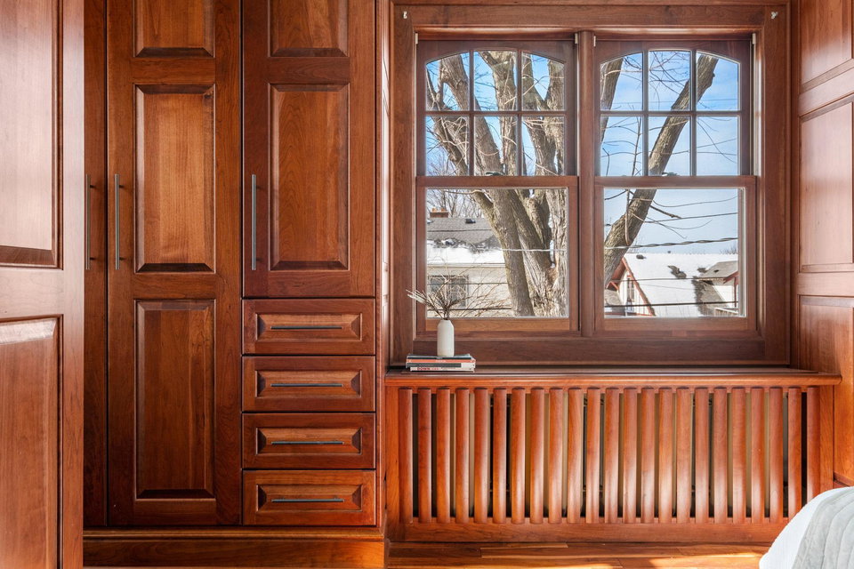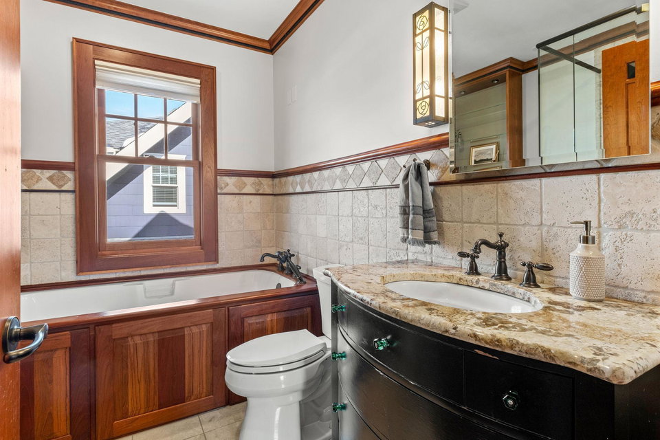 The main level also includes a convenient powder room, mudroom, and a cleverly tucked-away laundry area. Upstairs, you’ll find four generous bedrooms, featuring dramatic vaulted ceilings and more exquisite cherry built-ins. The oversized, luxurious bathroom includes a jacuzzi tub and a separate walk-in shower.