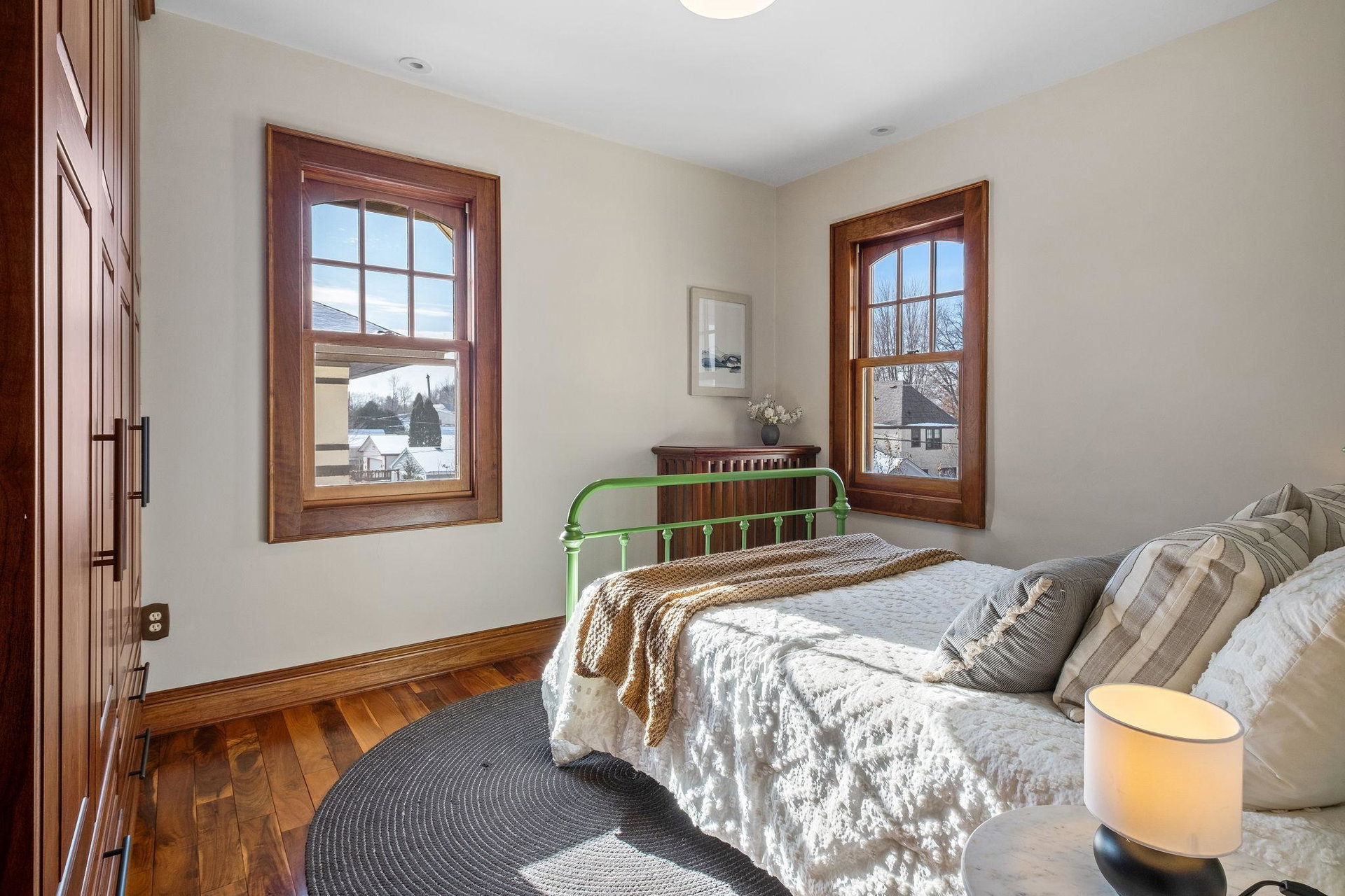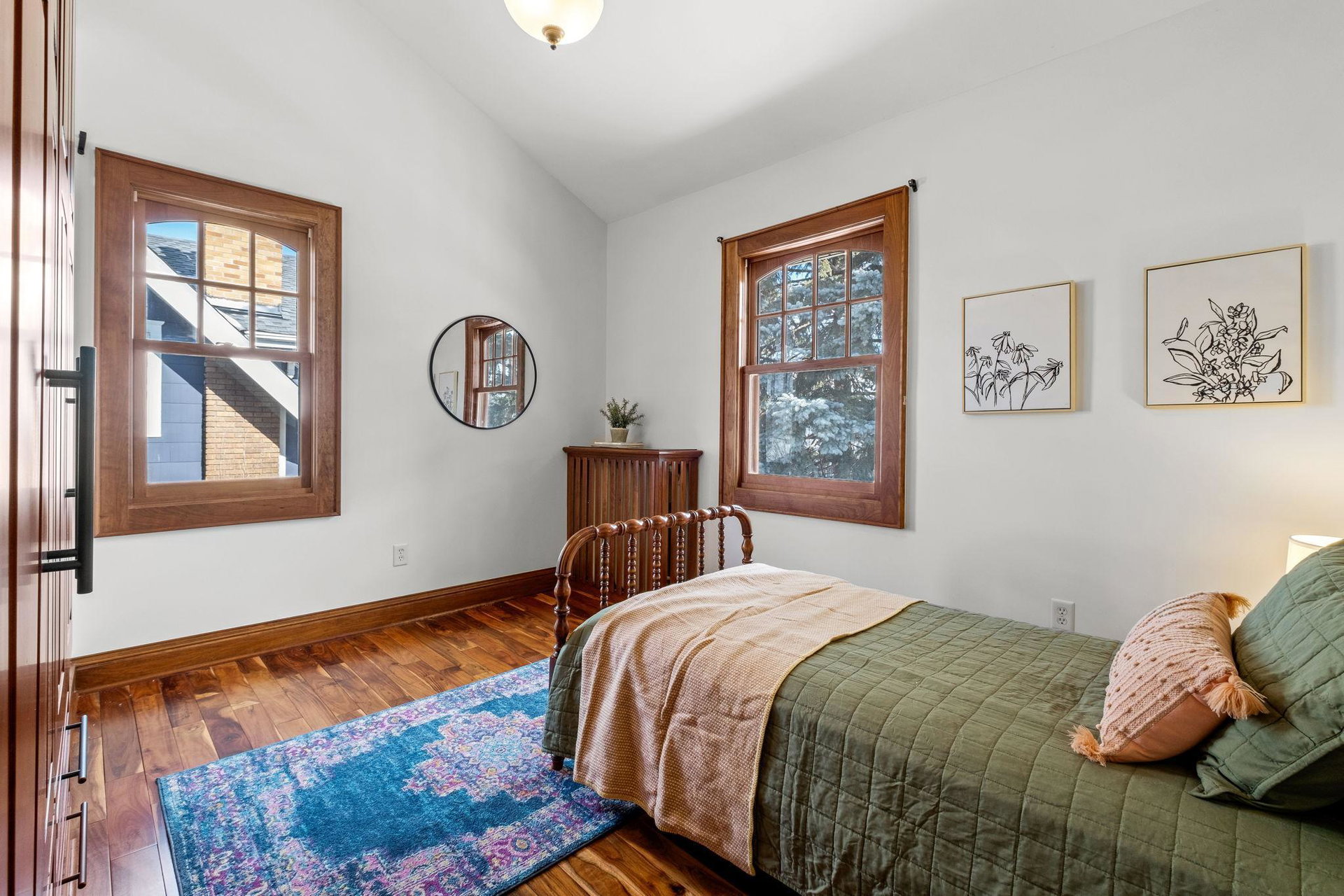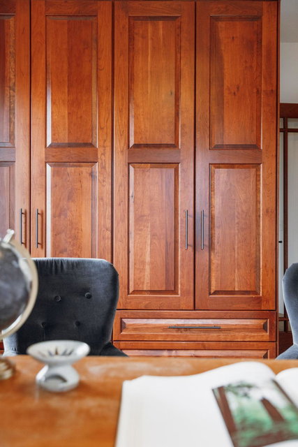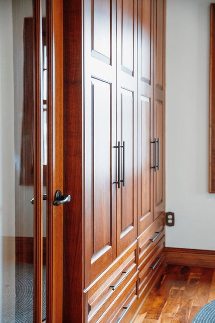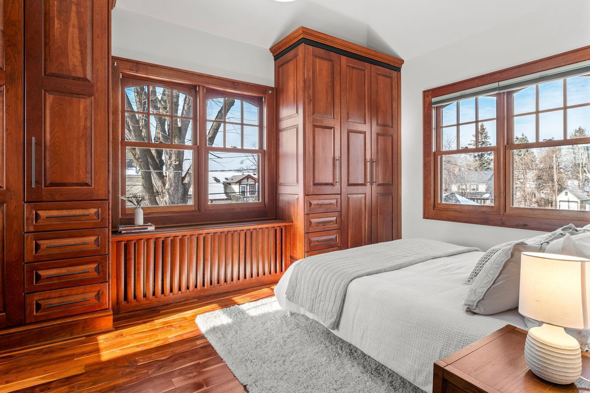 The main level also includes a convenient powder room, mudroom, and a cleverly tucked-away laundry area. Upstairs, you’ll find four generous bedrooms, featuring dramatic vaulted ceilings and more exquisite cherry built-ins. The oversized, luxurious bathroom includes a jacuzzi tub and a separate walk-in shower.