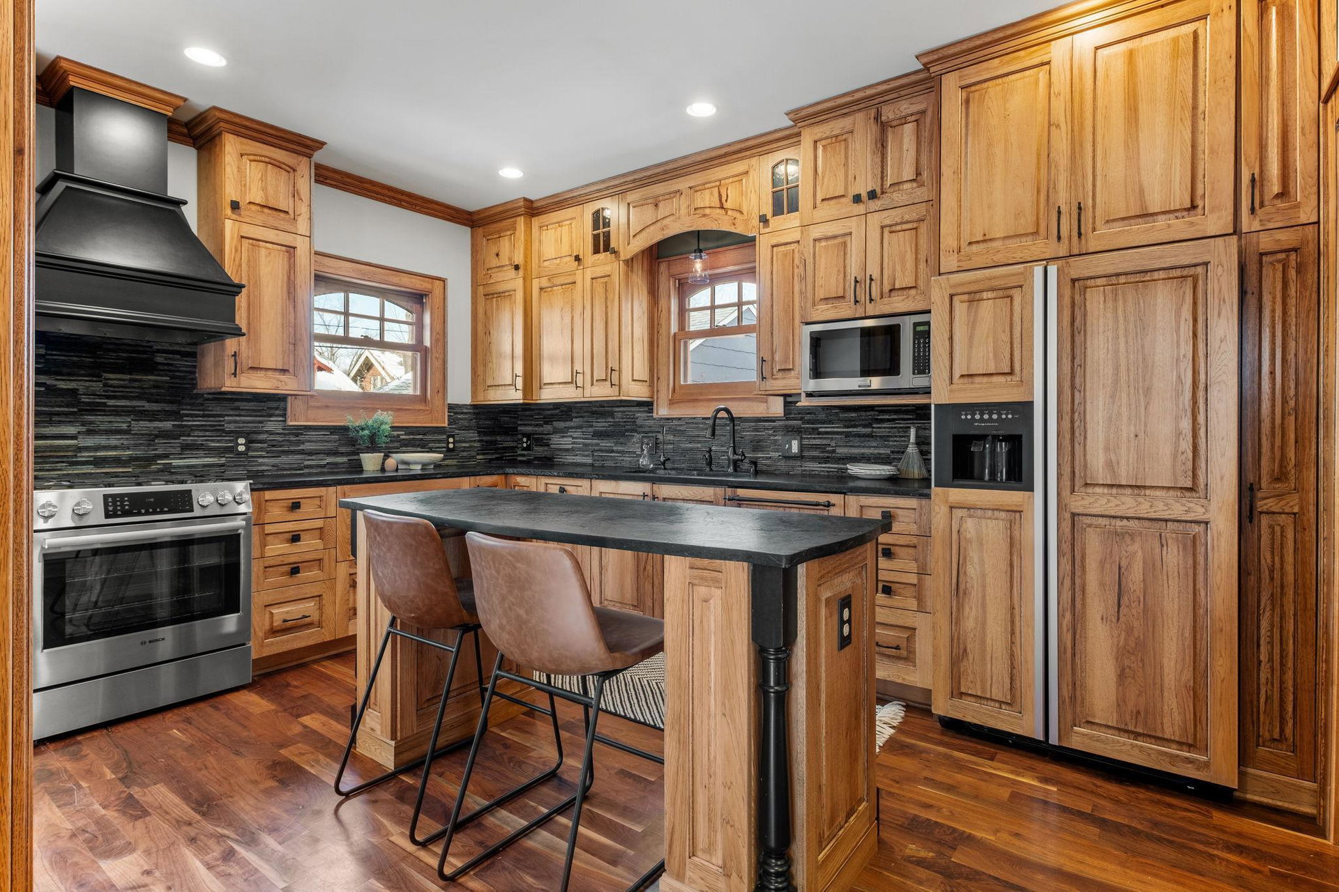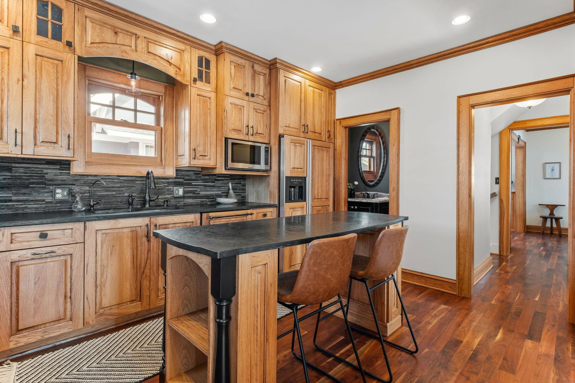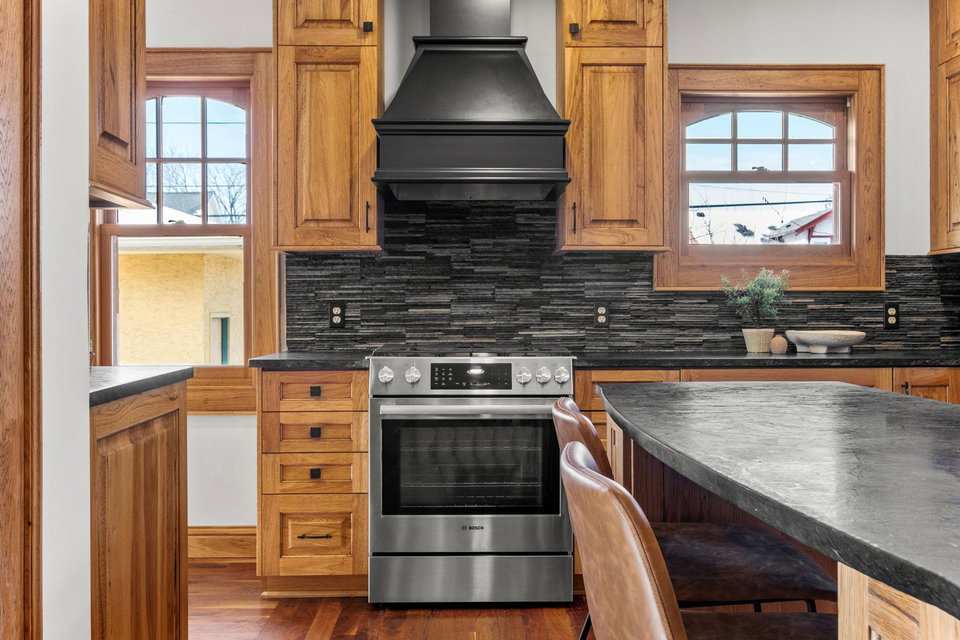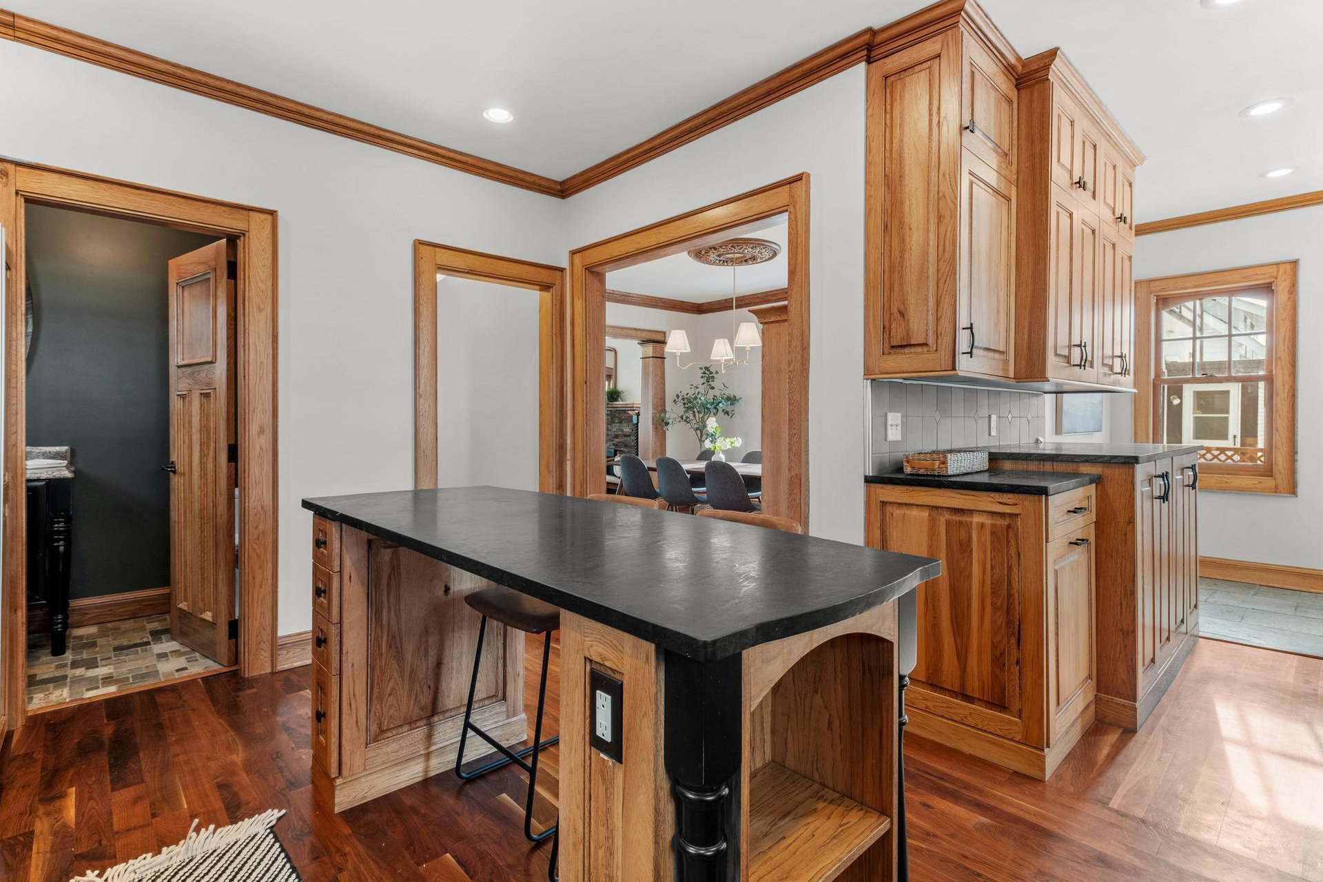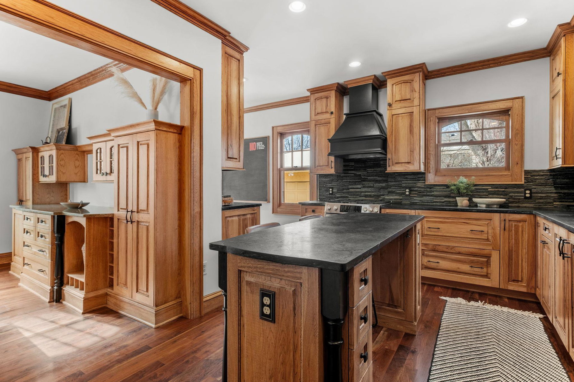 Upon entering, you’ll immediately appreciate the home’s thoughtful layout, with beautiful cherry hardwood floors and rich Hickory millwork accented by elegant ebony touches. The cozy gas fireplace with its stunning stone surround creates a warm and inviting atmosphere in the living room. The spacious, bright formal dining room features sophisticated custom built-ins, adding both style and function. The decadent kitchen is a true chef’s dream, offering ample storage, custom hickory cabinetry, and stunning soapstone countertops.
