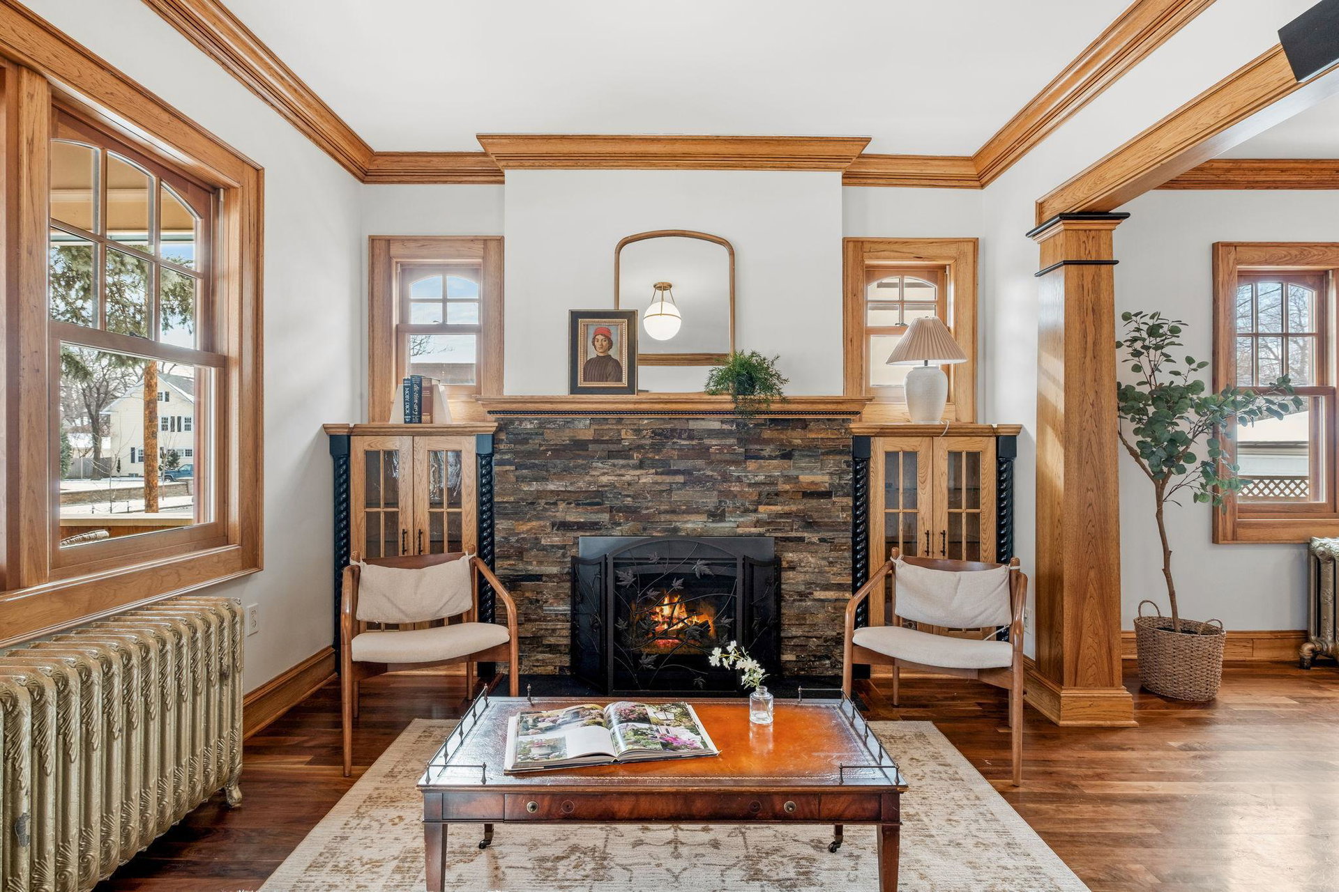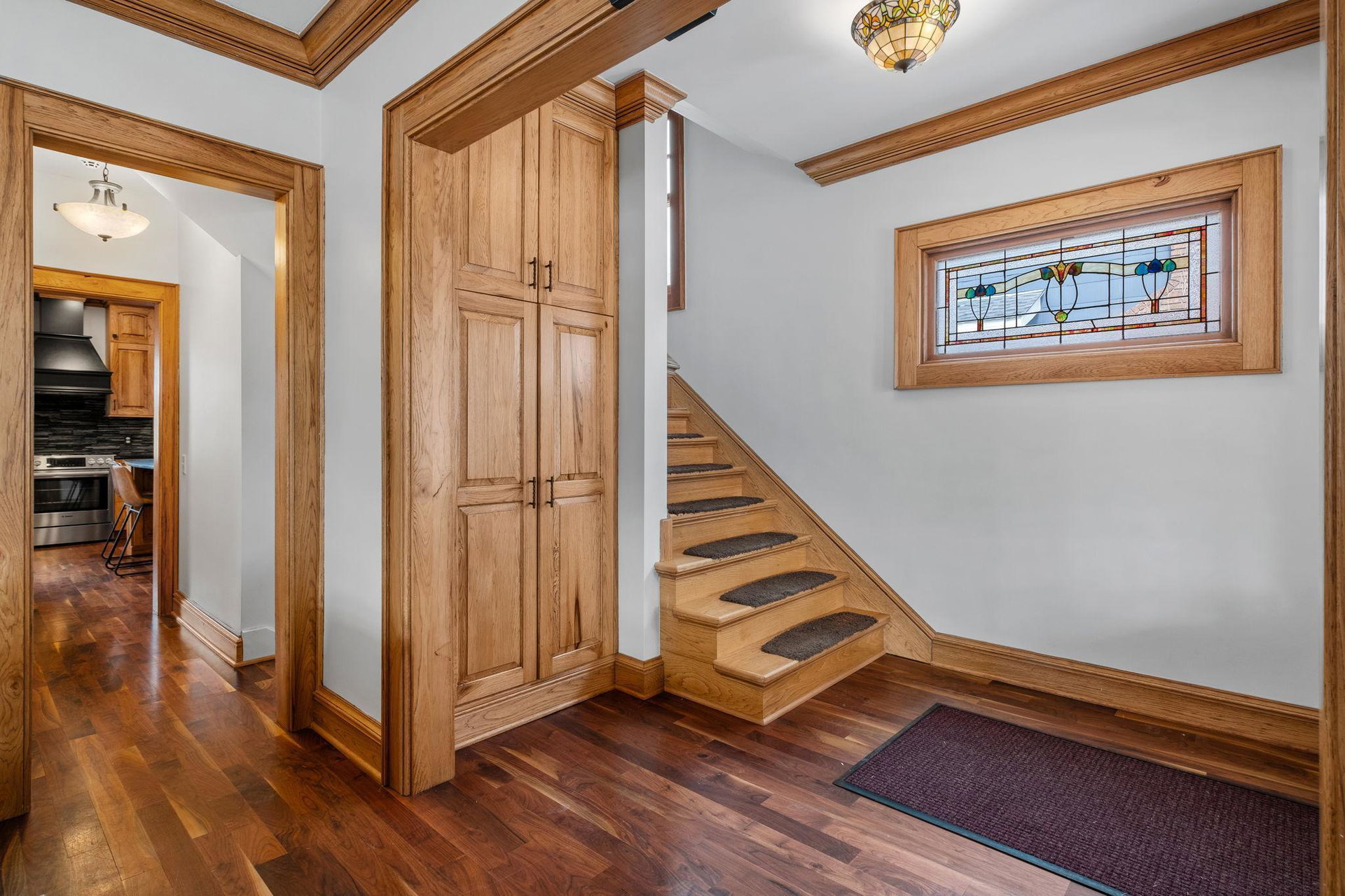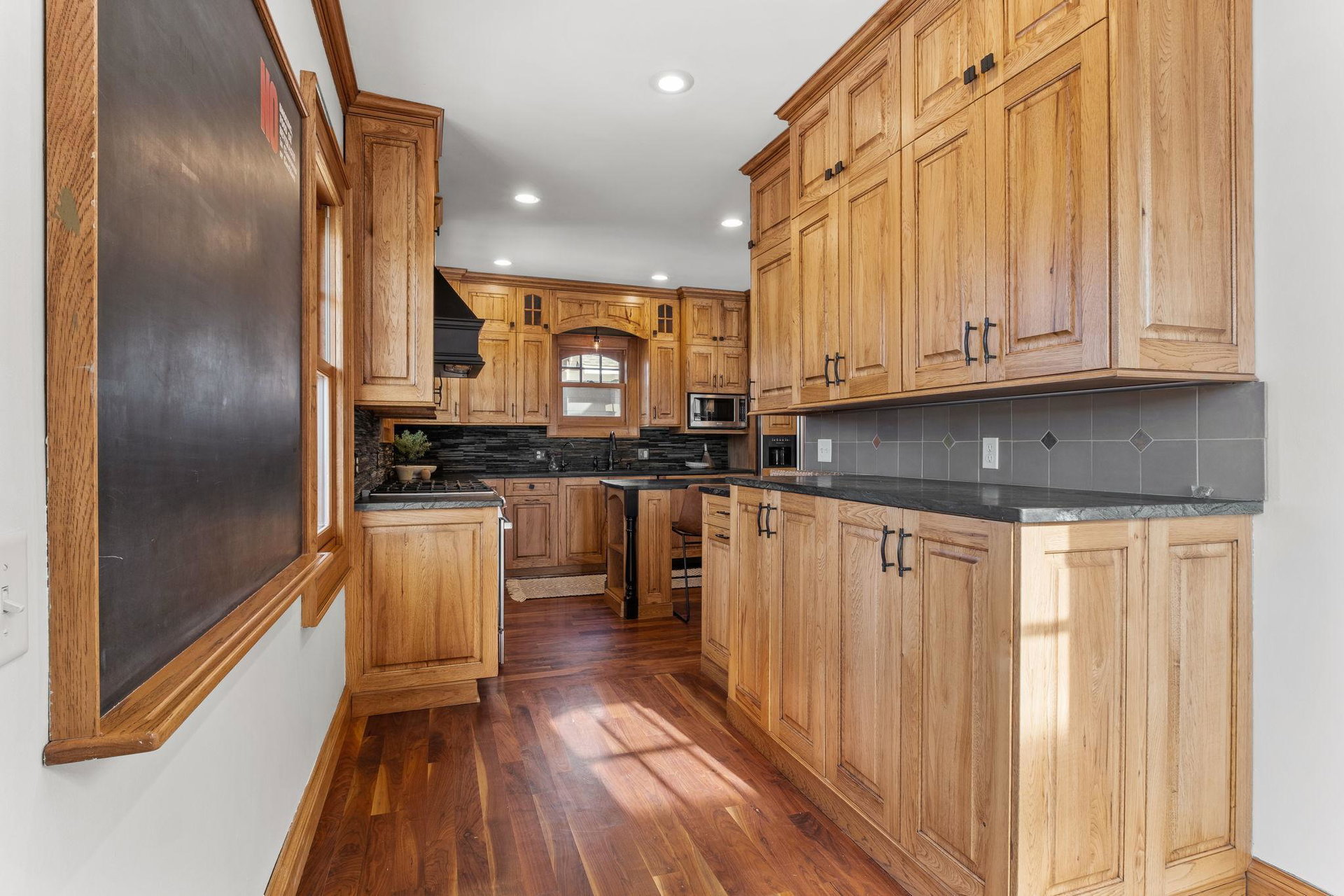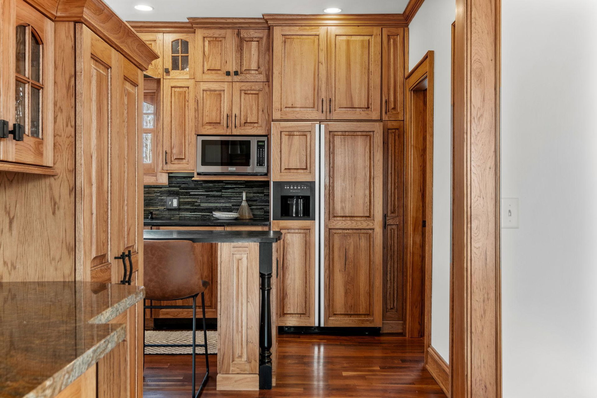 Upon entering, you’ll immediately appreciate the home’s thoughtful layout, with beautiful cherry hardwood floors and rich Hickory millwork accented by elegant ebony touches. The cozy gas fireplace with its stunning stone surround creates a warm and inviting atmosphere in the living room. The spacious, bright formal dining room features sophisticated custom built-ins, adding both style and function. The decadent kitchen is a true chef’s dream, offering ample storage, custom hickory cabinetry, and stunning soapstone countertops.