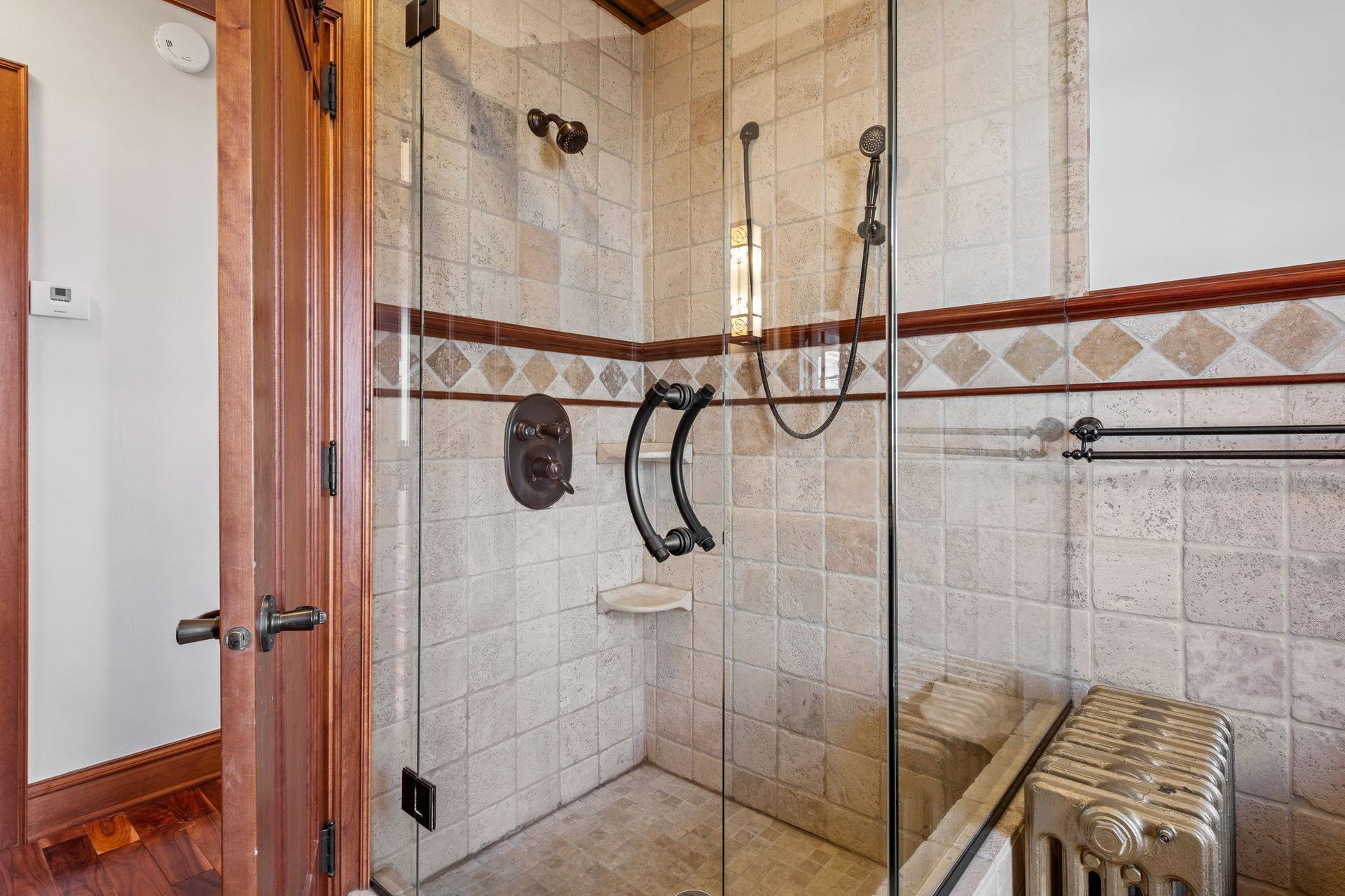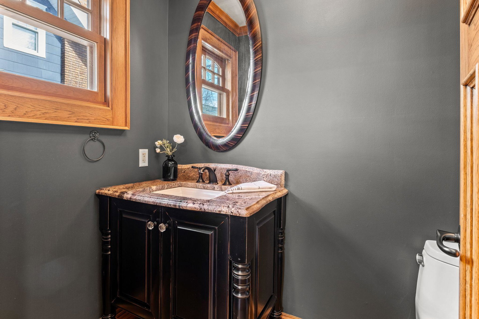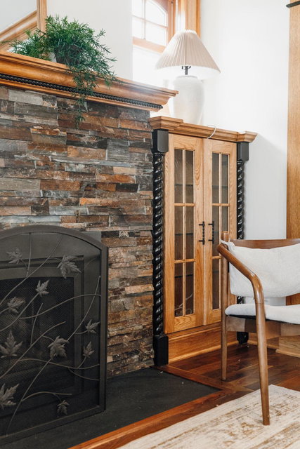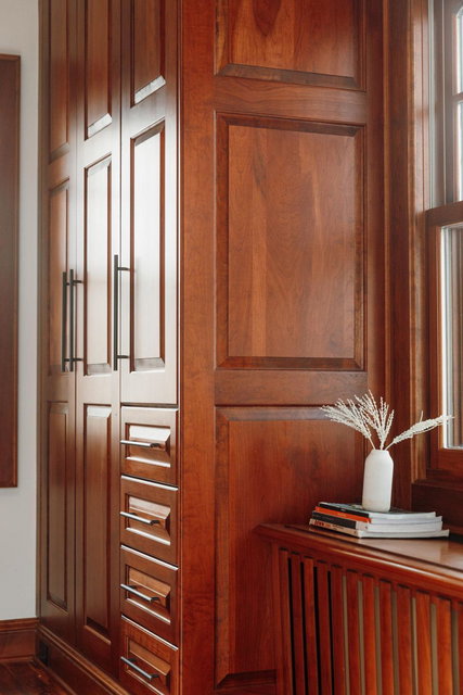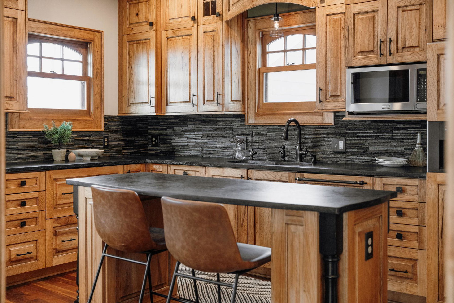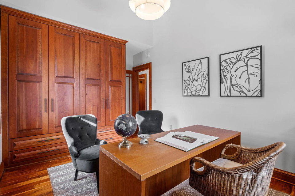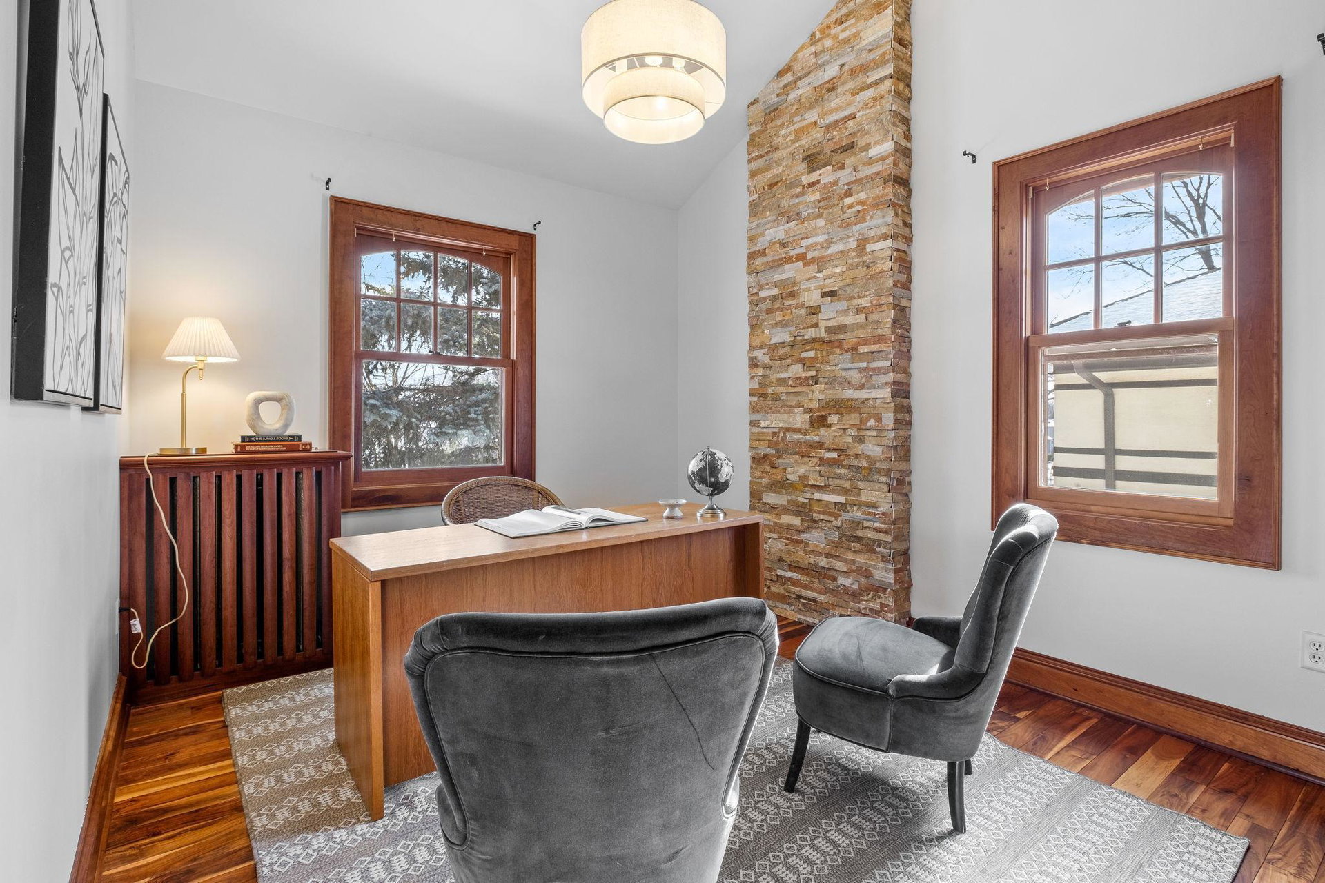 Upon entering, you’ll immediately appreciate the home’s thoughtful layout, with beautiful cherry hardwood floors and rich Hickory millwork accented by elegant ebony touches. The cozy gas fireplace with its stunning stone surround creates a warm and inviting atmosphere in the living room. The spacious, bright formal dining room features sophisticated custom built-ins, adding both style and function. The decadent kitchen is a true chef’s dream, offering ample storage, custom hickory cabinetry, and stunning soapstone countertops.