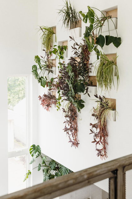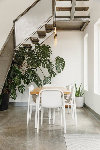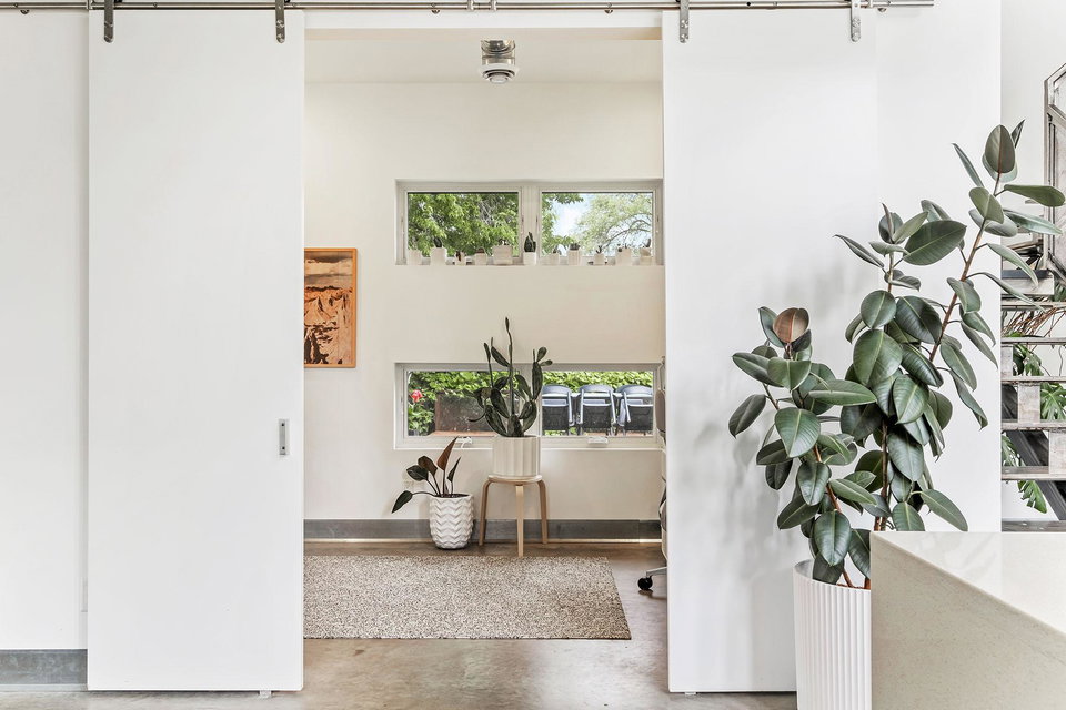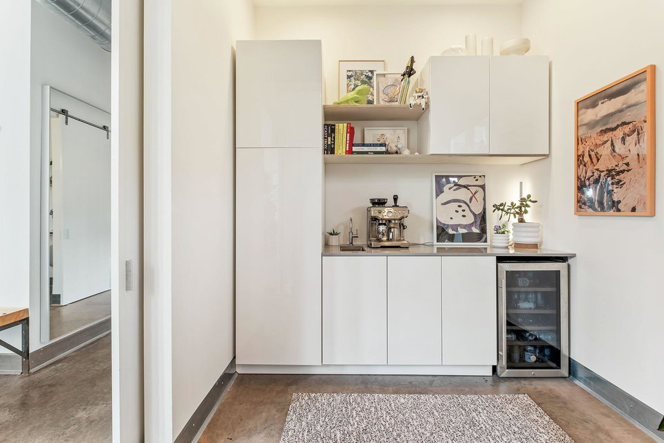 The kitchen features twenty foot ceilings, a living plant wall, and a flexible kitchenette and coffee bar adjoining a tucked away office or creative studio.