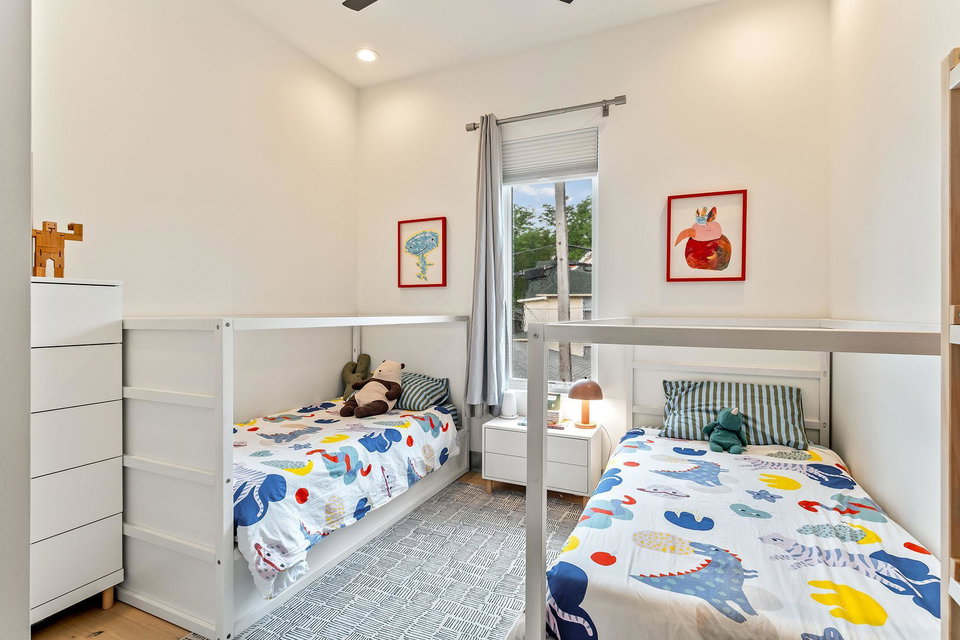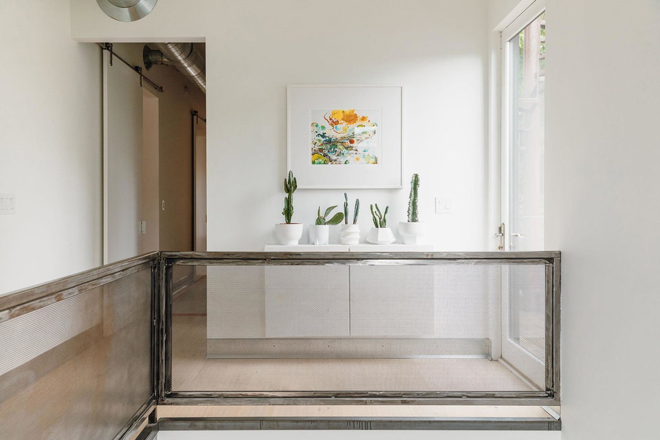 Take the custom steel and white oak staircase to the upper level, where three bedrooms showcase custom closets, white oak floors, galvanized steel baseboards, and eight foot doors. The full bath features a deep soaking tub and laundry nearby for convenience.
