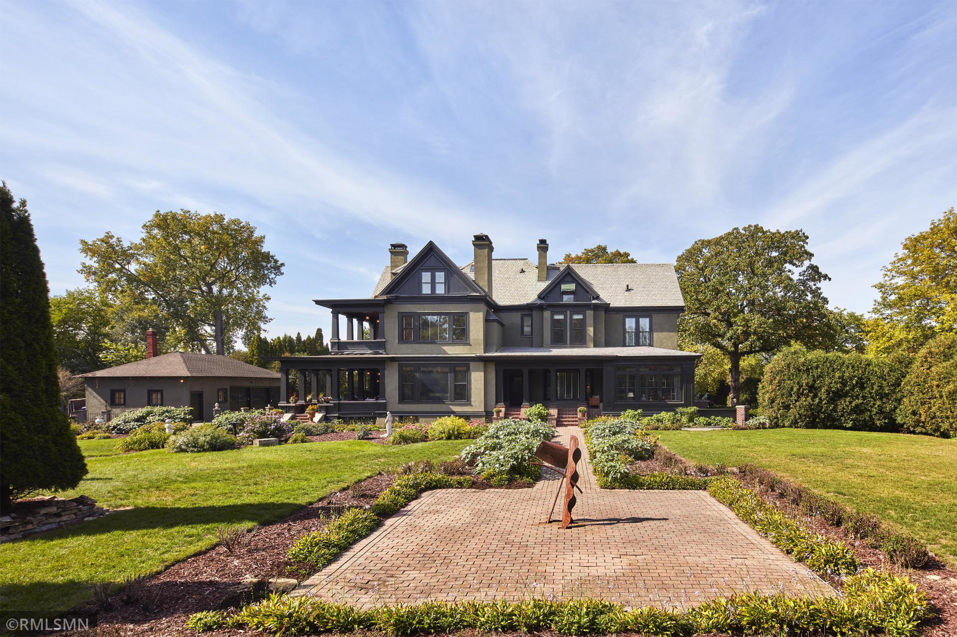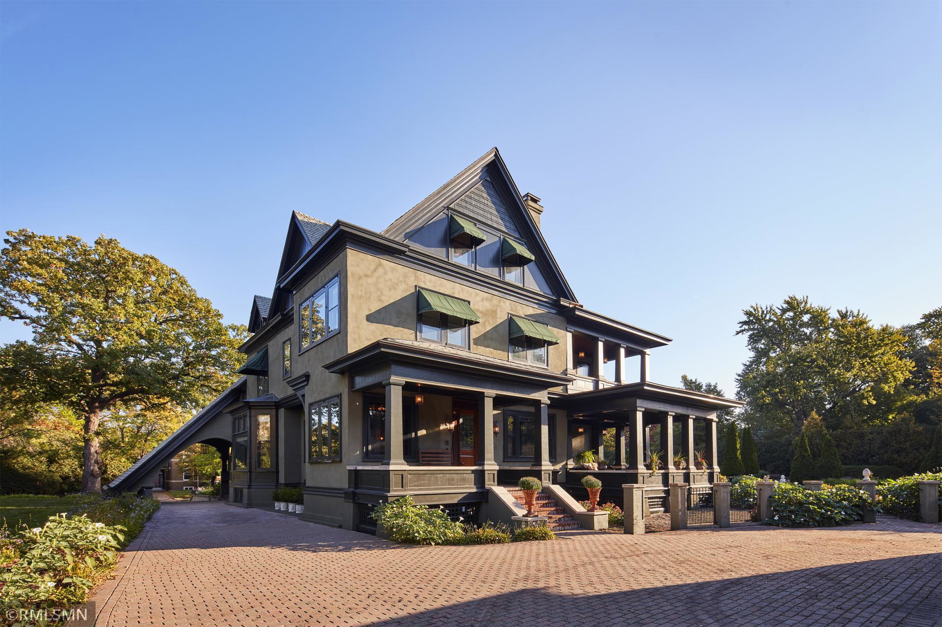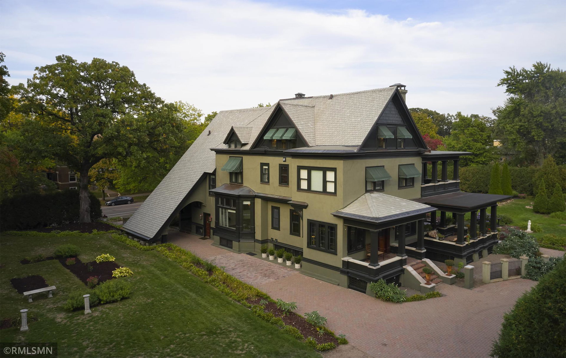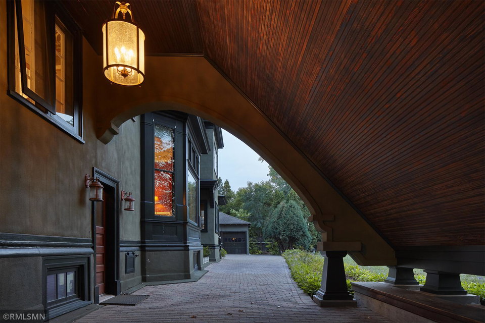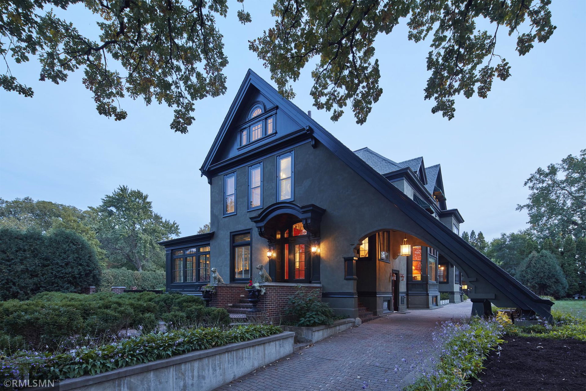 An Eclectic English Country Manor house, with architectural influences spanning the Arts & Crafts, Storybook and Victorian styles. Featuring its prominent “cat-slide” porte cochere, this remarkable estate remains one of St Paul’s most recognizable homes. Sitting on just over an acre and comprised of 5 lots on top of Historic Ramsey Hill this romantic home, originally built in 1882, has been expanded, preserved and cherished over the years. At approximately 8,500 finished square feet this 7 bedroom 8 bathroom home is both grand and comfortable. With 10 foot ceilings and abundant natural light, the layout is compelling and full of delights such as built-in cabinets, bay windows, ornamental carved plaster ceilings, six fireplaces, and numerous porches looking out upon the surrounding formal gardens. The third floor has 2 apartments, perfect for guests or tenants. The garden level contains a gym, a cedar sauna and steam shower and yet another apartment.