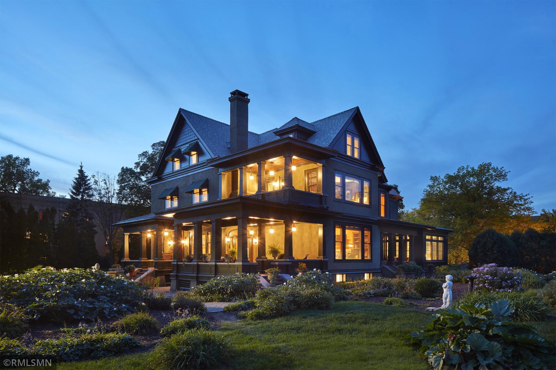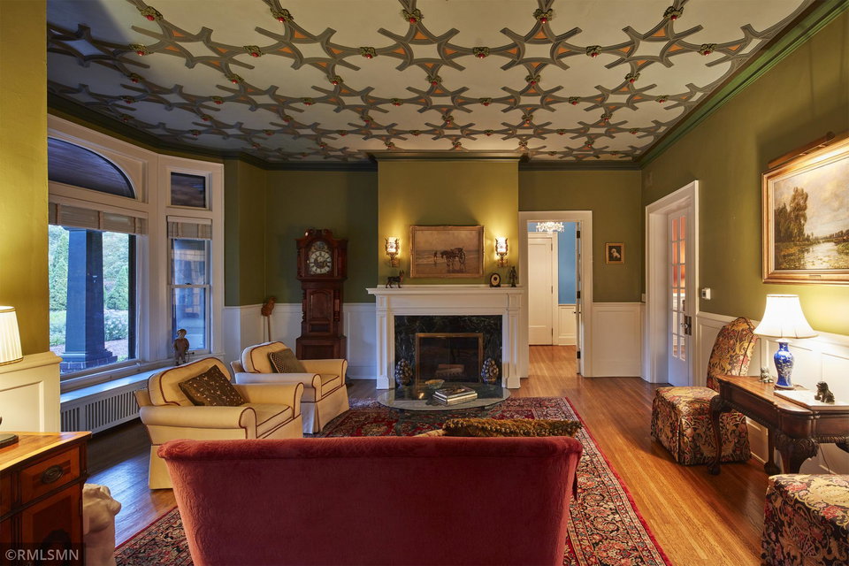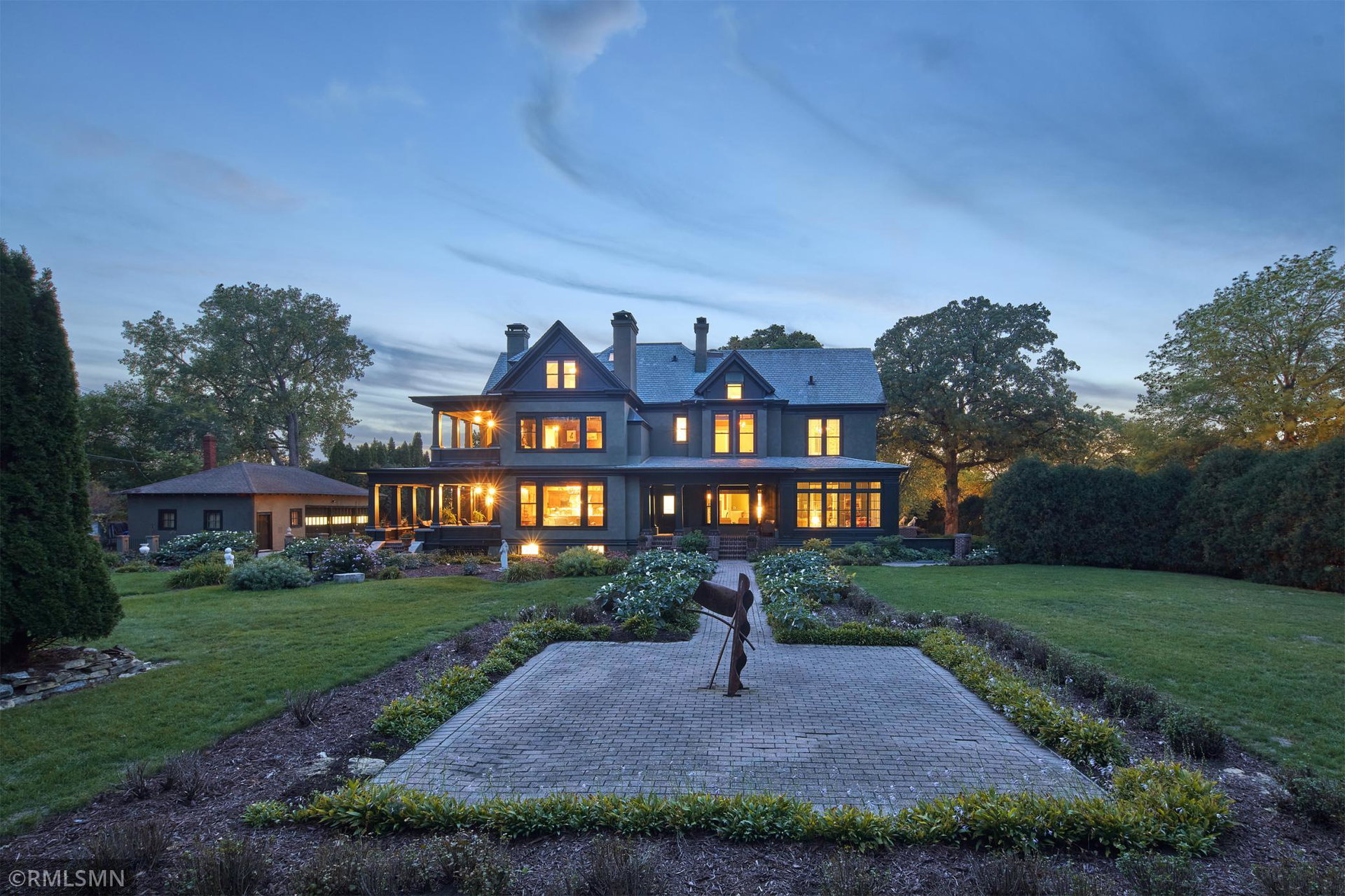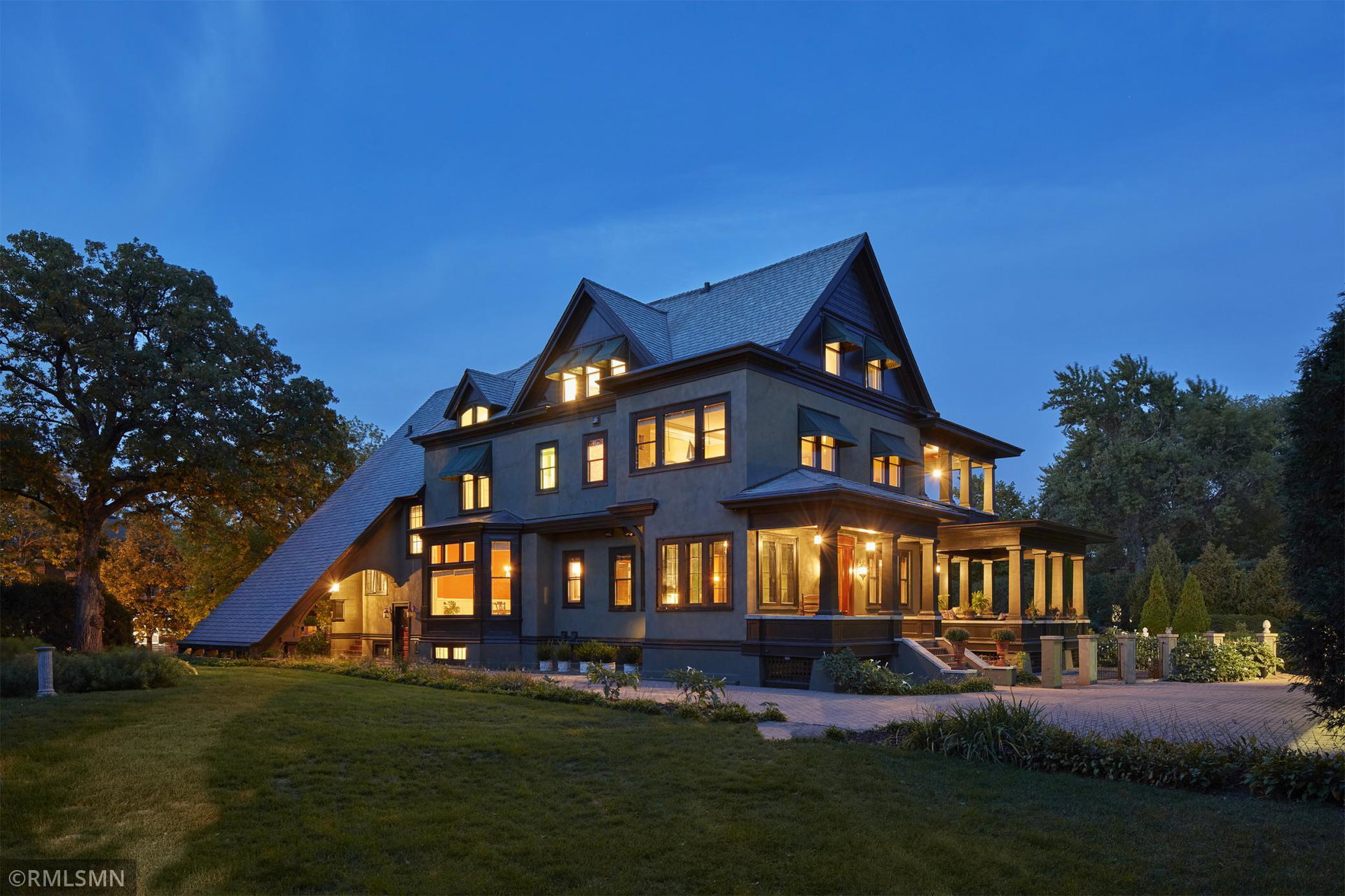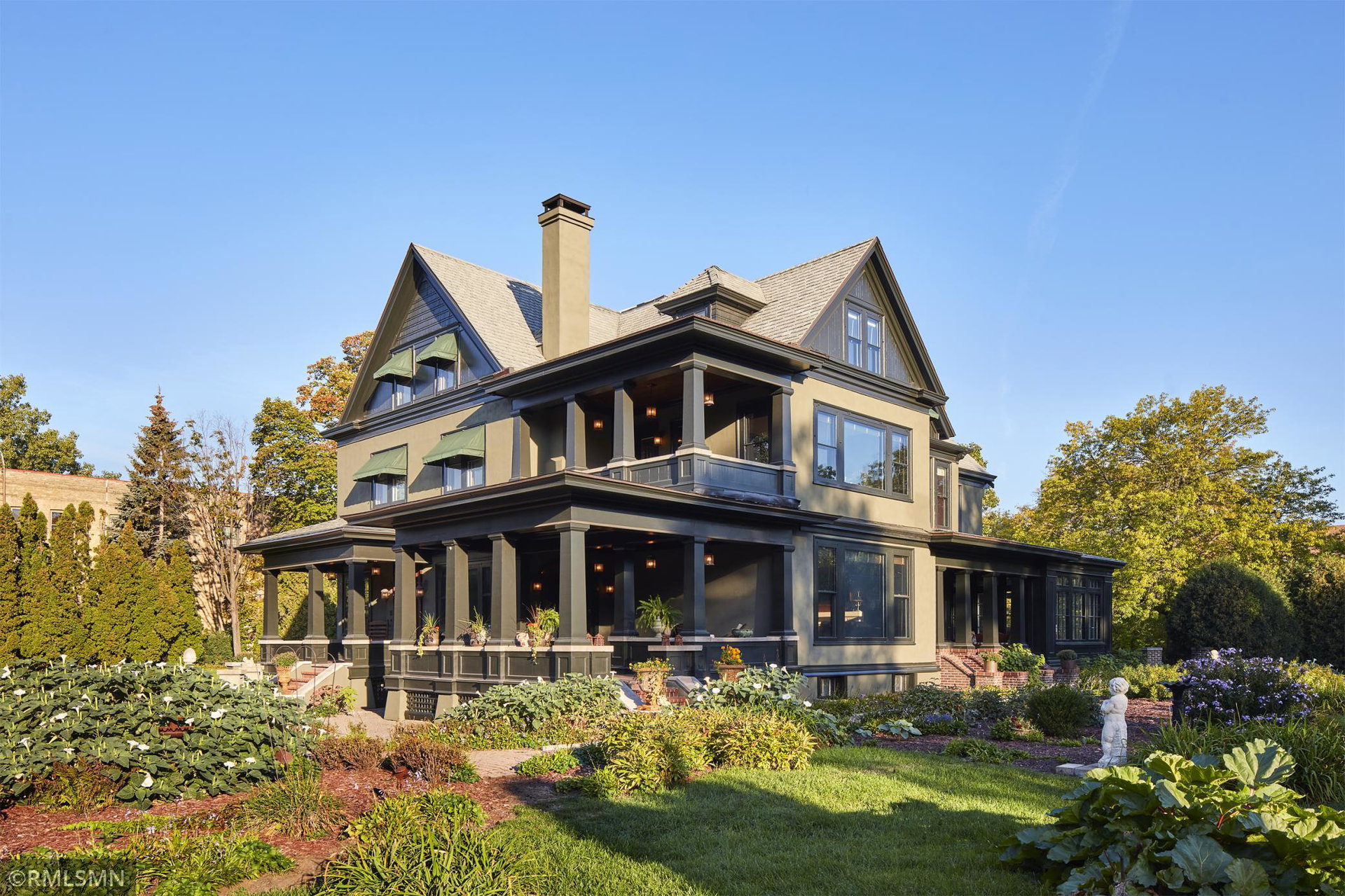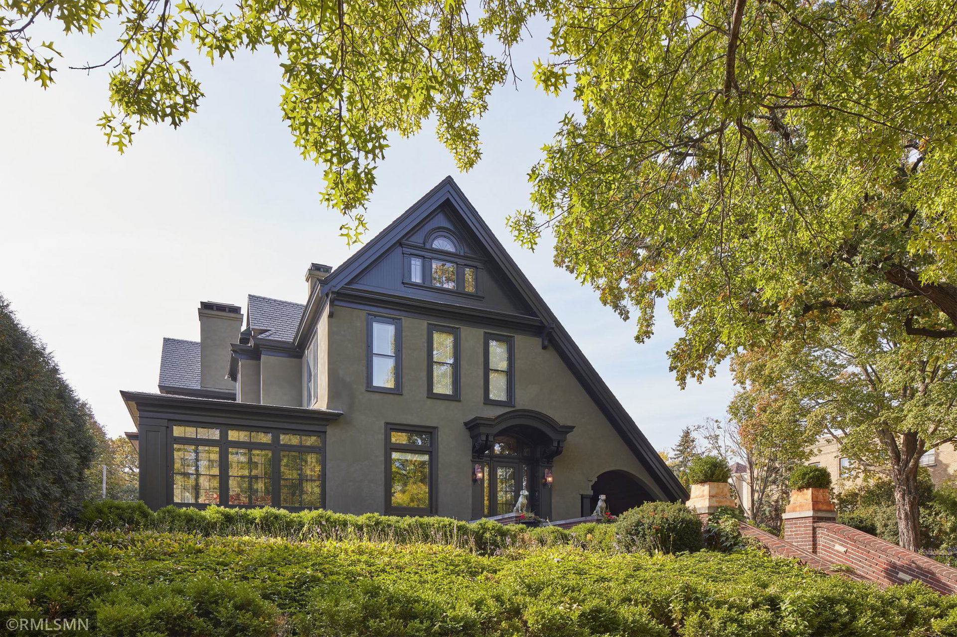 An Eclectic English Country Manor house, with architectural influences spanning the Arts & Crafts, Storybook and Victorian styles. Featuring its prominent “cat-slide” porte cochere, this remarkable estate remains one of St Paul’s most recognizable homes. Sitting on just over an acre and comprised of 5 lots on top of Historic Ramsey Hill this romantic home, originally built in 1882, has been expanded, preserved and cherished over the years. At approximately 8,500 finished square feet this 7 bedroom 8 bathroom home is both grand and comfortable. With 10 foot ceilings and abundant natural light, the layout is compelling and full of delights such as built-in cabinets, bay windows, ornamental carved plaster ceilings, six fireplaces, and numerous porches looking out upon the surrounding formal gardens. The third floor has 2 apartments, perfect for guests or tenants. The garden level contains a gym, a cedar sauna and steam shower and yet another apartment.