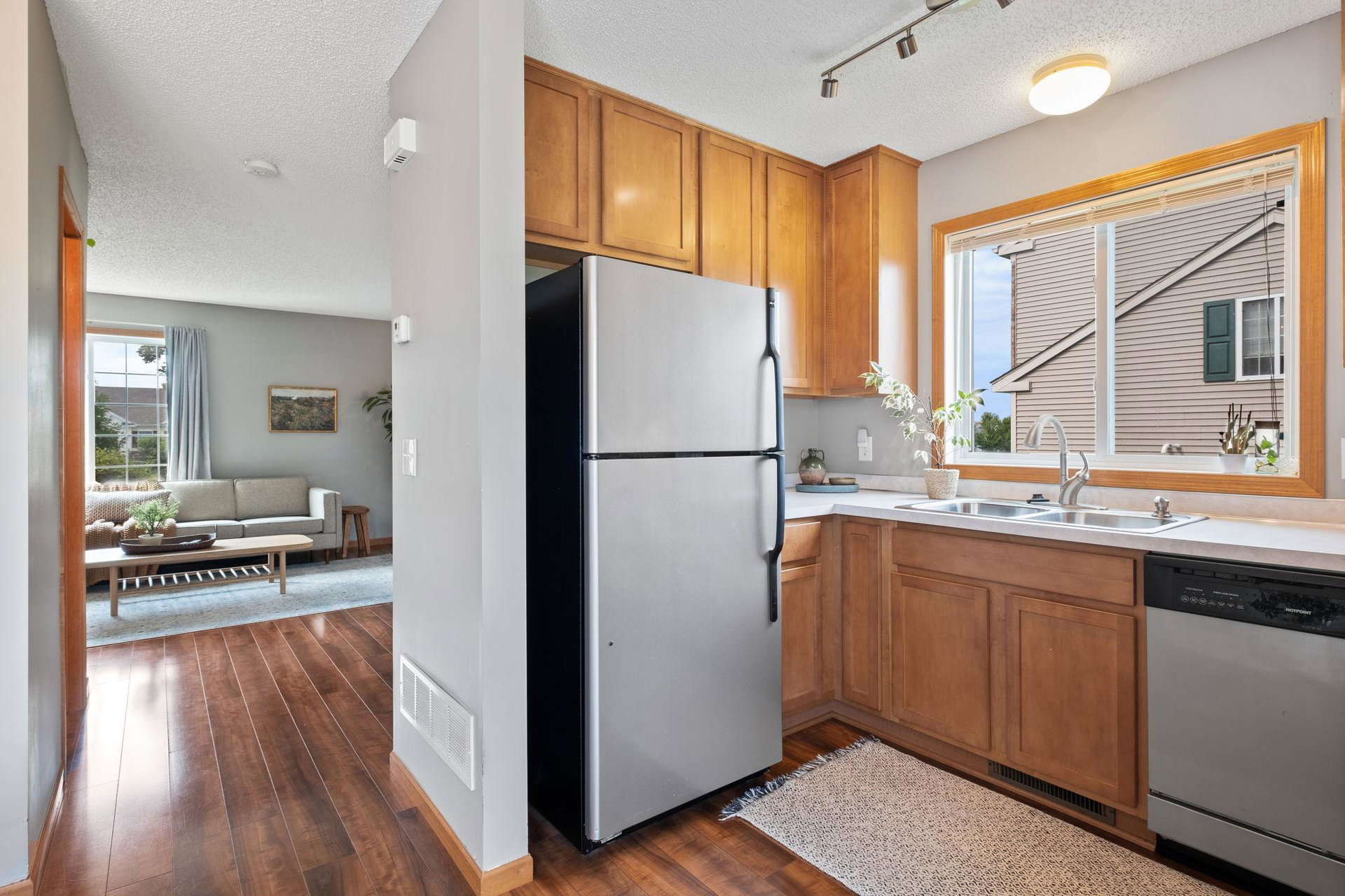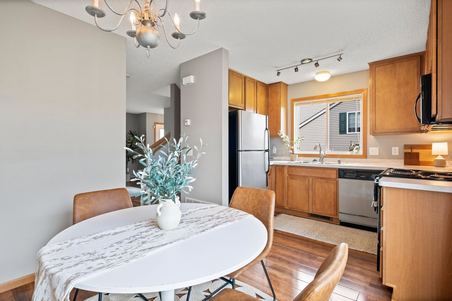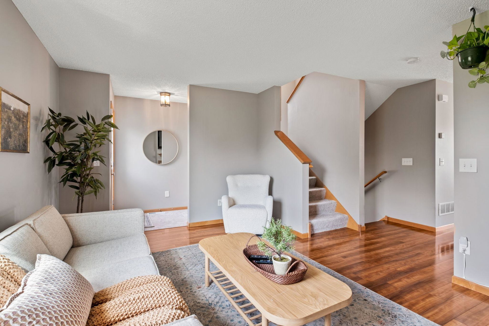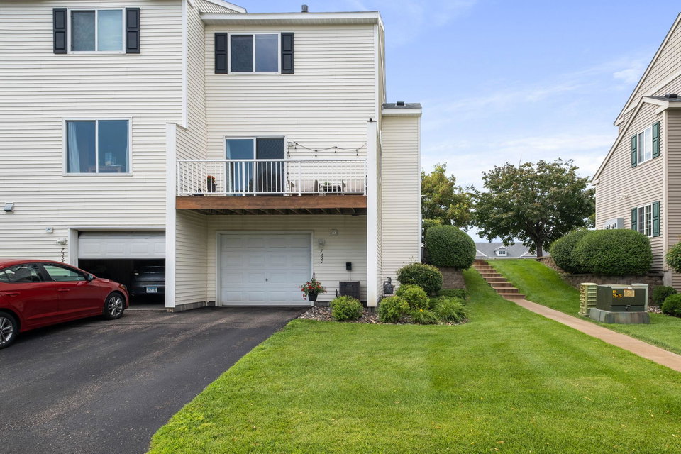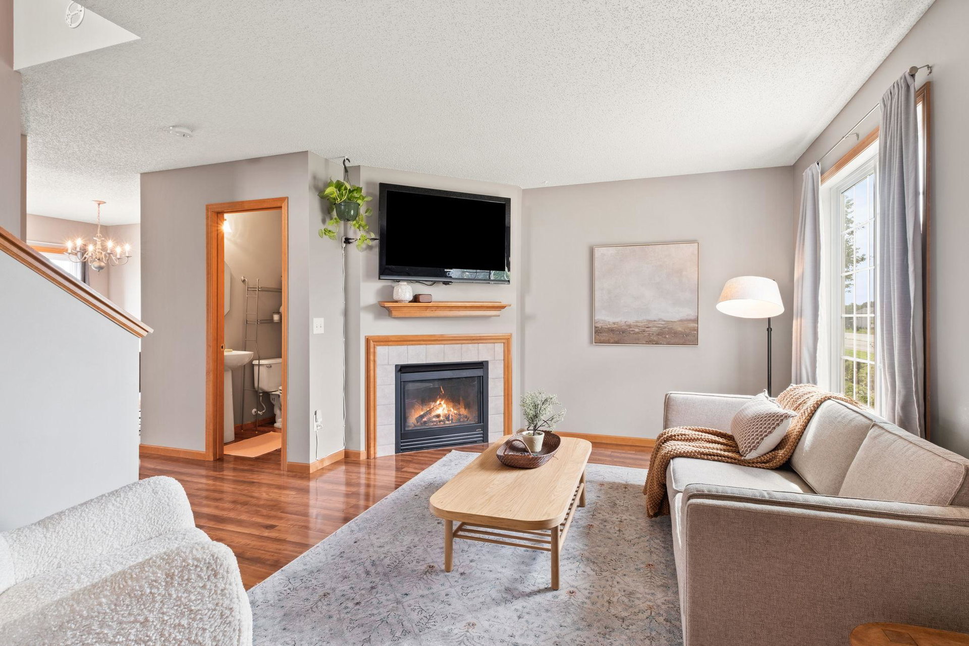 Wonderful end-unit townhouse that has been meticulously maintained + is move-in ready! The main floor boasts beautiful hard surface flooring, a spacious living room with gas fireplace, half-bathroom, and bright, open kitchen with dining area and deck. Upstairs you will find 2 light filled bedrooms, both with generous closet space, a full bathroom, and laundry room. A tuck-under garage, utility room, and large storage room complete the lower level. Close proximity to parks, trails, the NorthStar commuter rail, and Highway 10. Don’t miss this adorable townhome in Town Center Gardens, it won’t last long!