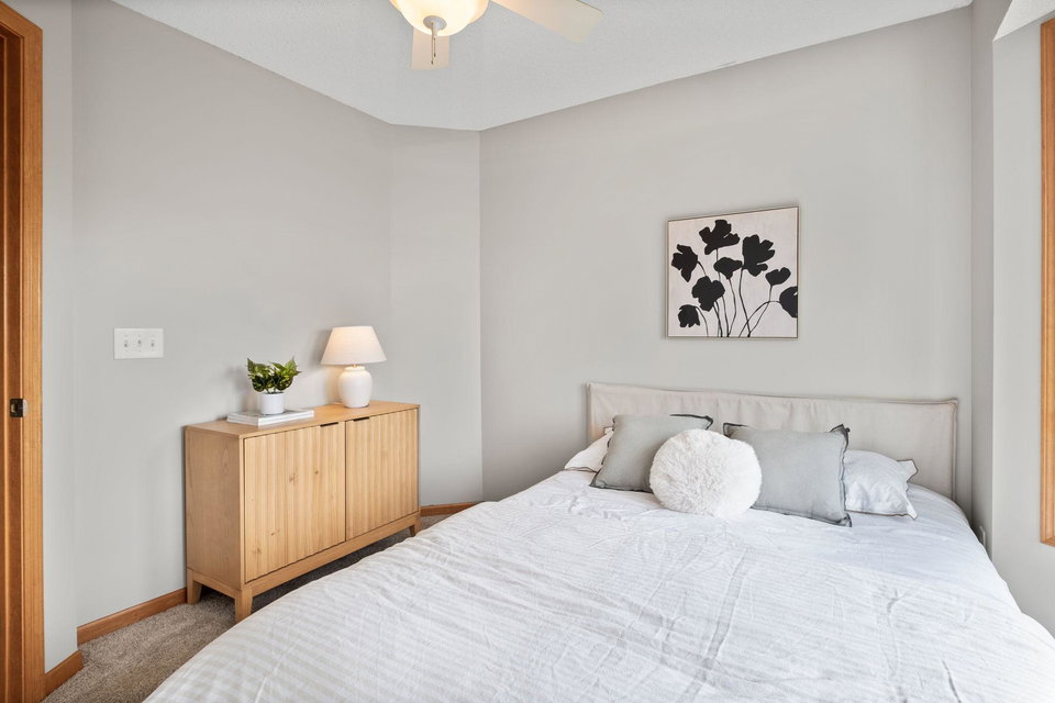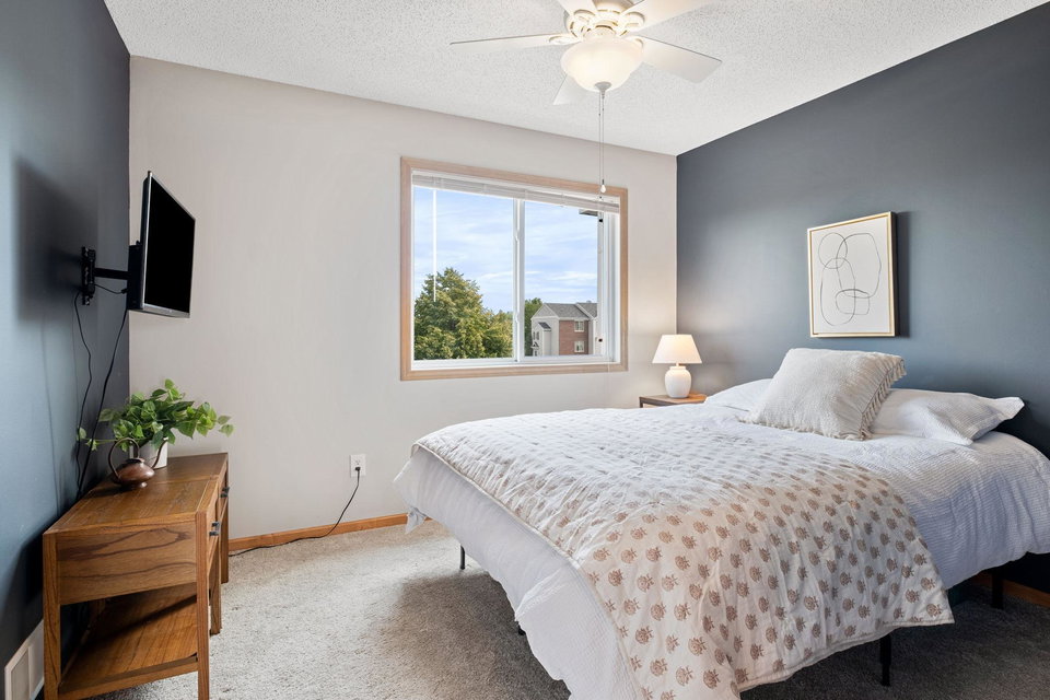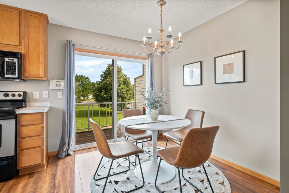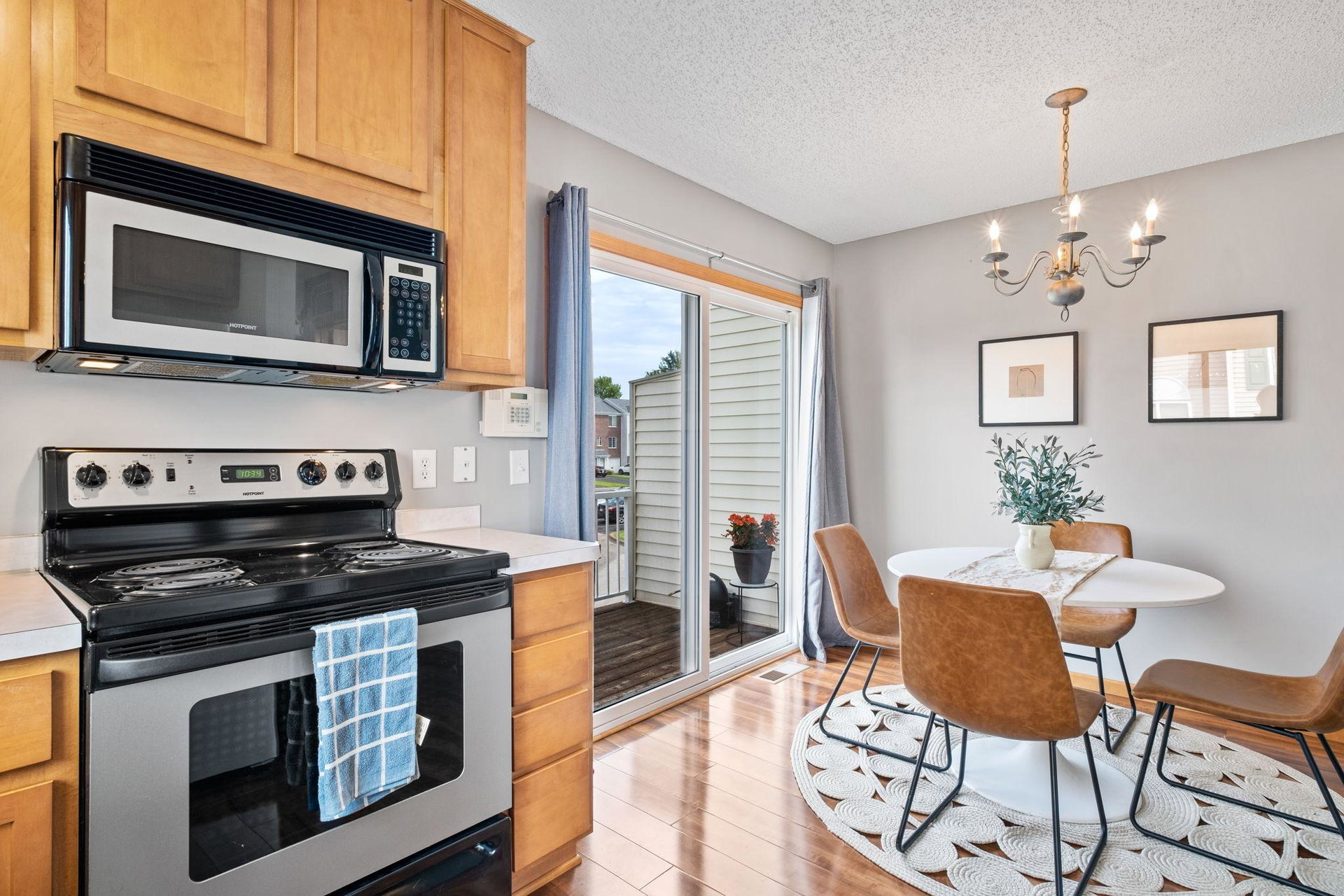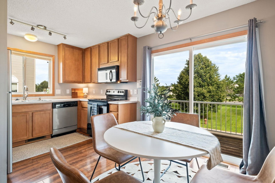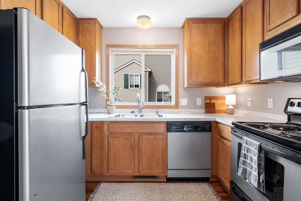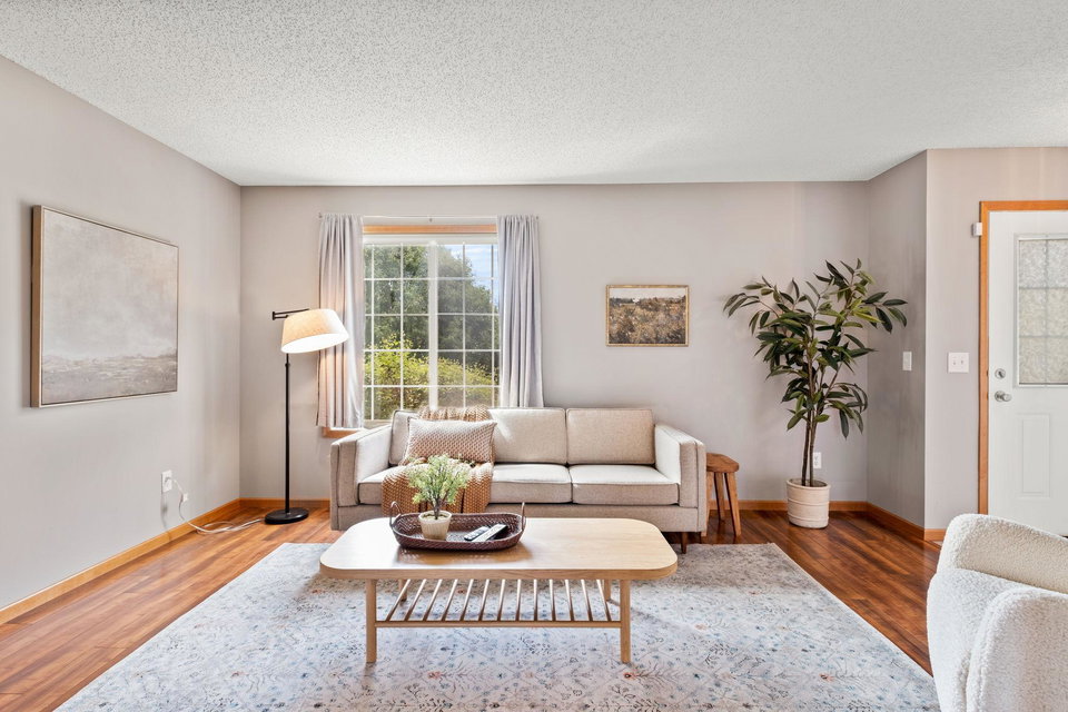 Wonderful end-unit townhouse that has been meticulously maintained + is move-in ready! The main floor boasts beautiful hard surface flooring, a spacious living room with gas fireplace, half-bathroom, and bright, open kitchen with dining area and deck. Upstairs you will find 2 light filled bedrooms, both with generous closet space, a full bathroom, and laundry room. A tuck-under garage, utility room, and large storage room complete the lower level. Close proximity to parks, trails, the NorthStar commuter rail, and Highway 10. Don’t miss this adorable townhome in Town Center Gardens, it won’t last long!