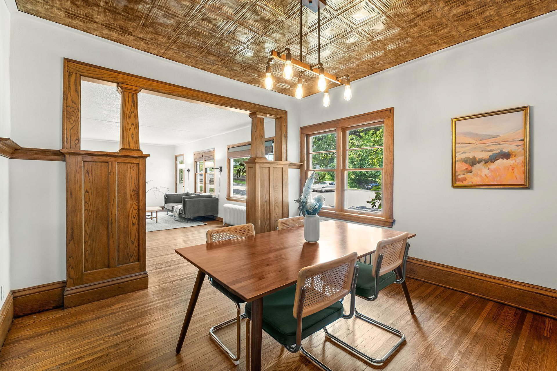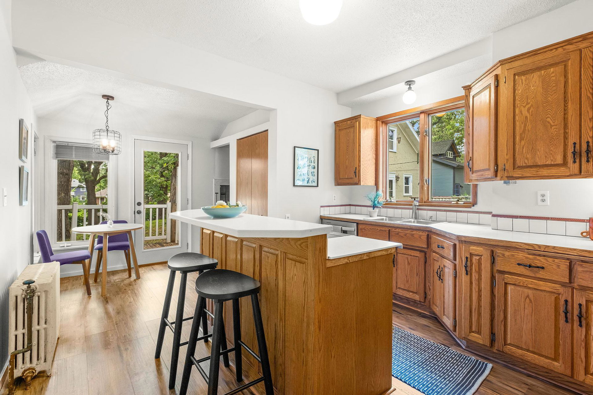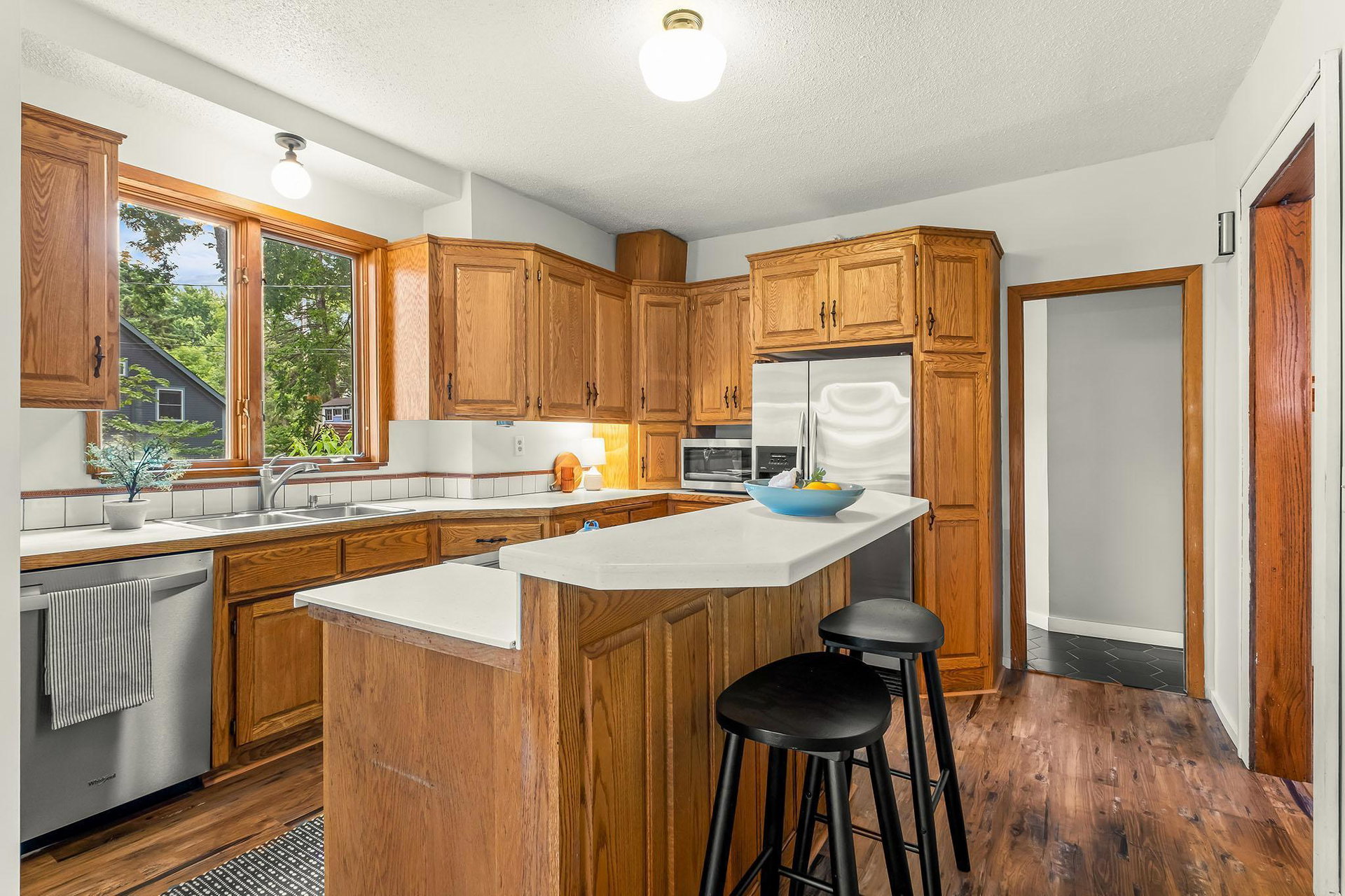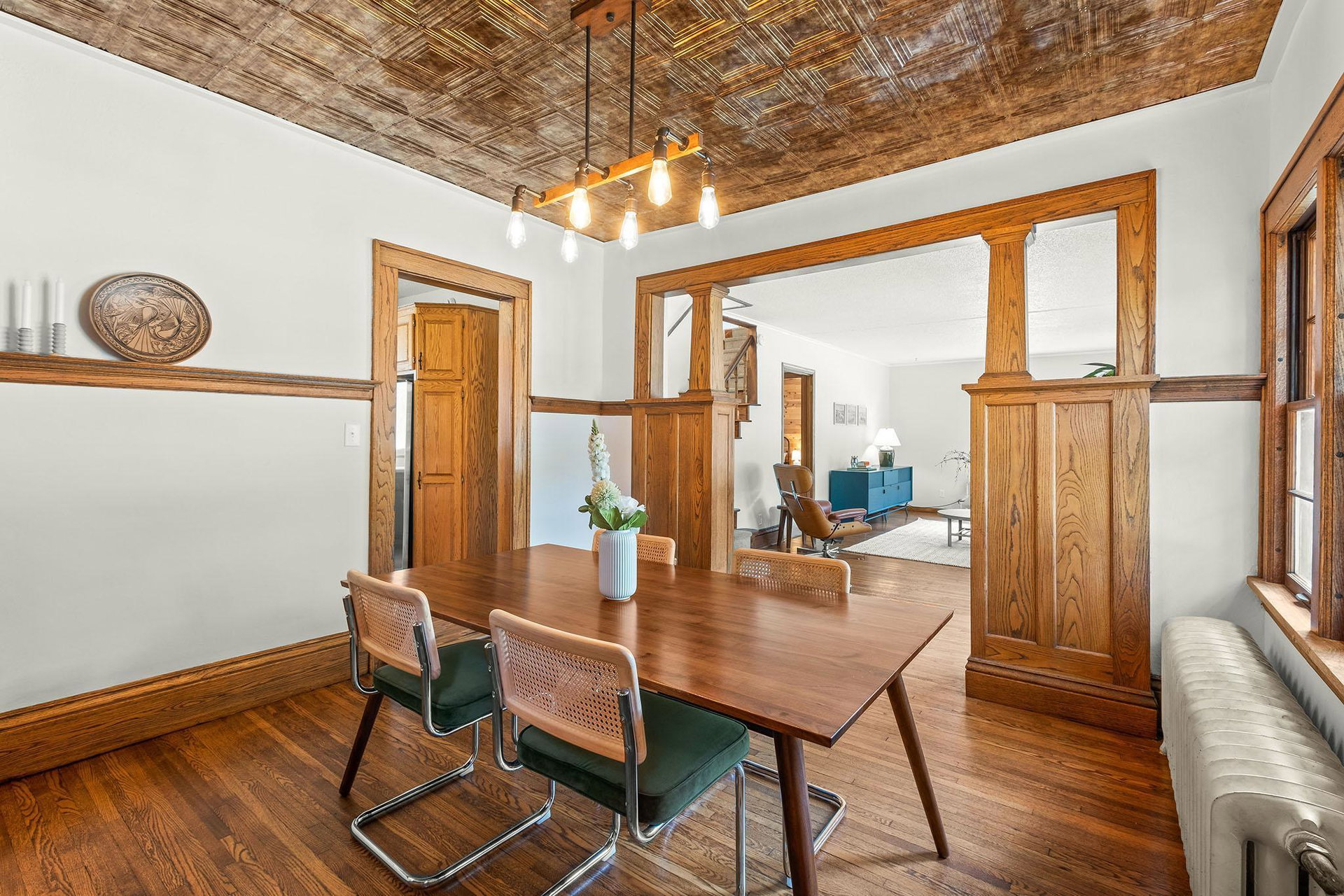 Multiple offers received – All offers are due by 9am on Saturday 7/12. Step inside this 3 bedroom, 2 bath, 1.5 story Craftsman home in the Hamline-Midway neighborhood!! The main floor welcomes with an expansive living room bookended by a gorgeous oak built-in offering a stylish separation to the formal dining room, classic to this eras charm. The dining room is anchored by a buffet and includes a stylish copper ceiling. The large kitchen includes a center island as well as an eat-in area, with direct access to your deck. Just off the kitchen, you’ll find a recently renovated full bathroom with sleek finishes. Also on the main floor, is the first bedroom. On the upper level, you’ll find two more bedrooms with dynamic windows inviting light inside as well as the 3/4 bath. Outside, the large, tree-lined lot provides a great setting for relaxation or outdoor gatherings. The oversized two car garage is freshly painted. Enjoy easy access to both downtowns, the river, Como Park, coffee shops, breweries, and more! The roof is brand new!! Come see this one!!