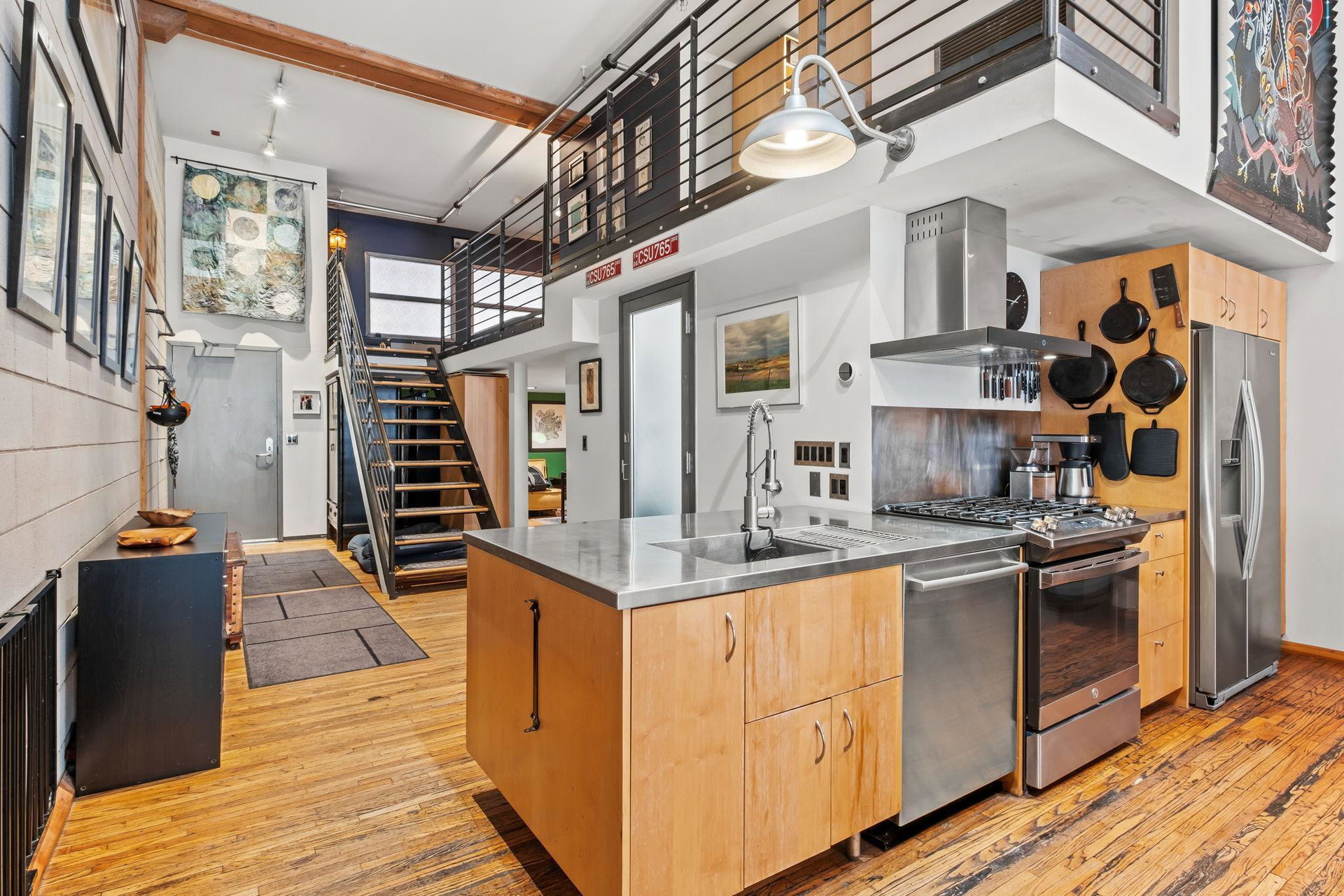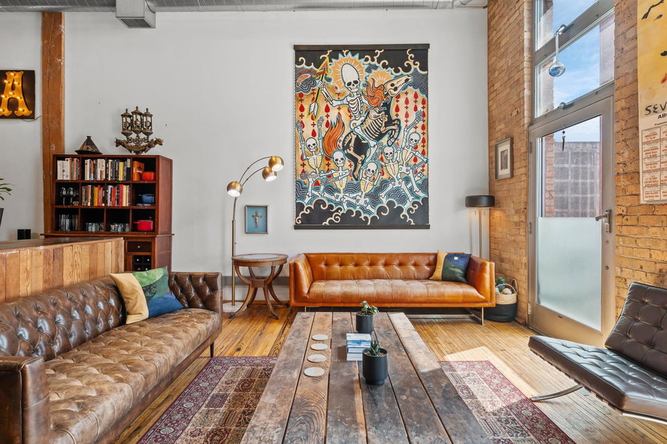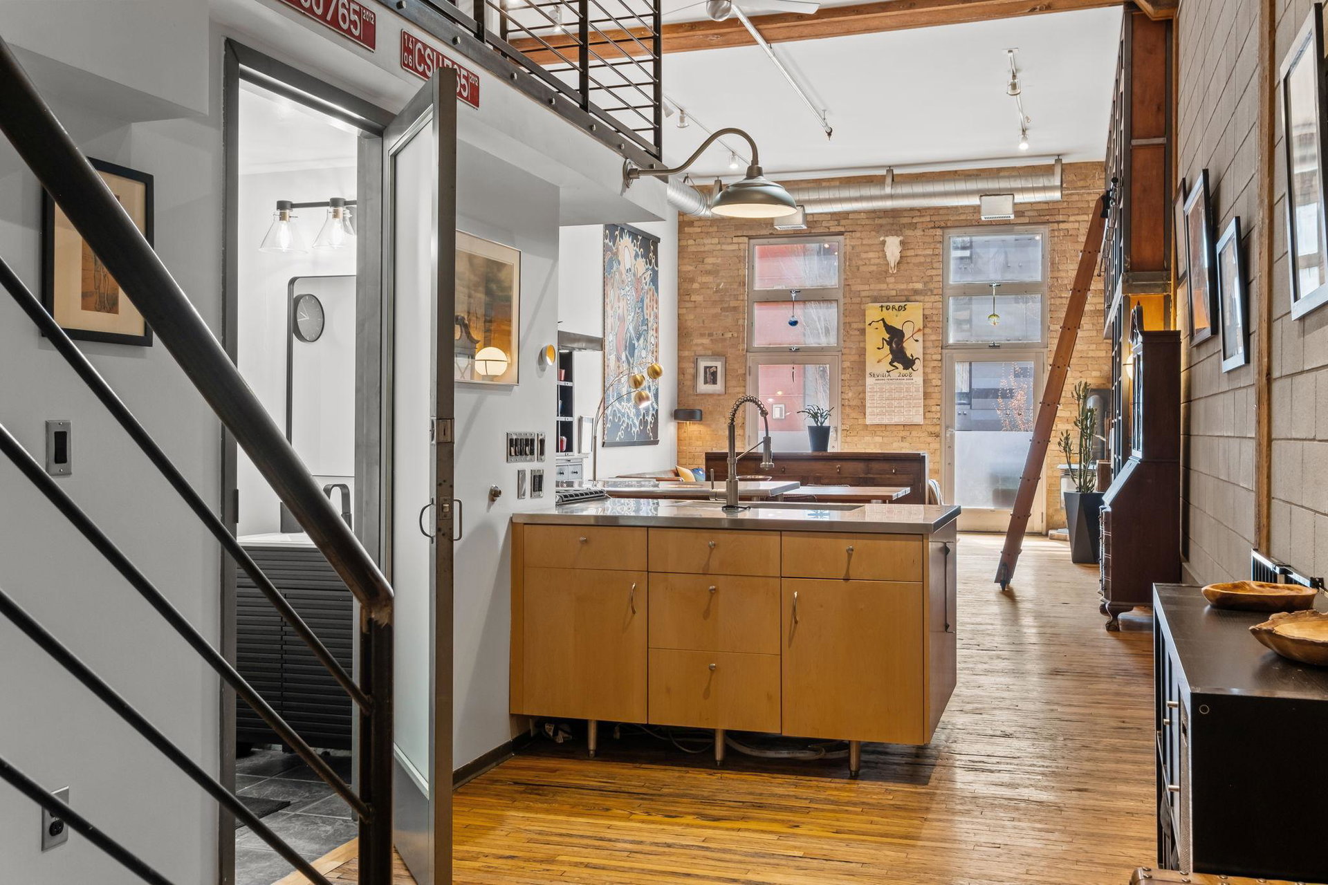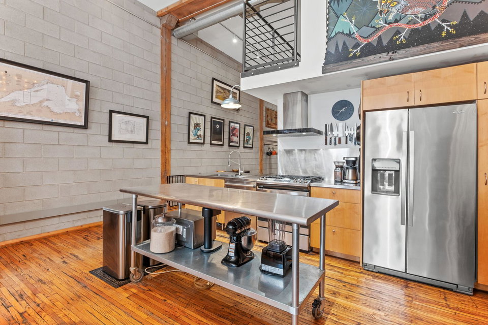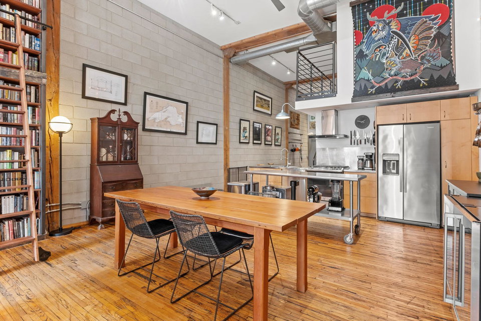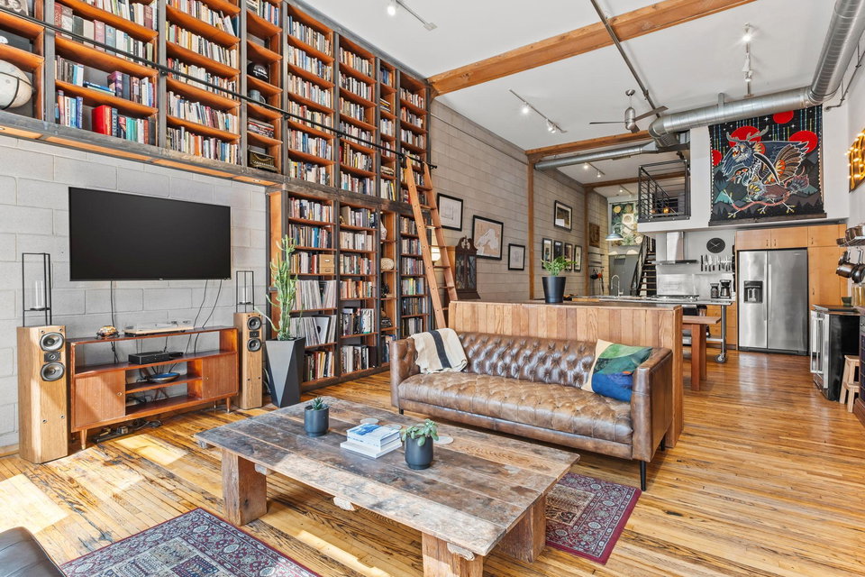 This residence perfectly marries historic industrial character with modern sophistication. Towering 14-foot ceilings and expansive windows bathe the space in natural light, while the open-concept layout effortlessly connects the kitchen, dining, and living areas. Thoughtful design details—like the cozy gas fireplace, dramatic custom built floor-to-ceiling bookshelves, and a private balcony overlooking the garden patio space adds a layer of charm and architectural interest that are truly unique in the city.