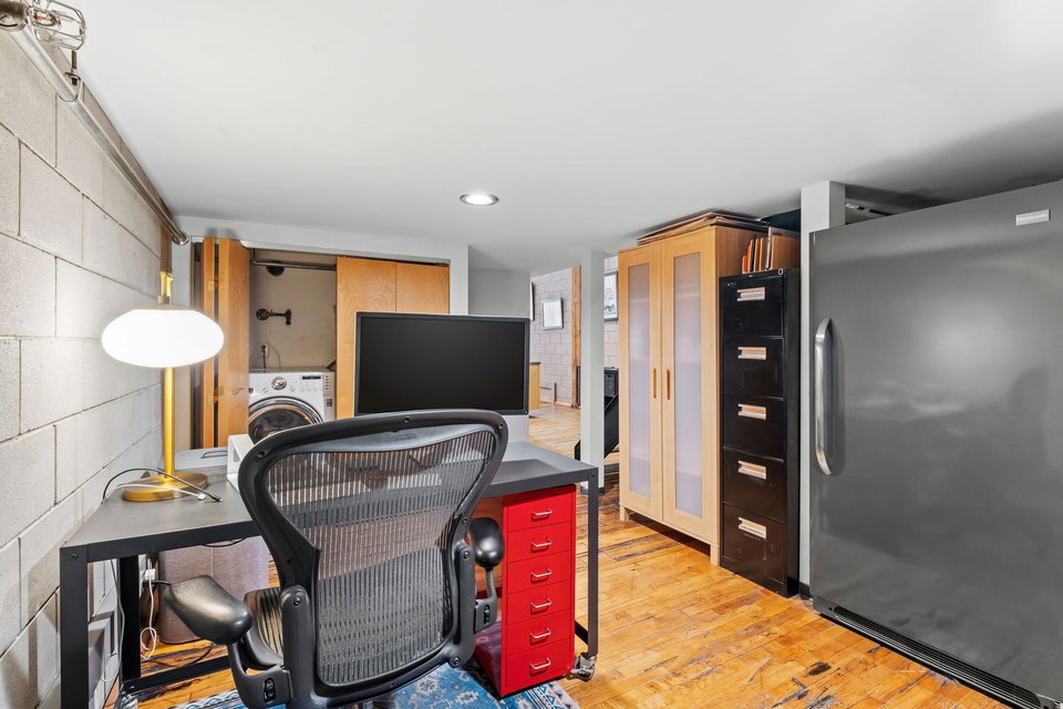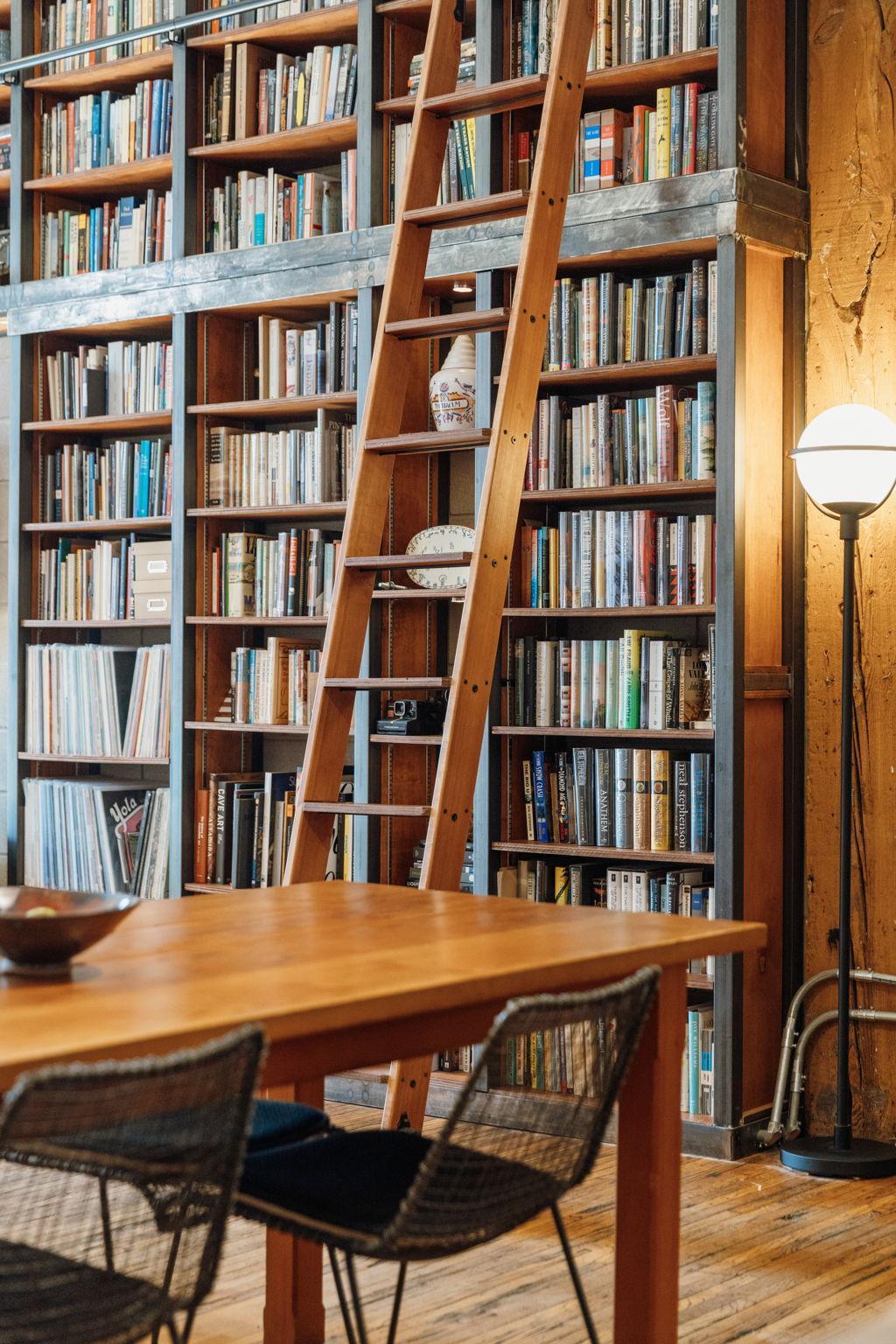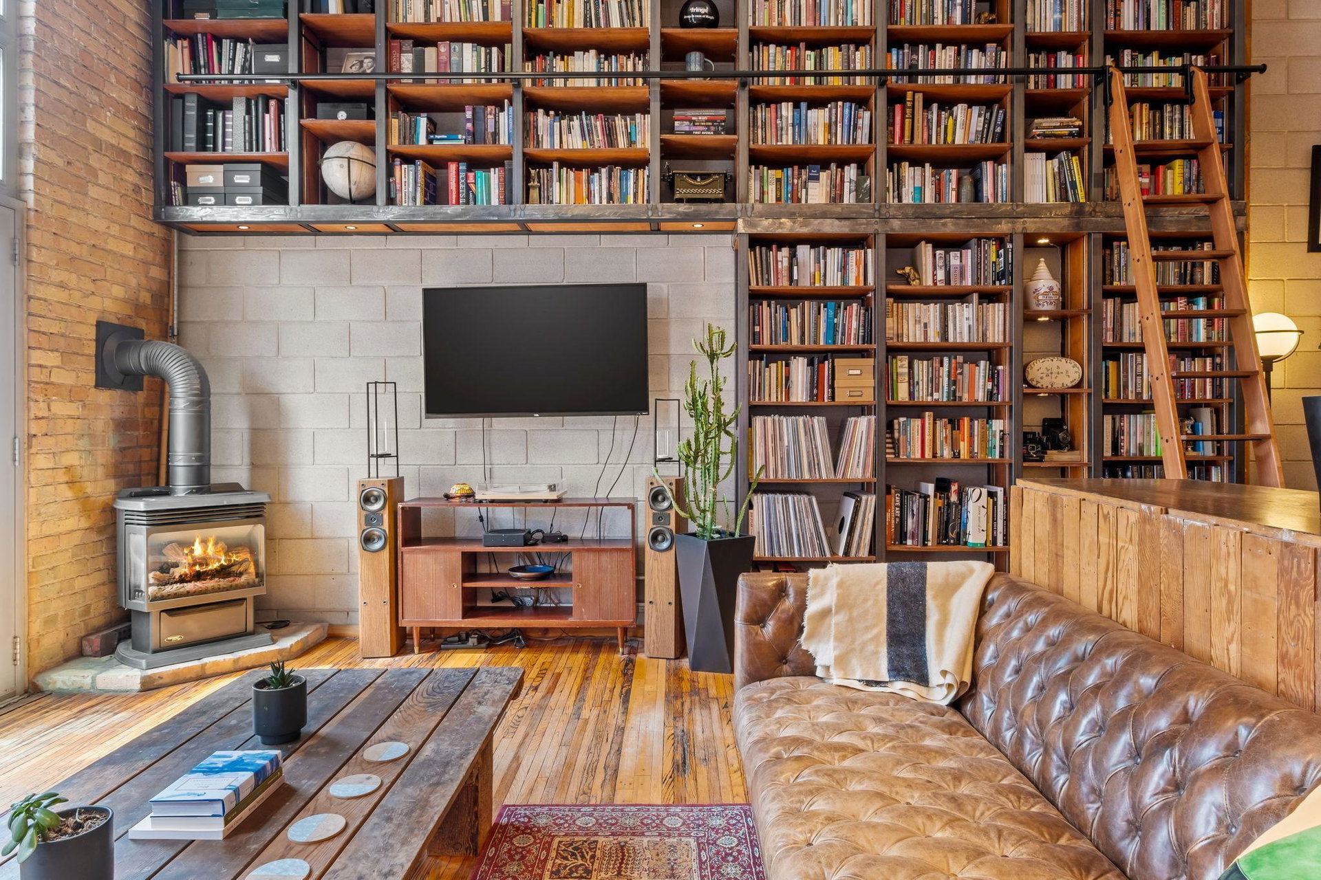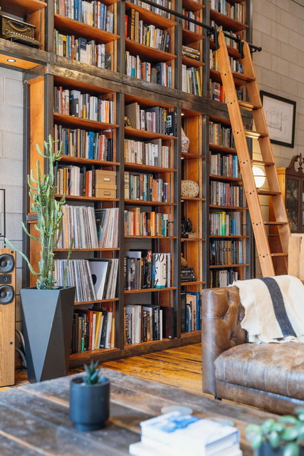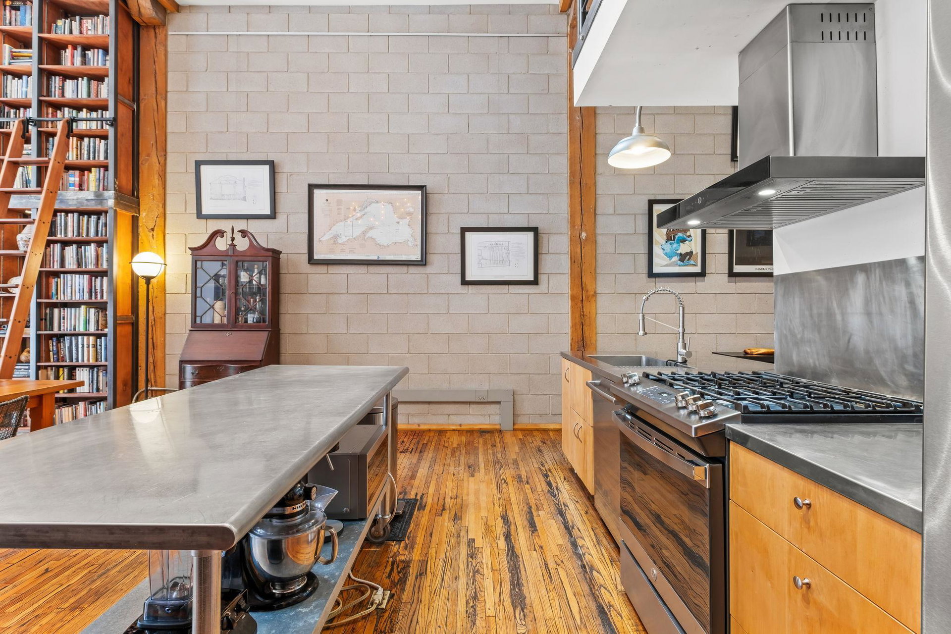 This residence perfectly marries historic industrial character with modern sophistication. Towering 14-foot ceilings and expansive windows bathe the space in natural light, while the open-concept layout effortlessly connects the kitchen, dining, and living areas. Thoughtful design details—like the cozy gas fireplace, dramatic custom built floor-to-ceiling bookshelves, and a private balcony overlooking the garden patio space adds a layer of charm and architectural interest that are truly unique in the city.