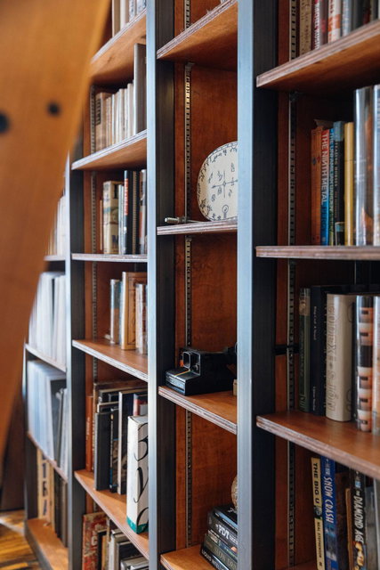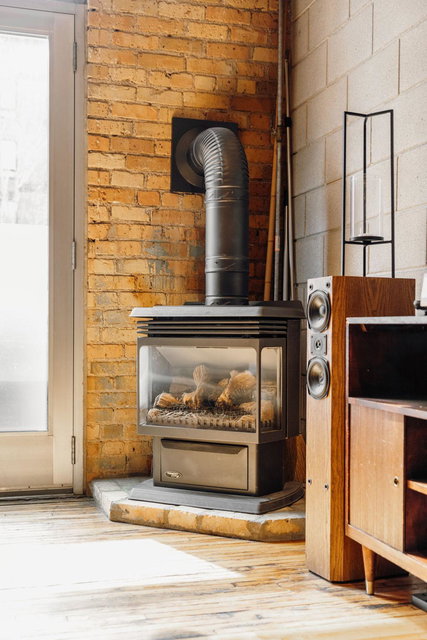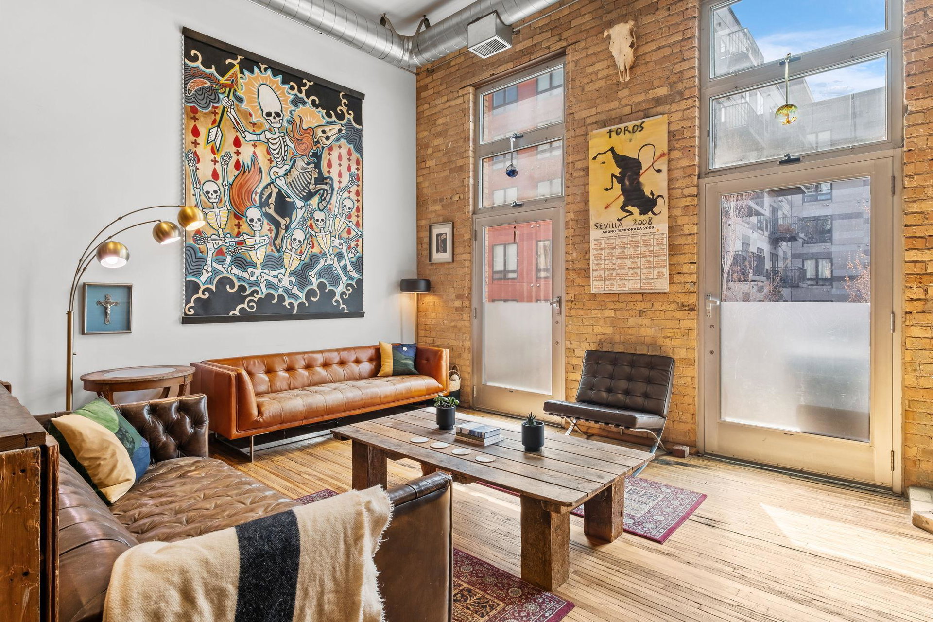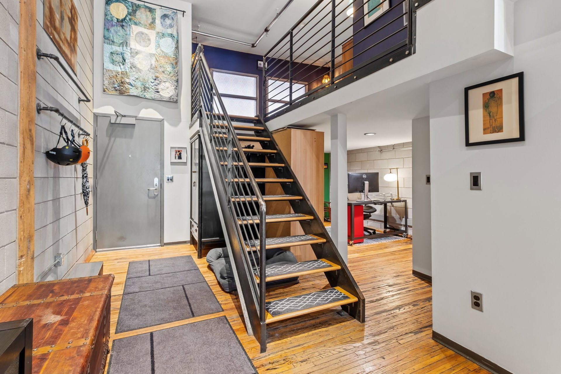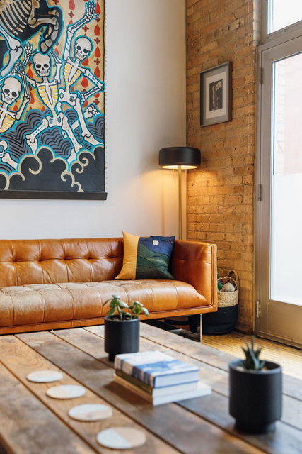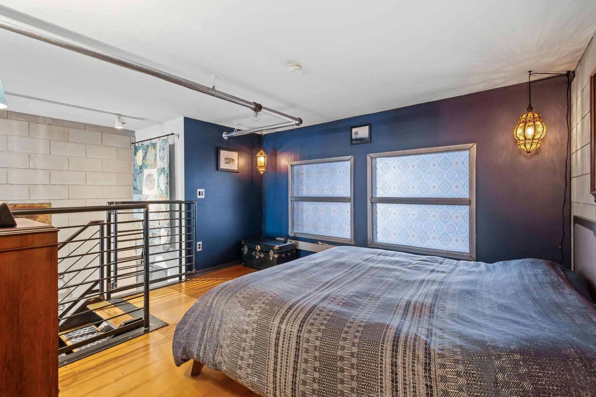 This residence perfectly marries historic industrial character with modern sophistication. Towering 14-foot ceilings and expansive windows bathe the space in natural light, while the open-concept layout effortlessly connects the kitchen, dining, and living areas. Thoughtful design details—like the cozy gas fireplace, dramatic custom built floor-to-ceiling bookshelves, and a private balcony overlooking the garden patio space adds a layer of charm and architectural interest that are truly unique in the city.